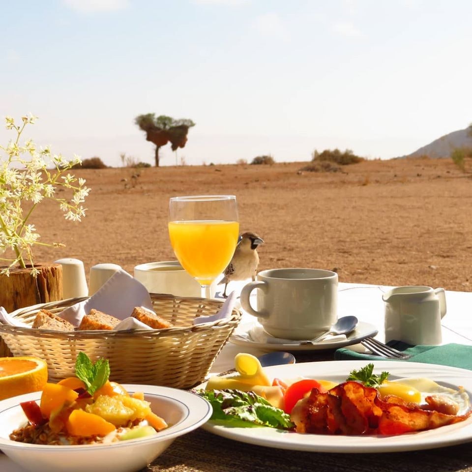 The main lodge building offers a comfortable lounge exhibiting local décor items as well as original paintings, prints and hand-woven carpets from local artists. Traditional meals are served in the open-air restaurant on the verandah or prepared by the chef on an open fire in the lapa, enhancing the feeling of a very special desert evening. The bar, and in winter, the guest lounge with fireplace offer a cosy round-up of a great and adventurous day. Guests can enjoy a refreshing dip in the on-site swimming pool.