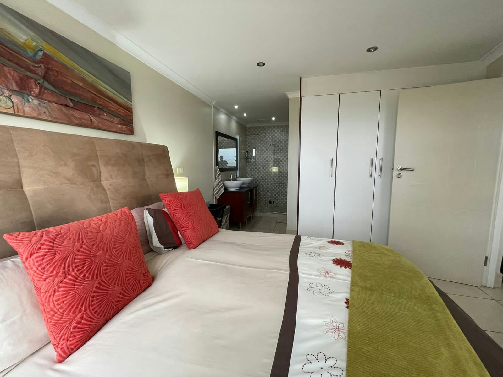 Dié woonstel is op die derde verdieping en beskik oor 2 slaapkamers met slaapplek vir 4. Die hoofslaapkamer het 'n koningingrootte-bed en 'n en suite-badkamer met 'n stort, toilet en wasbak. Die tweede kamer het 2 enkelbeddens en 'n en suite-badkamer met 'n stort, toilet en wasbak. Linne en badhanddoeke word voorsien. Gaste moet asb. hulle eie swemhanddoeke saambring.
