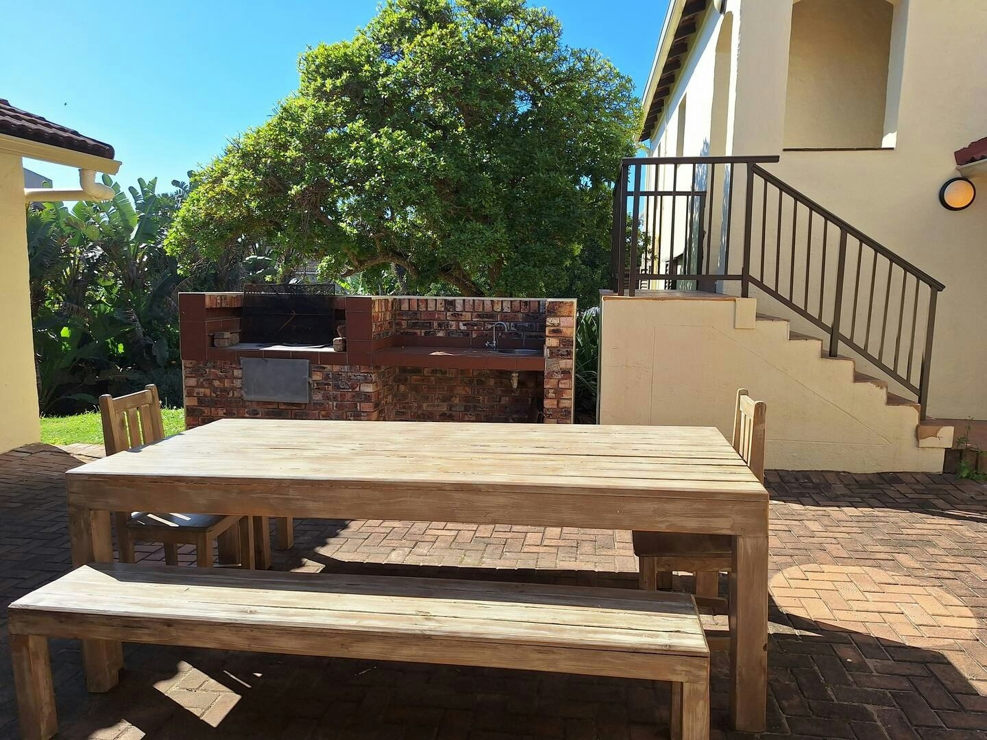 Die eiendom spog ook met 2 buitebraai-areas, ideaal om ontspanne aande in die vars kuslug te geniet. Die ruim, omheinde tuin bied 'n veilige en oop ruimte vir kinders om rond te hardloop, krieket te speel of 'n potjie frisbee te geniet na 'n prettige dag op die strand.