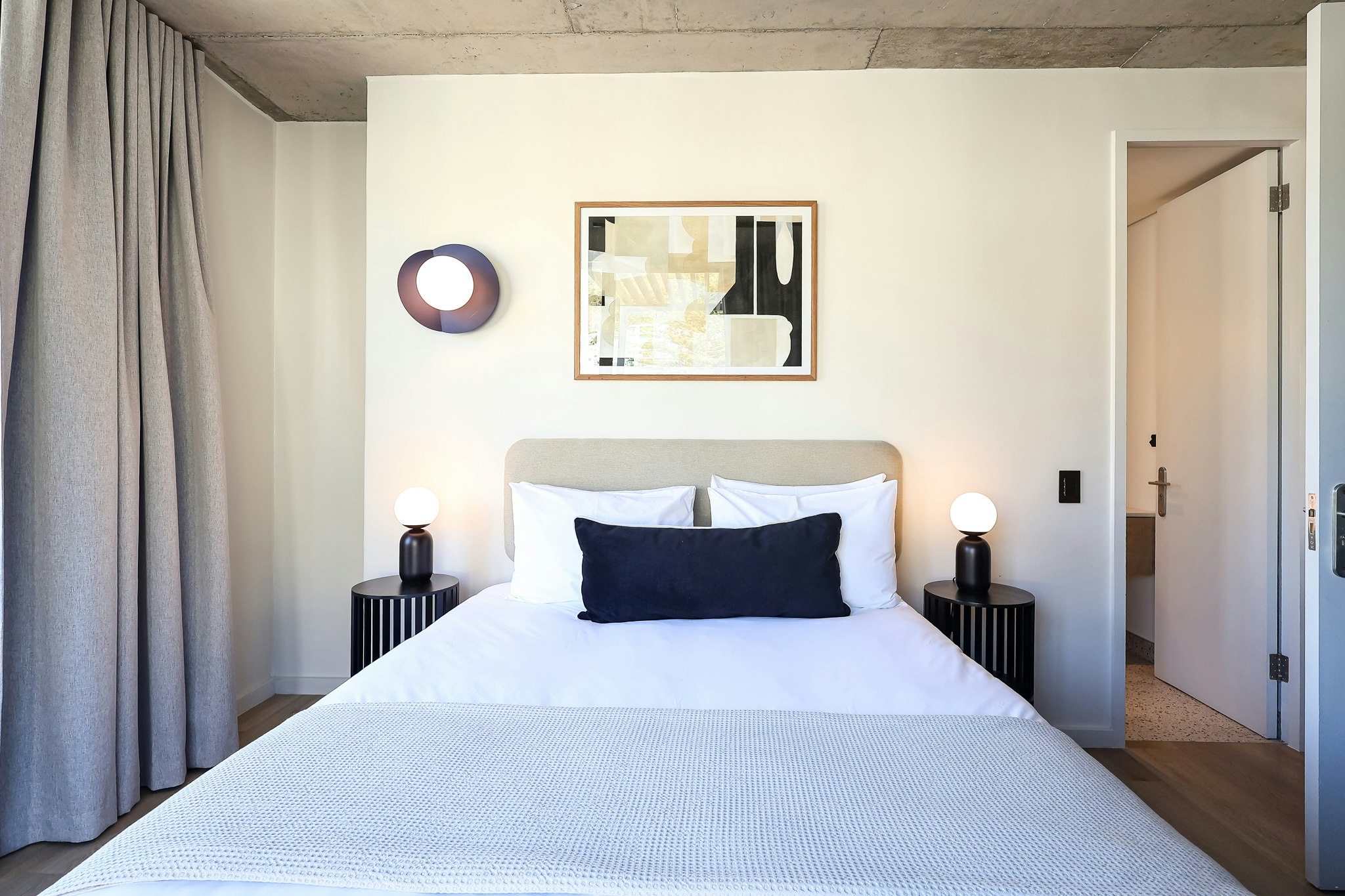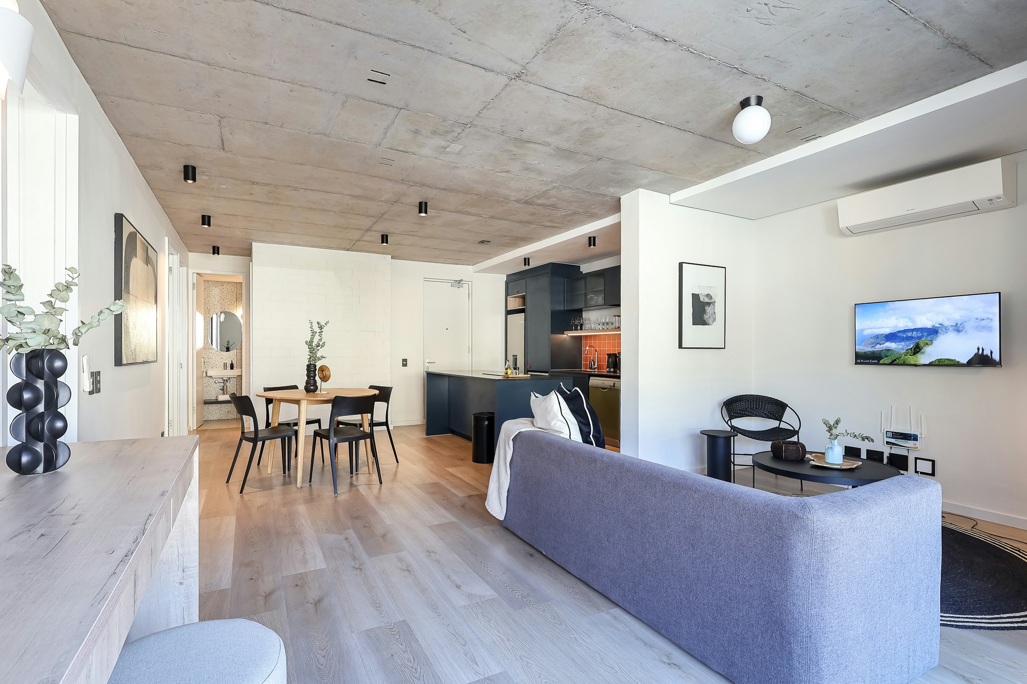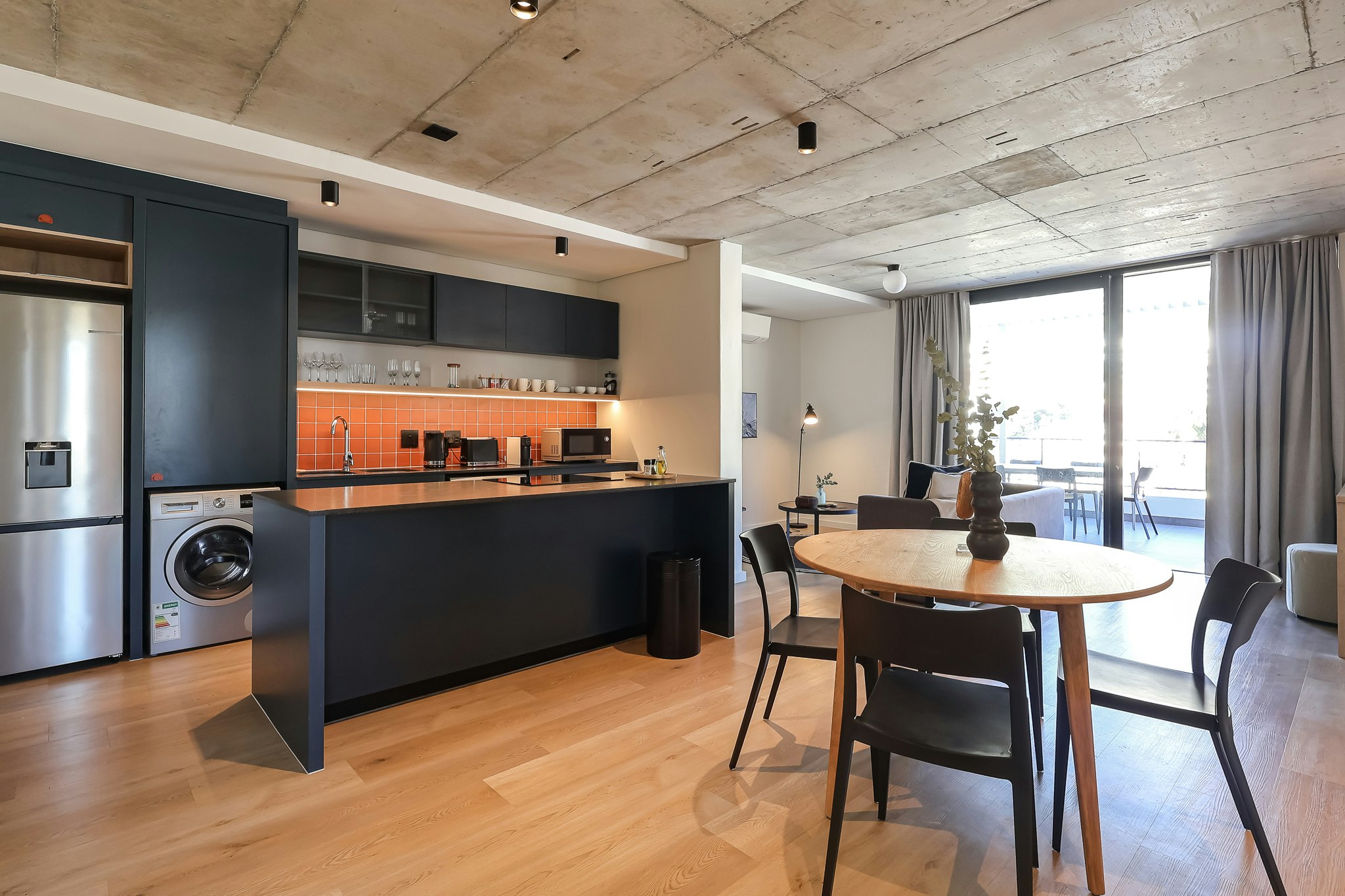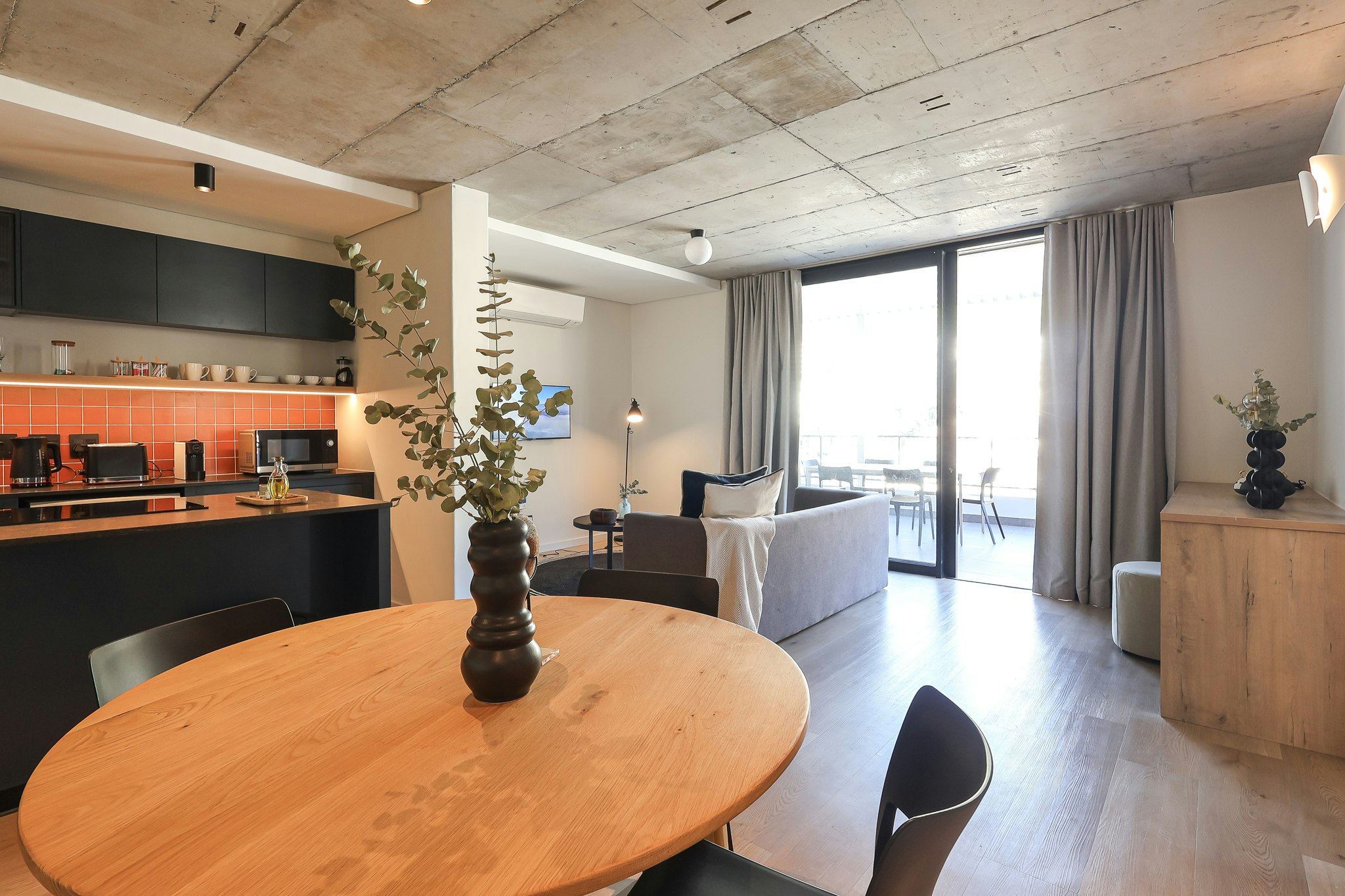 Die leefarea lei na 'n ruim balkon met buitesitplek en berguitsigte. Gaste het eksklusiewe toegang tot premium geriewe, insluitend selfbedieningswasserye, 'n dakswembad met 'n ontspanningsarea, werkruimtes en verwelkomende gemeenskaplike ruimtes wat perfek is vir sosialisering en ontspanning.