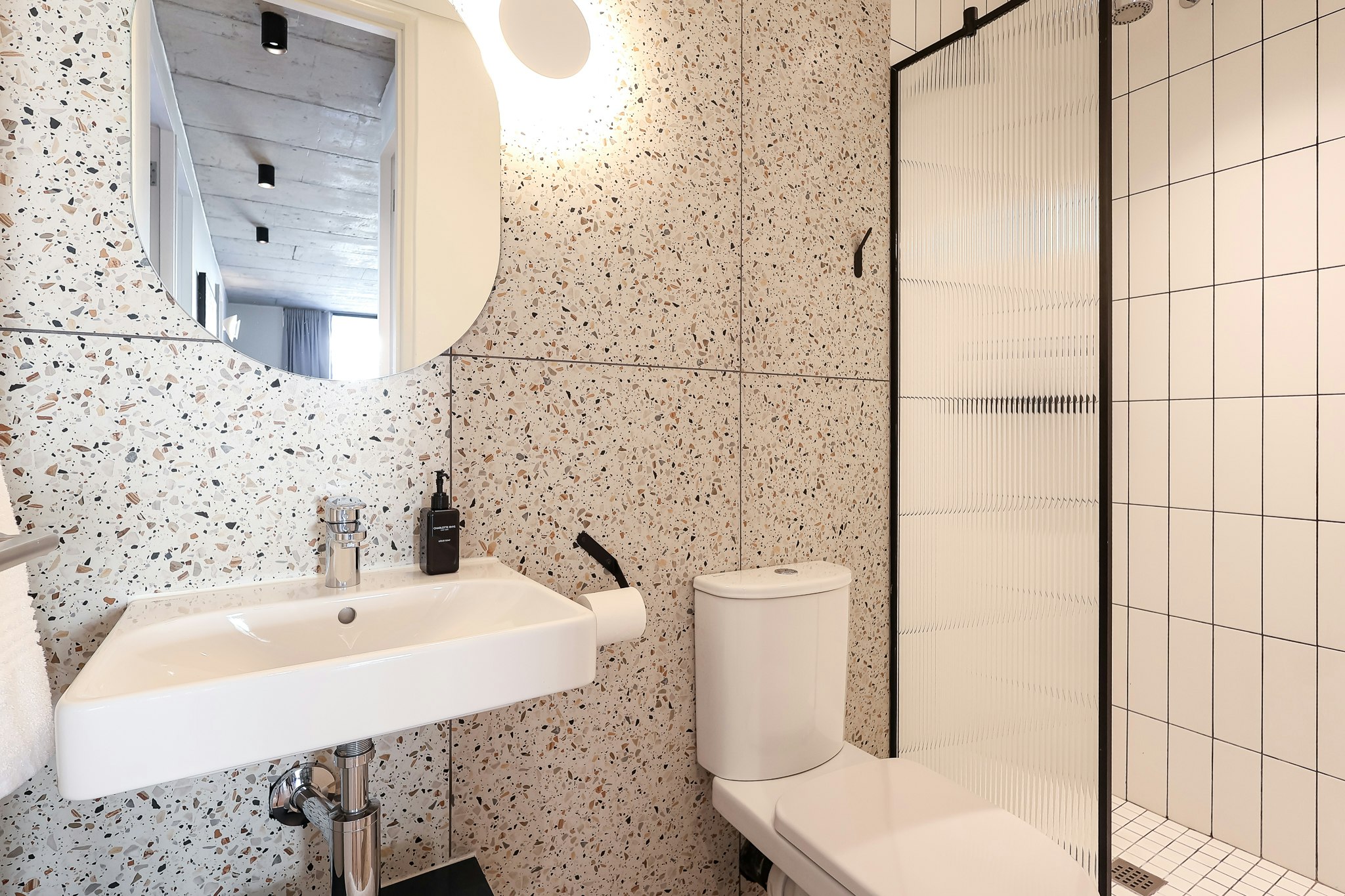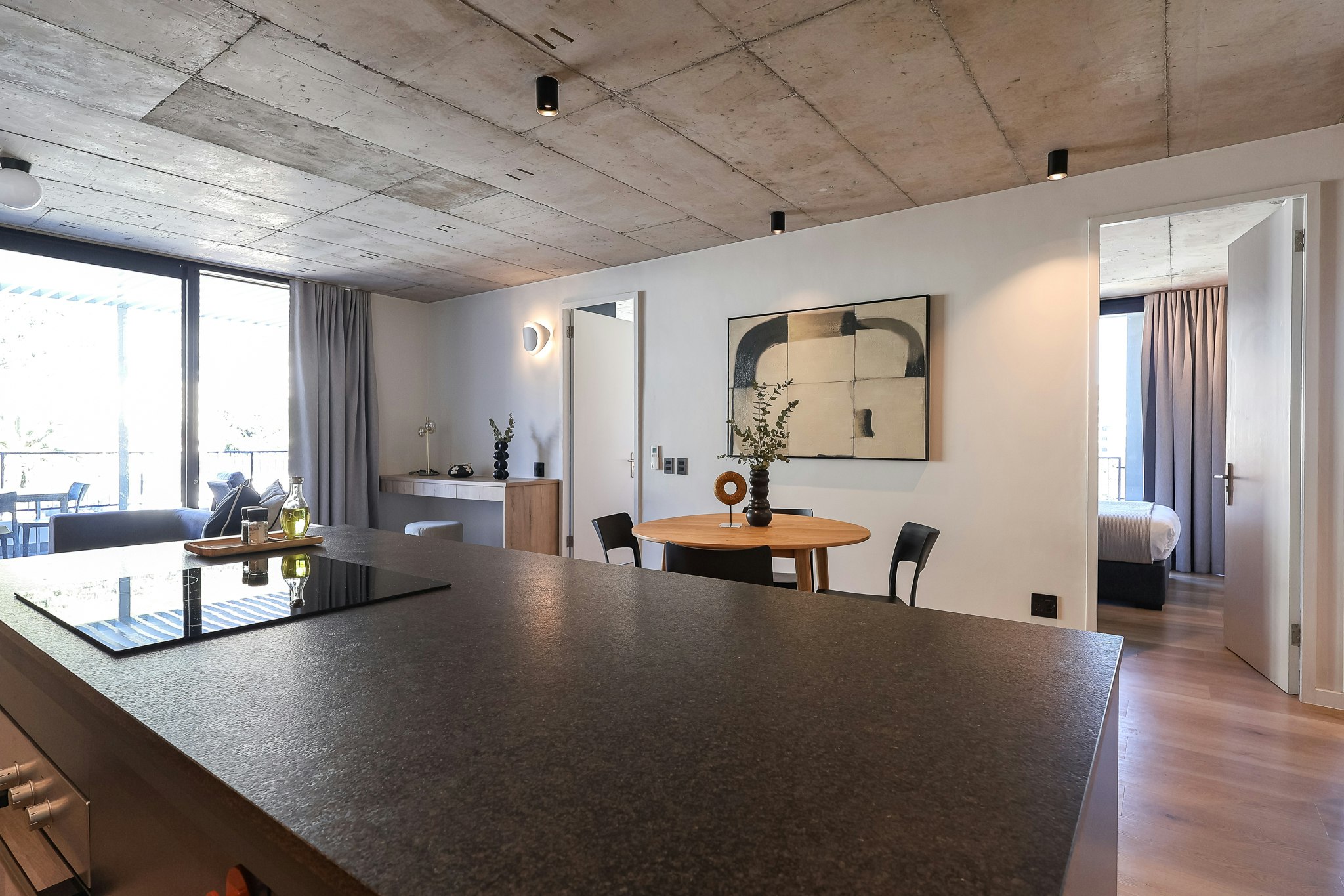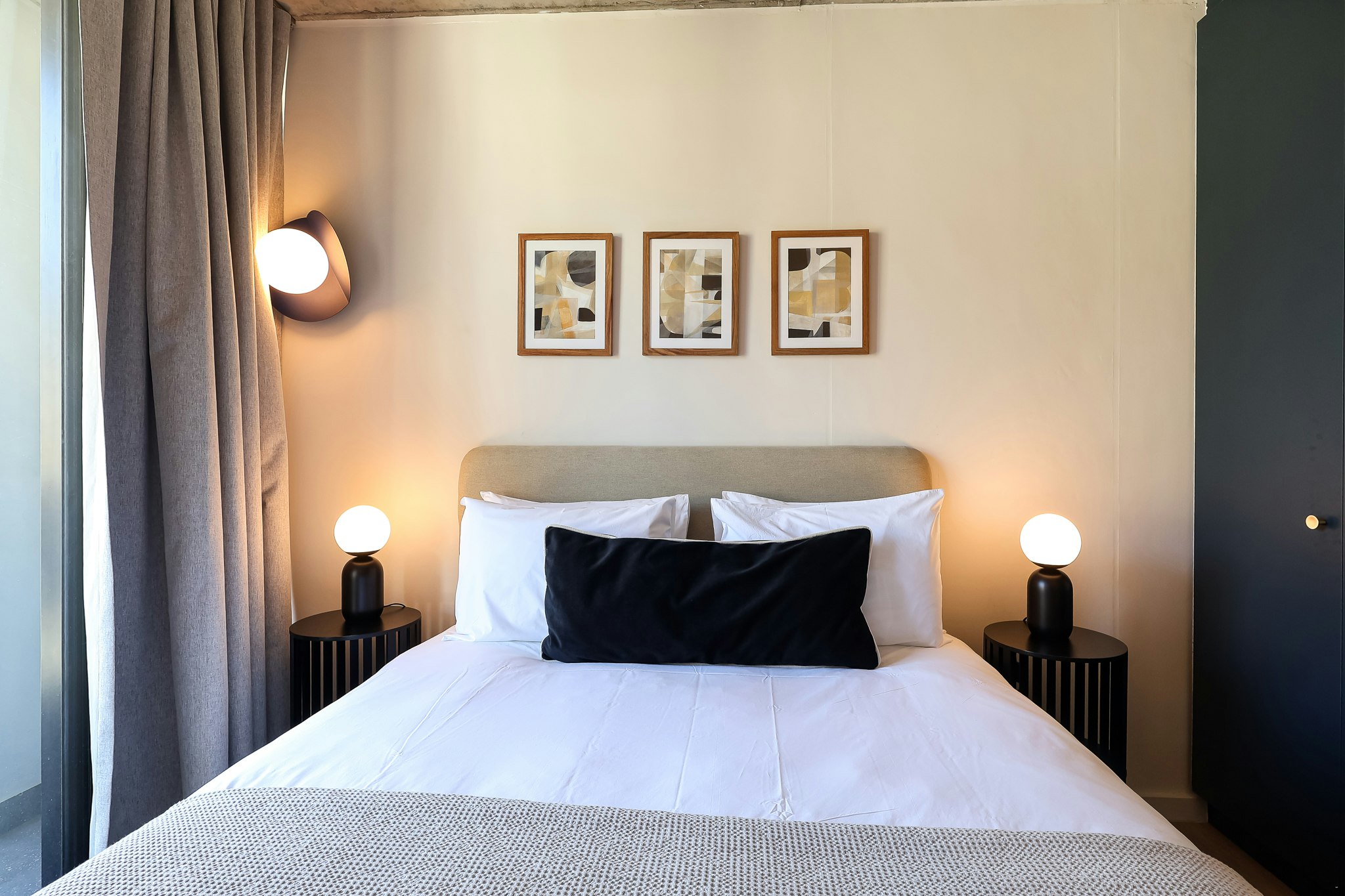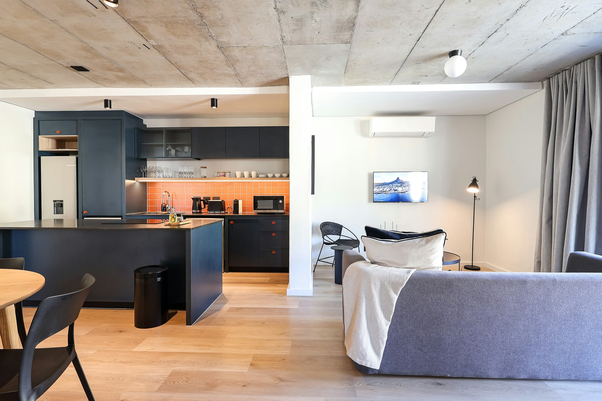 Die leefarea lei na 'n ruim balkon met buitesitplek en berguitsigte. Gaste het eksklusiewe toegang tot premium geriewe, insluitend selfbedieningswasserye, 'n dakswembad met 'n ontspanningsarea, werkruimtes en verwelkomende gemeenskaplike ruimtes wat perfek is vir sosialisering en ontspanning.