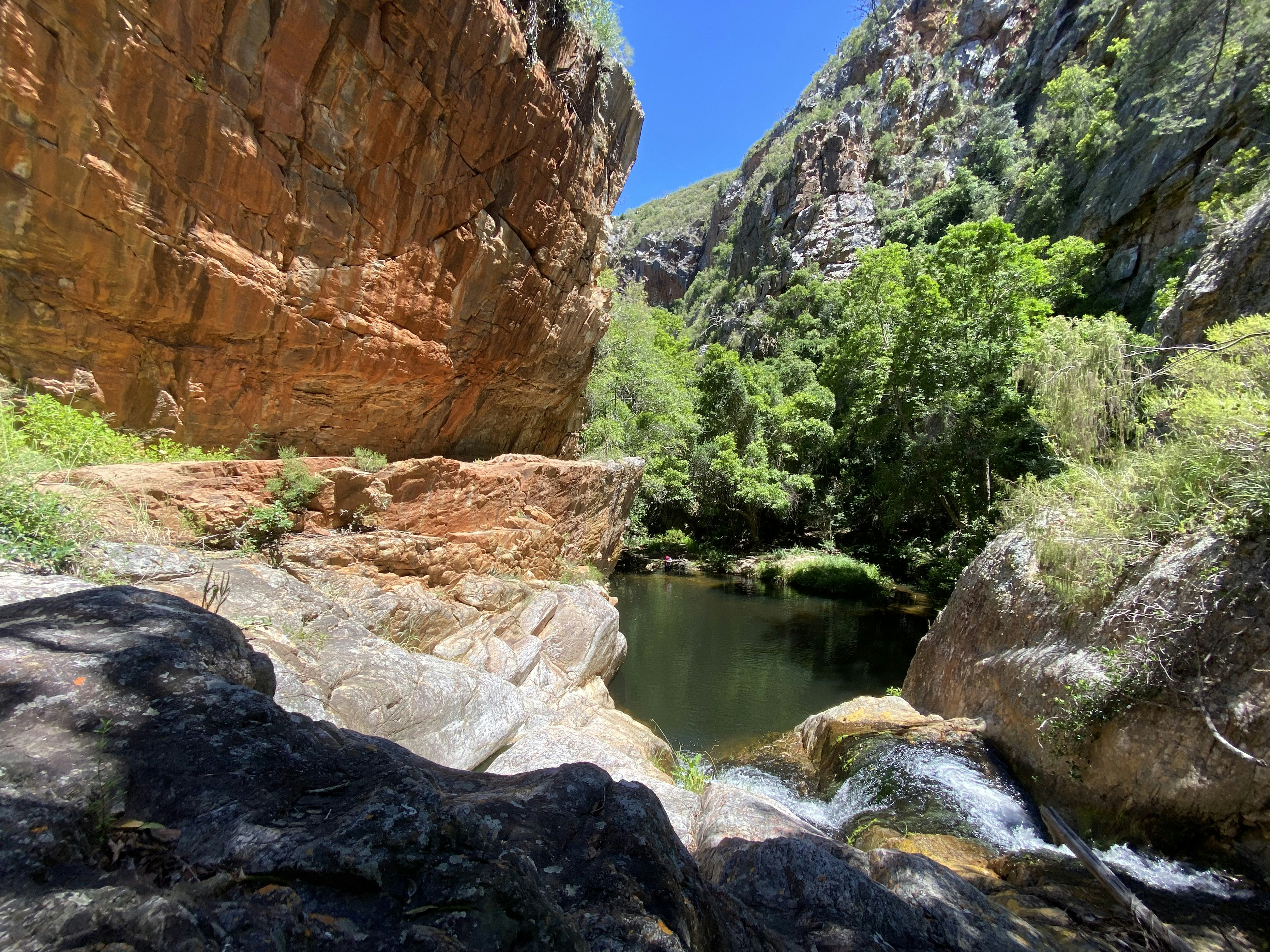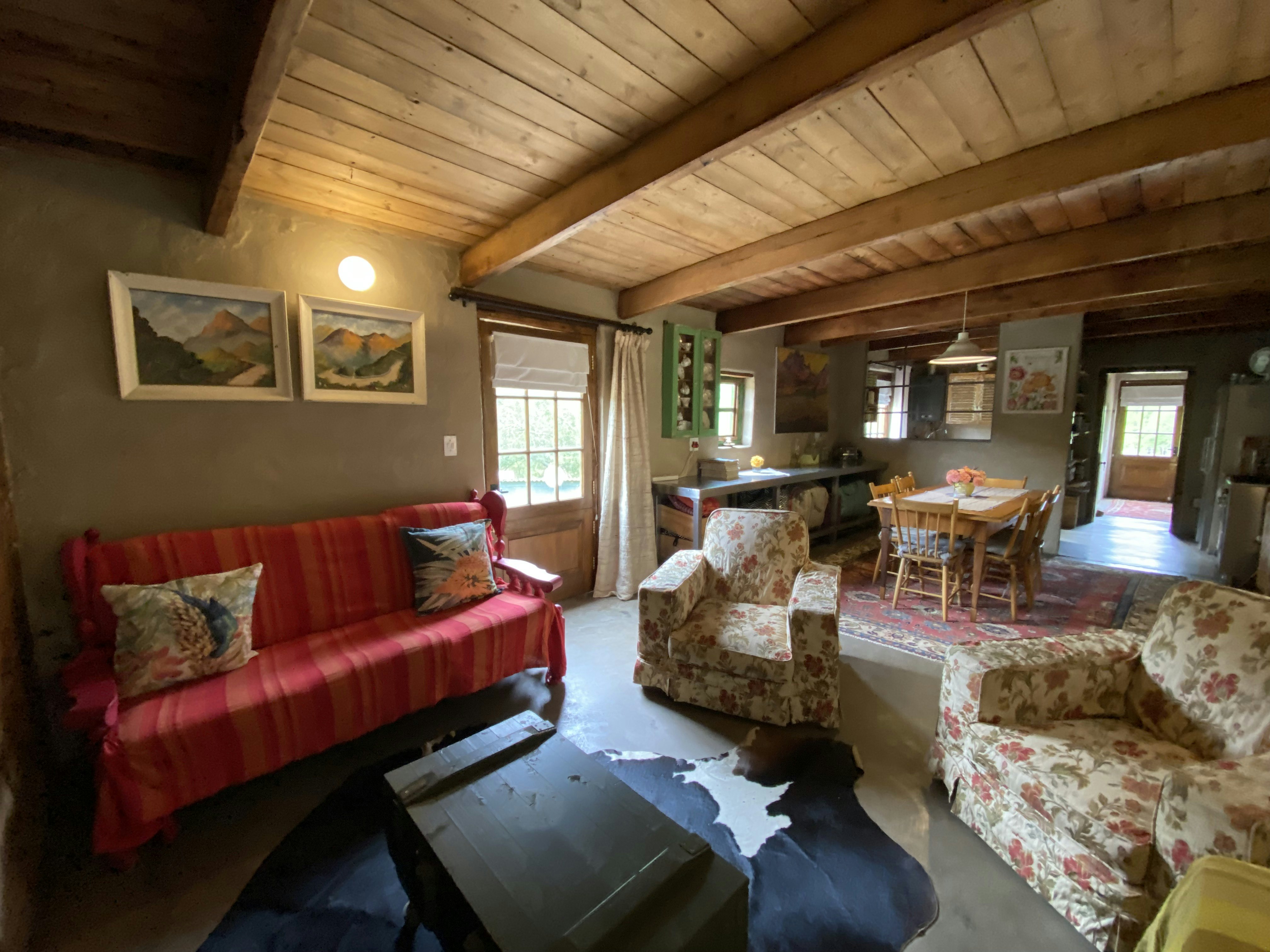 Die stoep bied 'n plonspoel met 'n ketel wat kan dien as 'n borrelbad, 'n tafel en stoele om buite te eet, asook gemaklike stoele om te ontspan met 'n uitsig oor 'n grasperk wat afloop na die rivier, waar plaasdiere op groen weivelde wei. Die vallei se oorkant beskik oor stygende berge en kranse. Gaste kan swem, voetslaan, fietsry, en voëlkyk en piekniekplekke op die perseel geniet. Beperkte WiFi en veilige parkeerplek is beskikbaar vir gaste tydens hul verblyf.