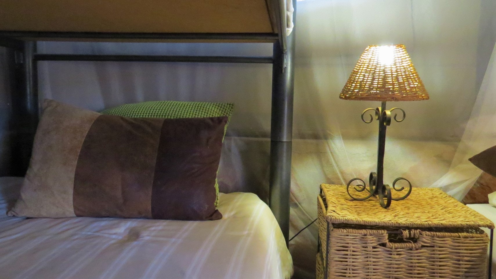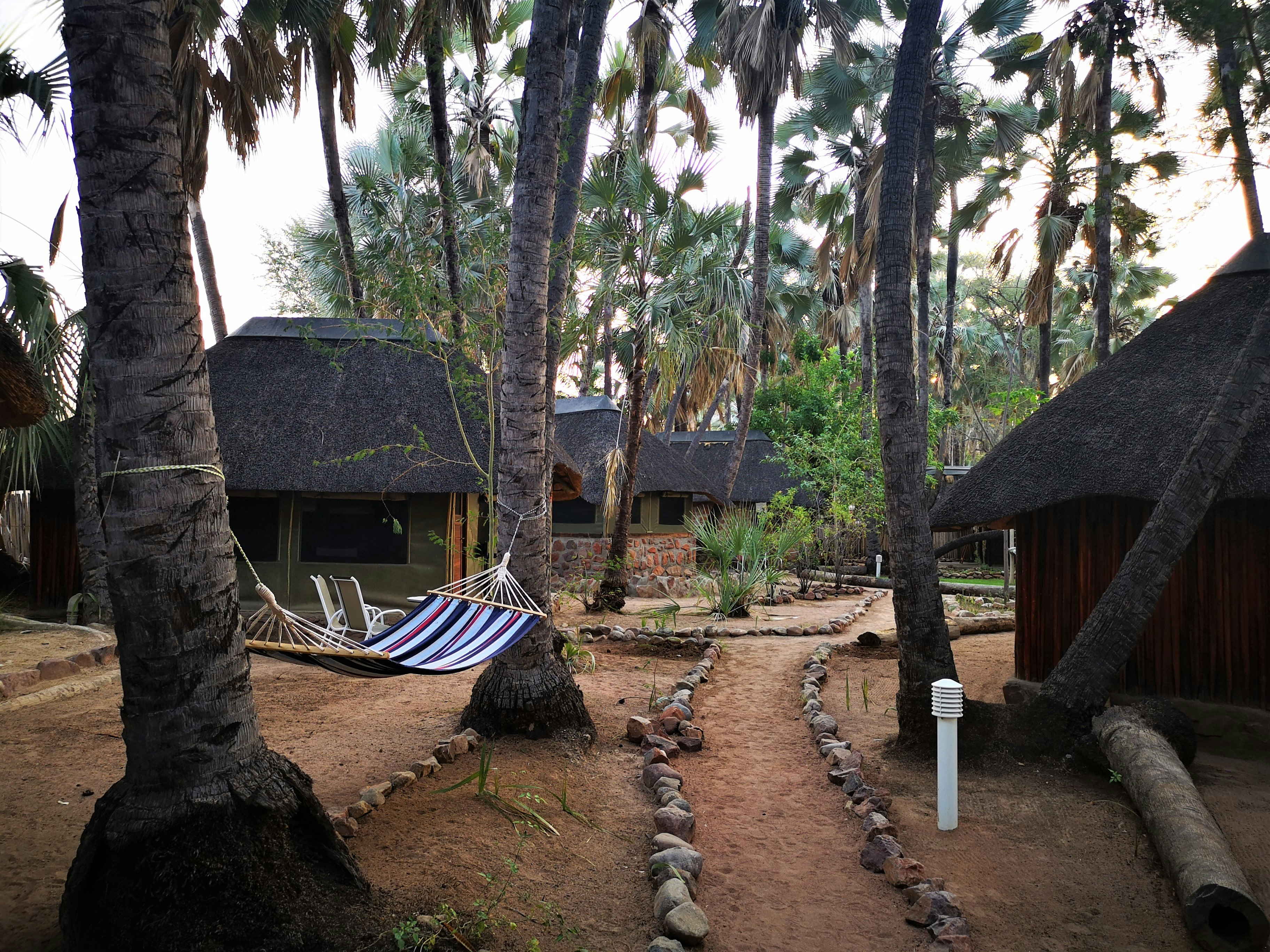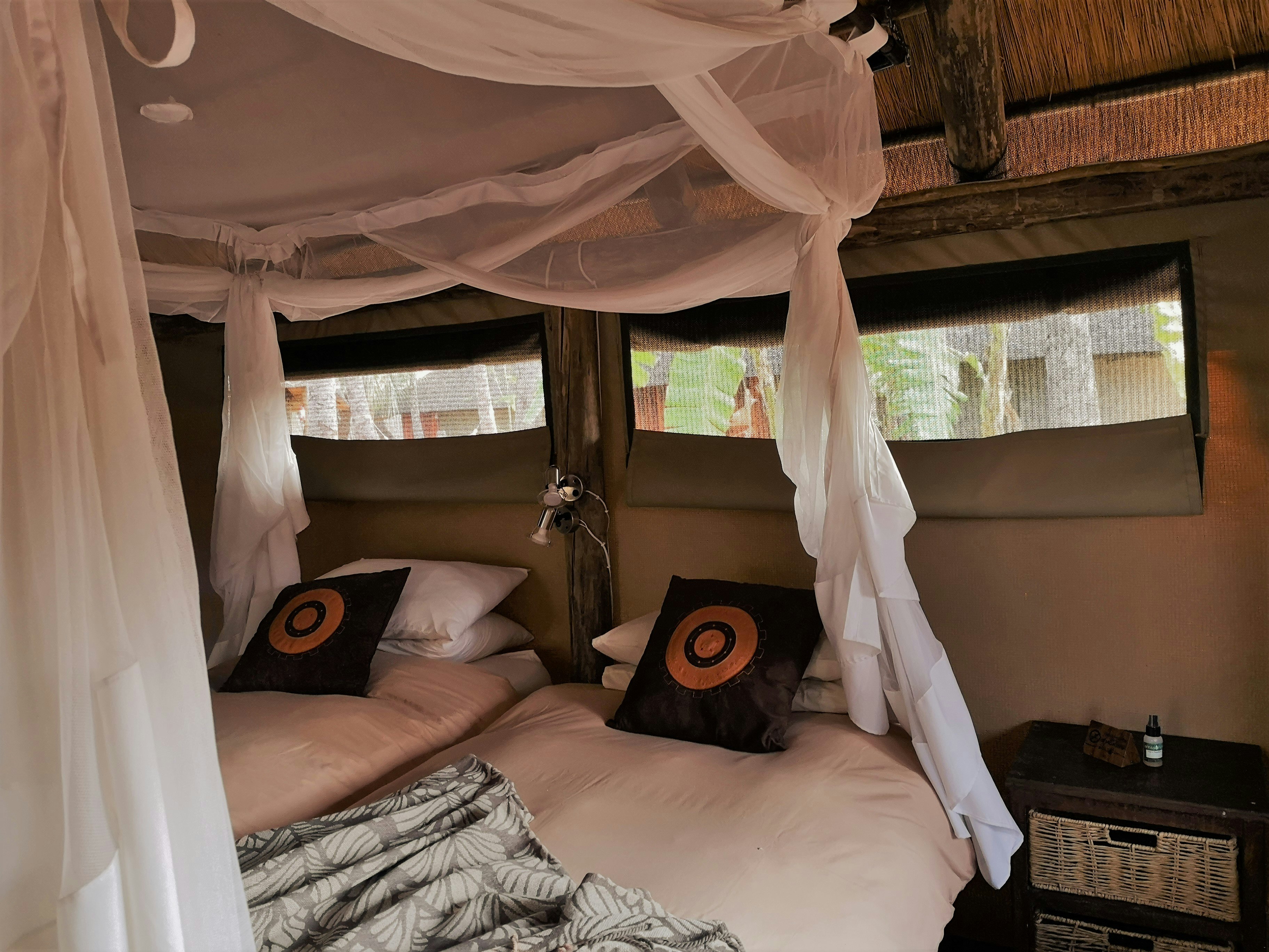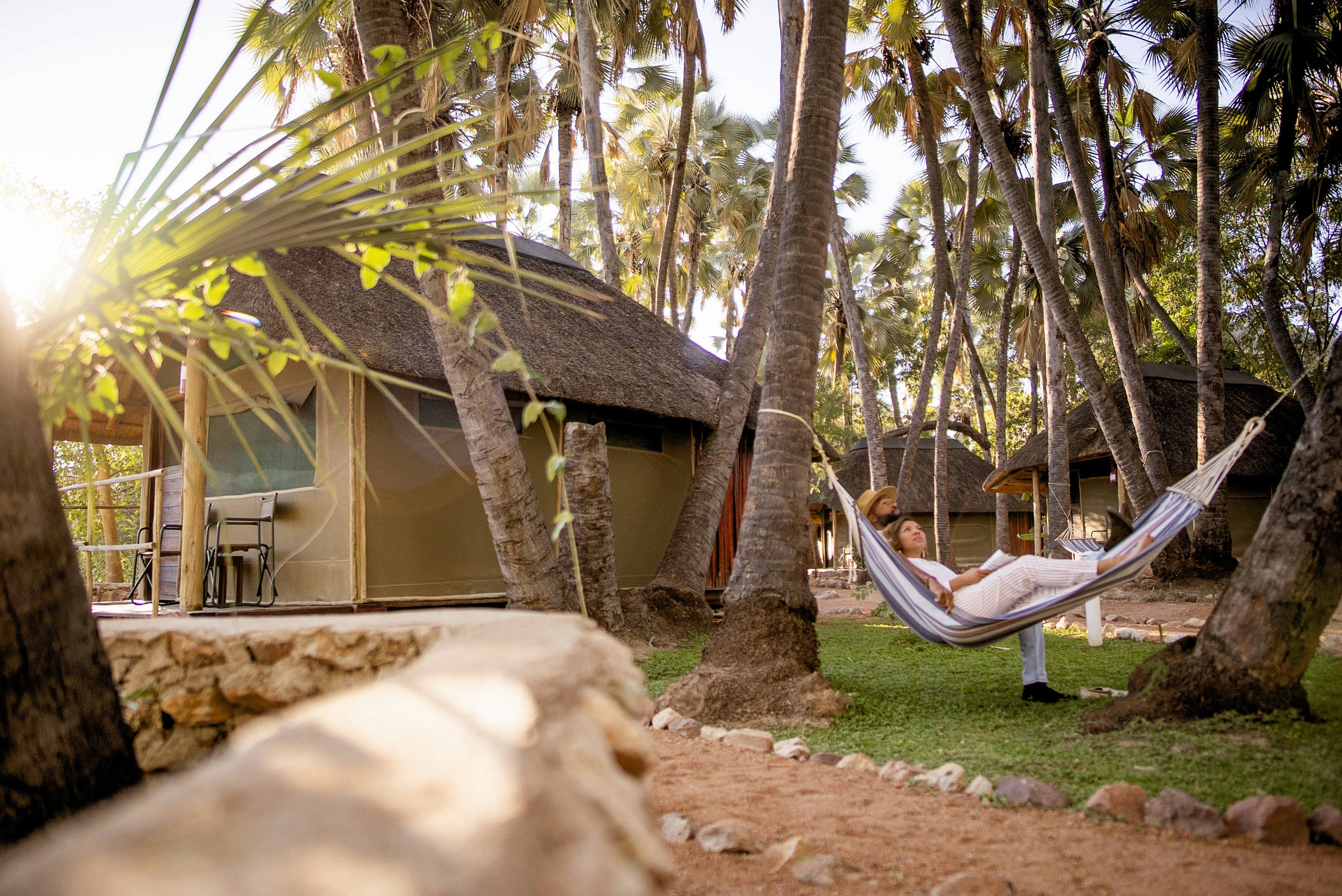 Verblyf word in 14 permatent-chalets gebied. Gaste kan kies tussen dubbelchalets, enkelbedchalets, en gesinschalets. Die chalets het en suite-badkamers met storte, muskietnette en ongelooflike rivier-uitsigte. Die kamp bied ook 'n kroeg en 'n restaurant. Gaste kan etes geniet terwyl hulle op die rivier uitkyk en na die valle en palmbome se klanke luister.