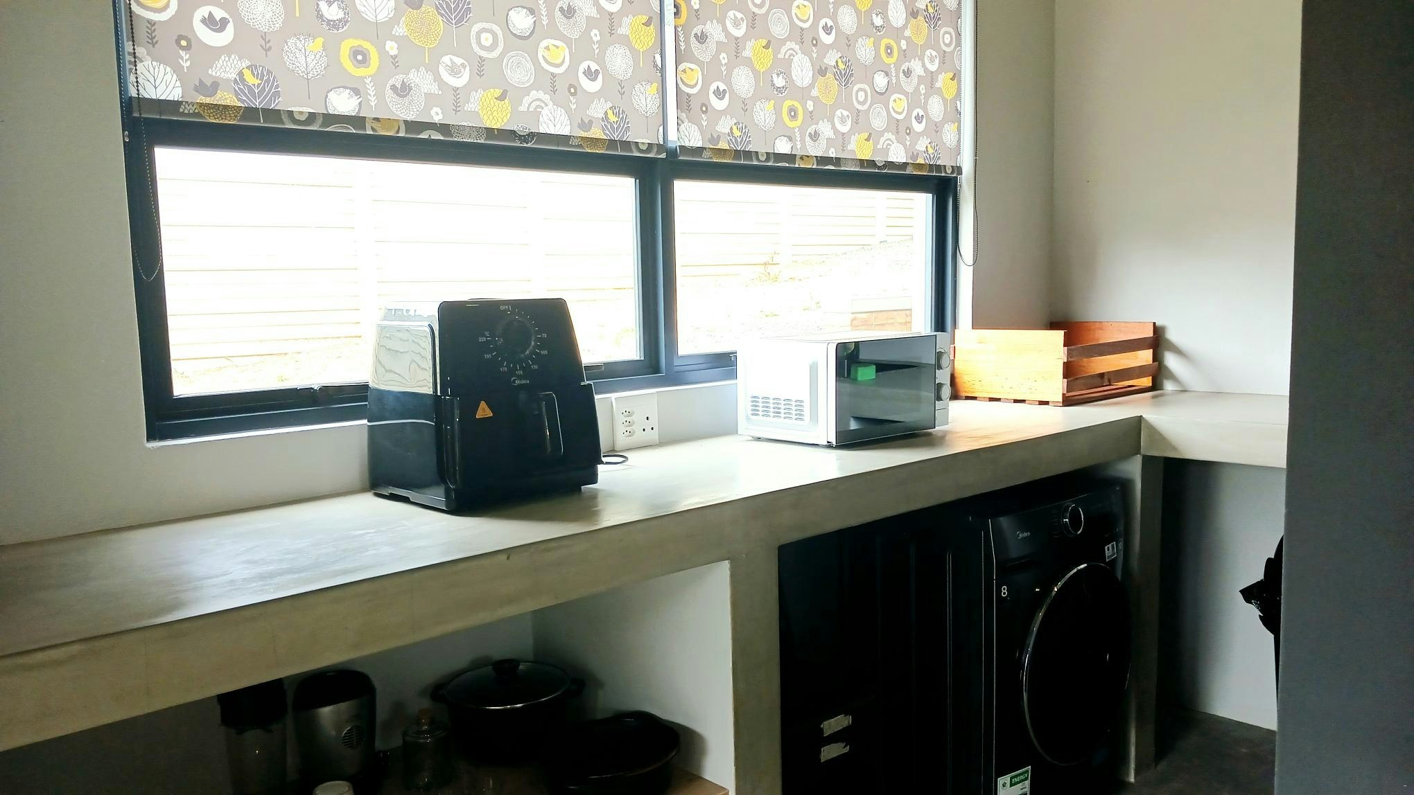Die oopplan-leefarea beskik oor 'n kombuis wat volledig toegerus is met 'n stoof, oond, mikrogolf, yskas-vrieskas, eetgerei en breekware, asook tee- en koffiemaakgeriewe. 'n Lugbraaier en wasmasjien is ook beskikbaar. Van die kombuis af lei 'n etenstafel met sitplek vir 4 en 'n sitkamer met gemaklike rusbanke en 'n muurgemonteerde TV. Toegang tot gratis WiFi is beskikbaar.