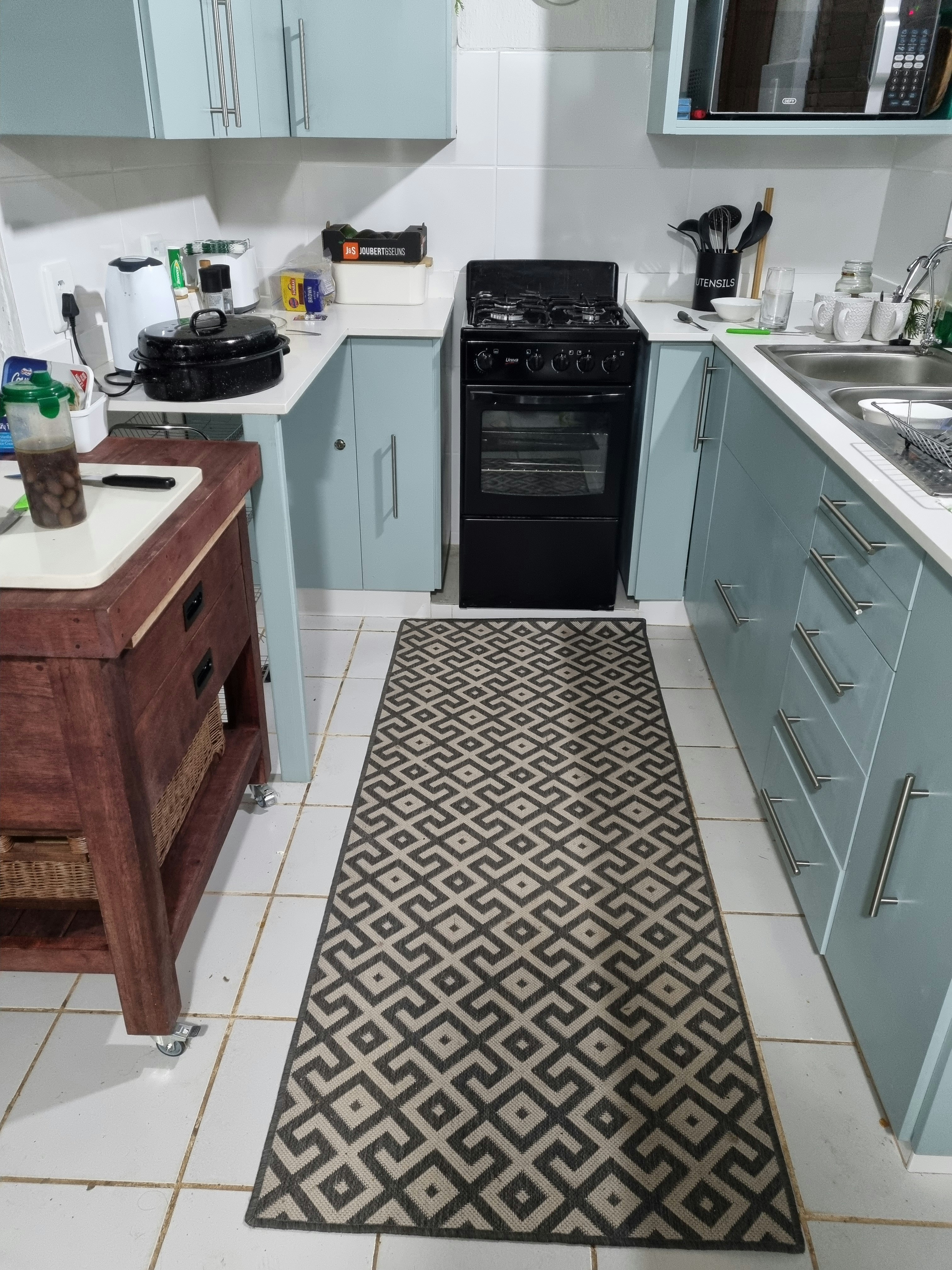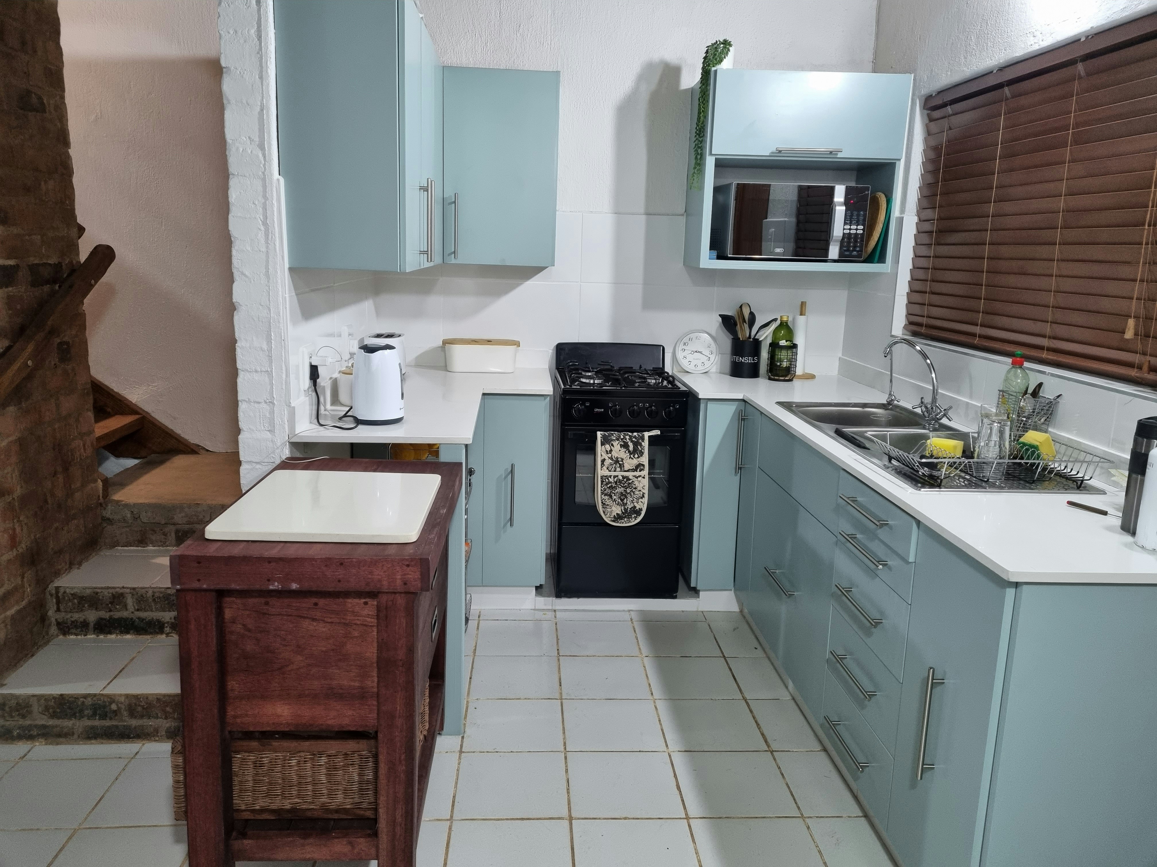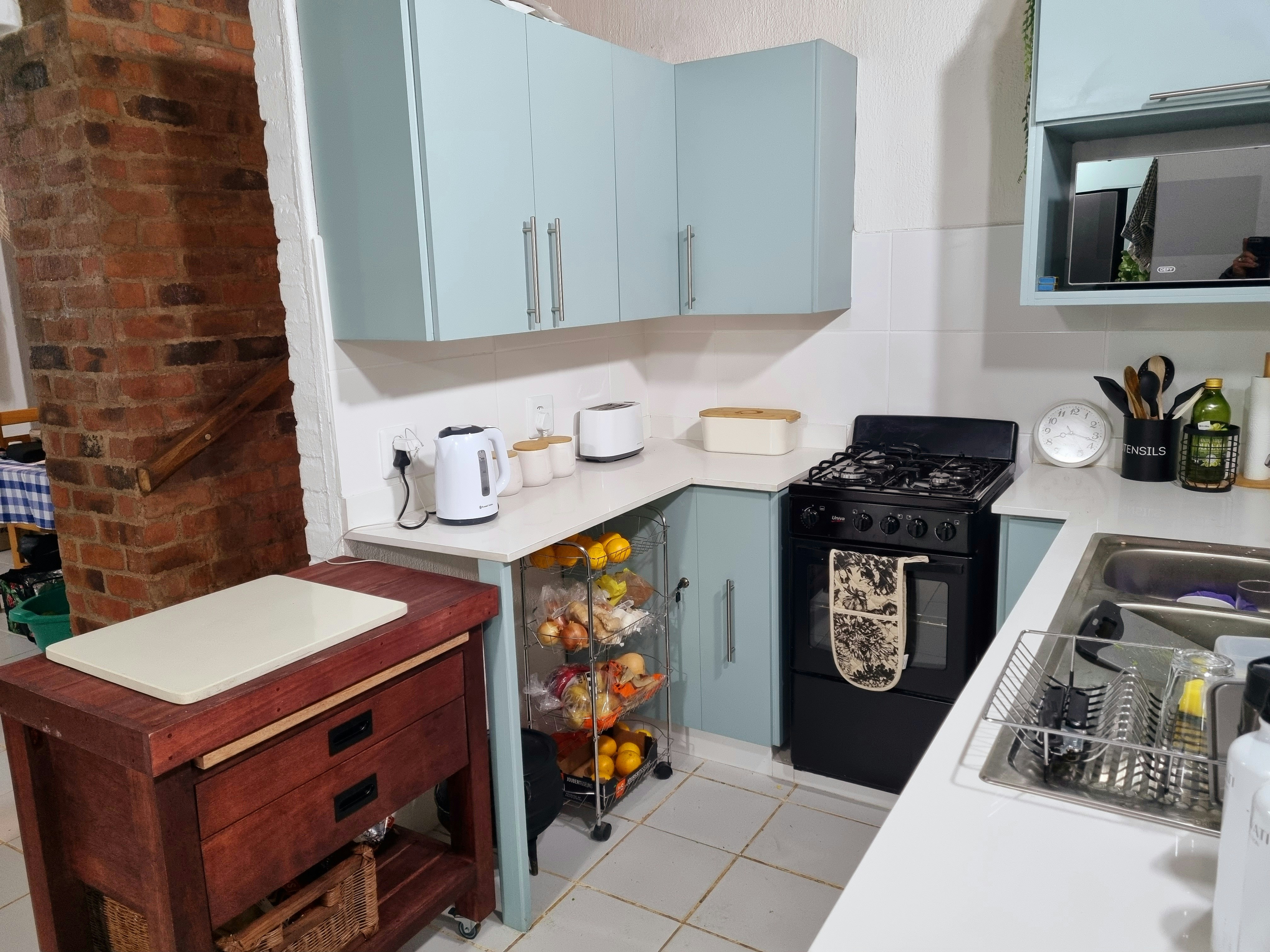 The kitchen is equipped with a gas stove, fridge-freezer, microwave, coffee- and tea-making facilities, crockery and cutlery.