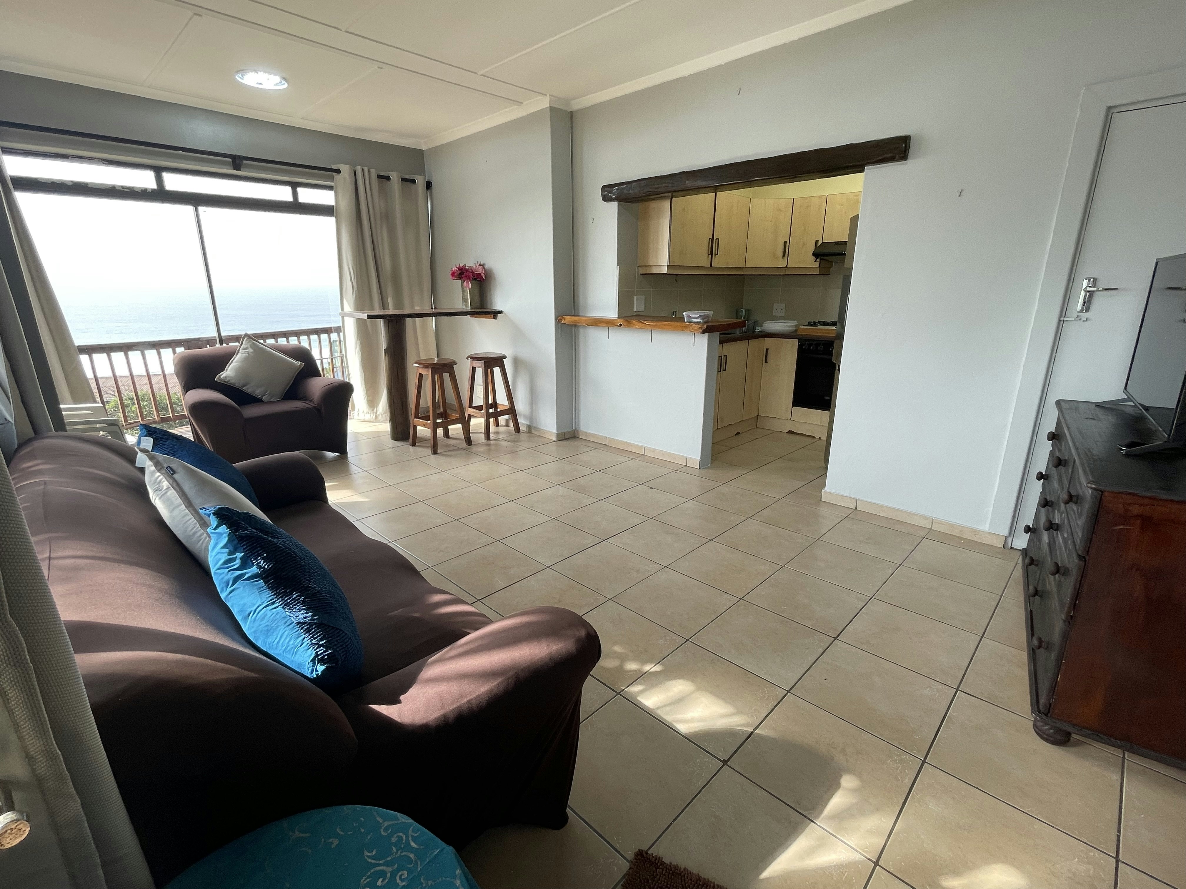 The open-plan kitchen is equipped with a fridge-freezer, gas stove, oven, microwave, basic cutlery and crockery, as well as tea- and coffee-making facilities. The living area is furnished with a lounge suite and a flat-screen TV. Free Wi-Fi is also available. The sliding doors lead to the balcony where guests can enjoy the lovely sea views. Secure parking is available on the premises.