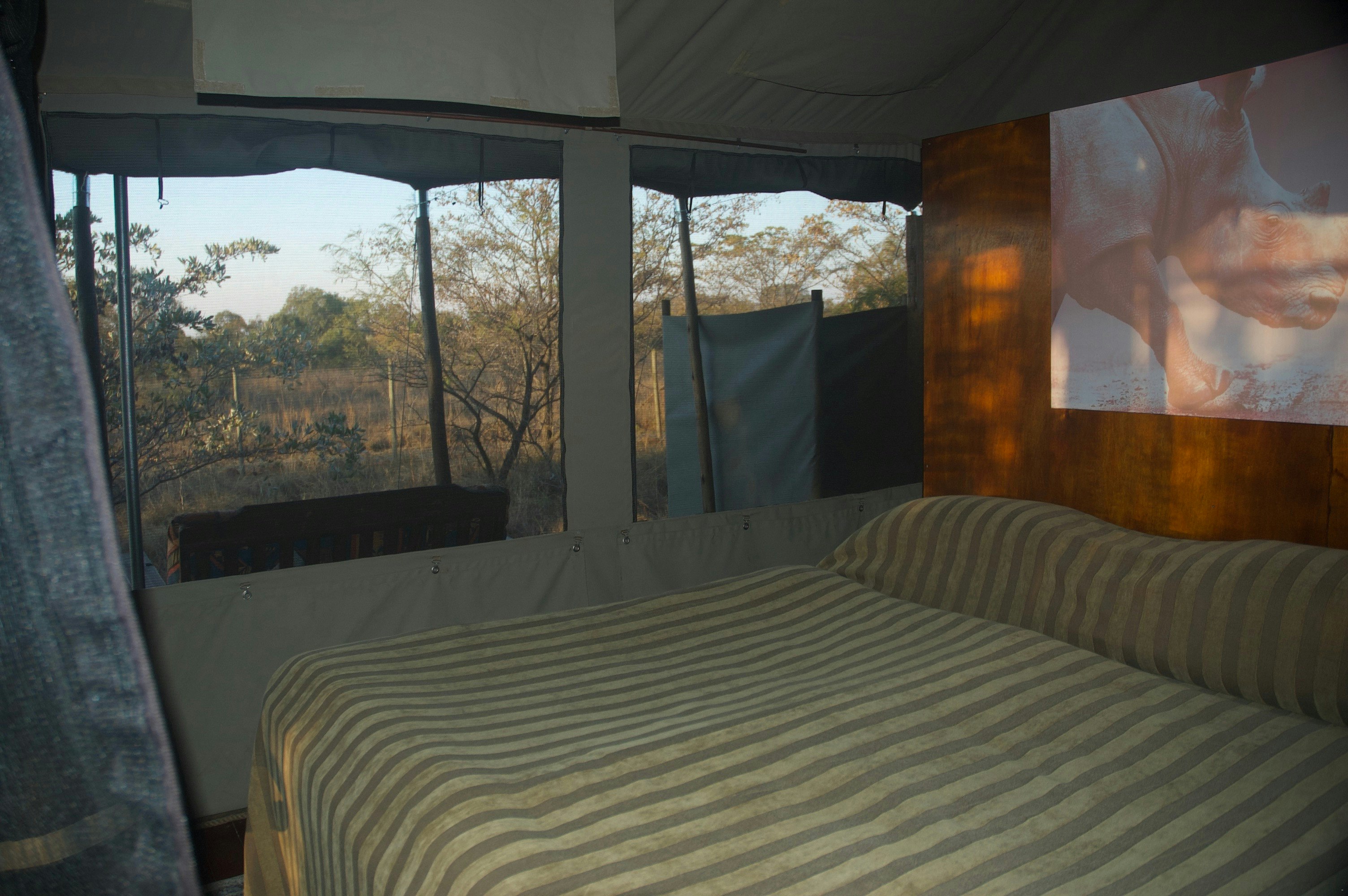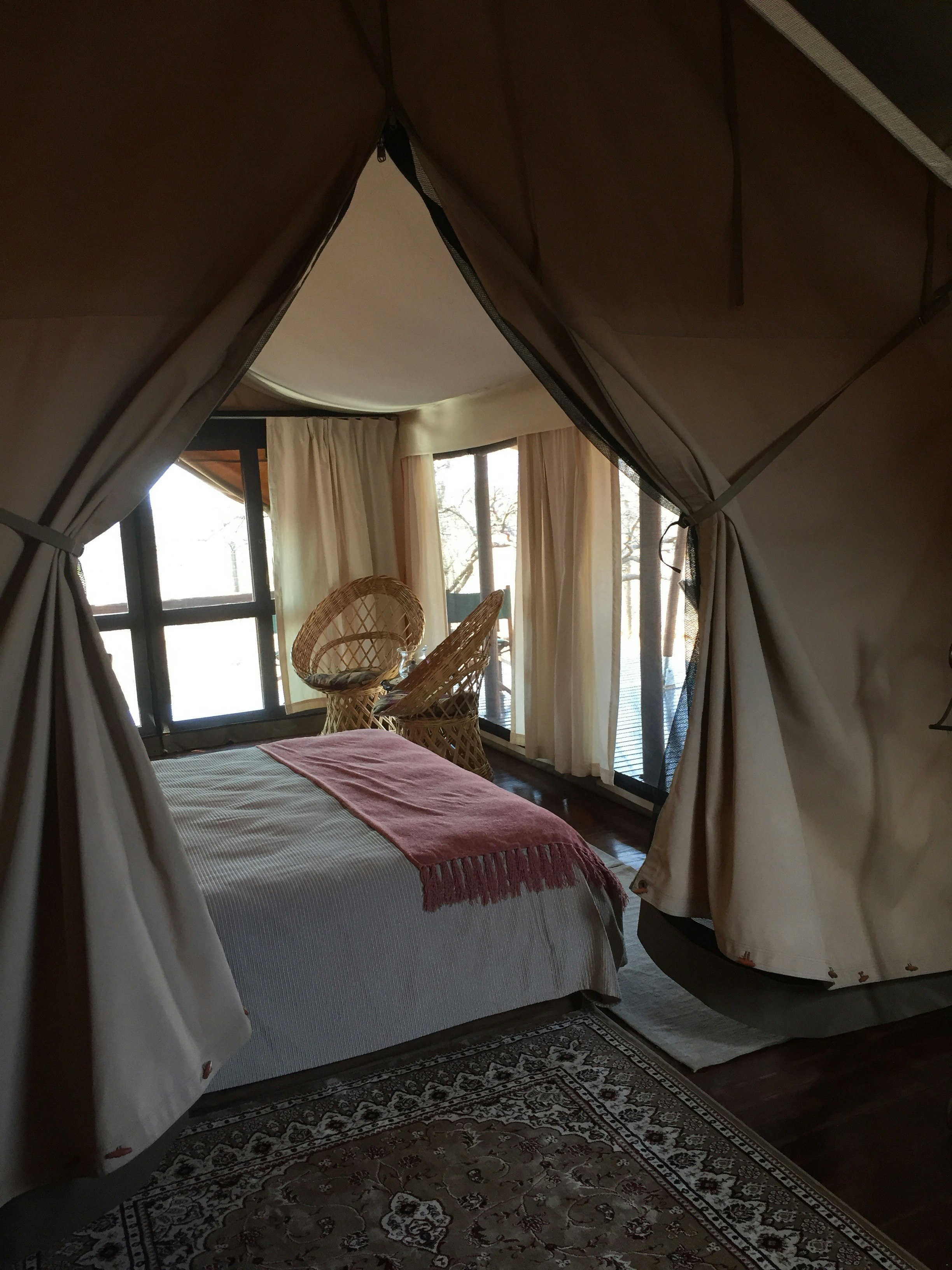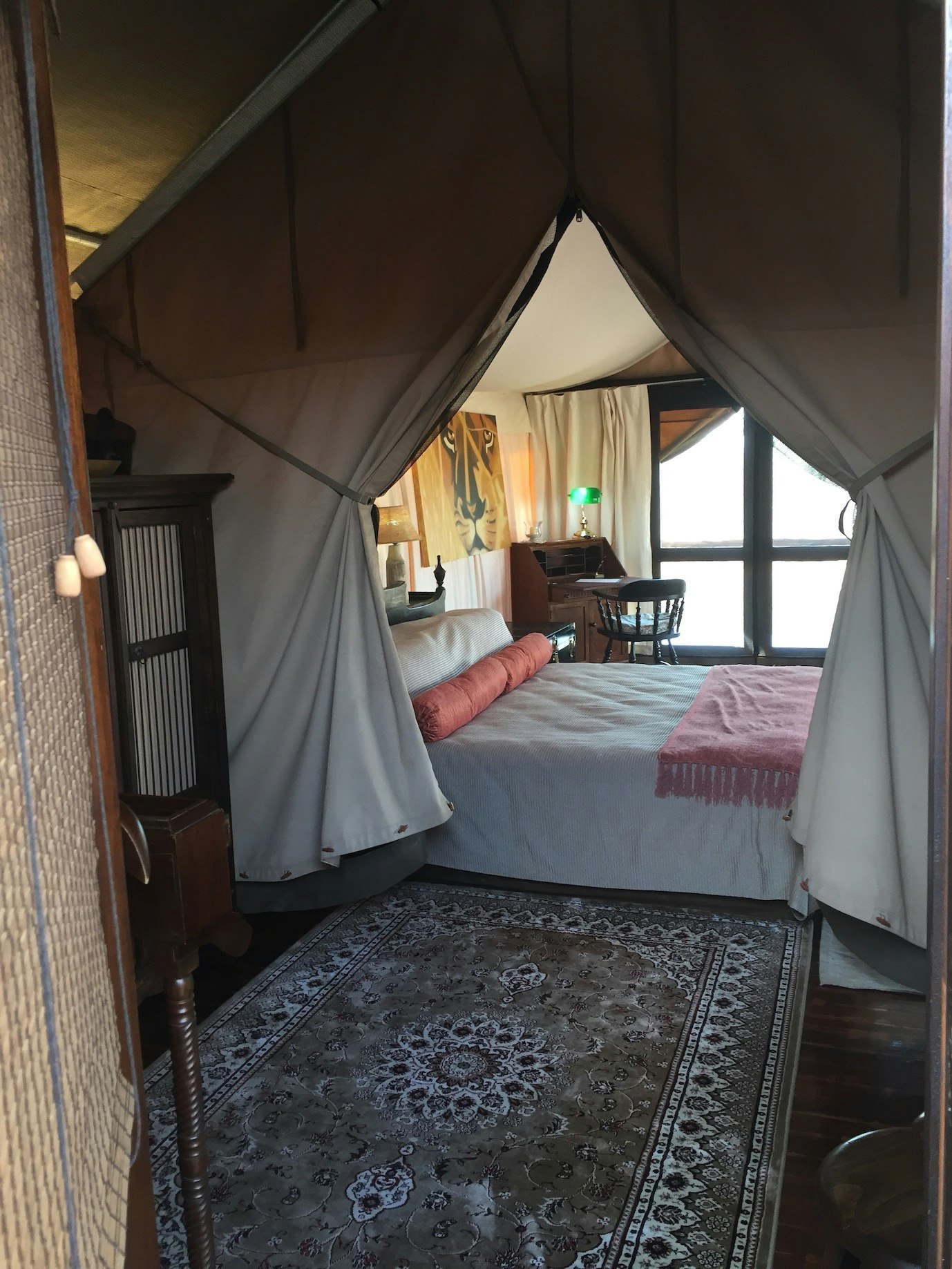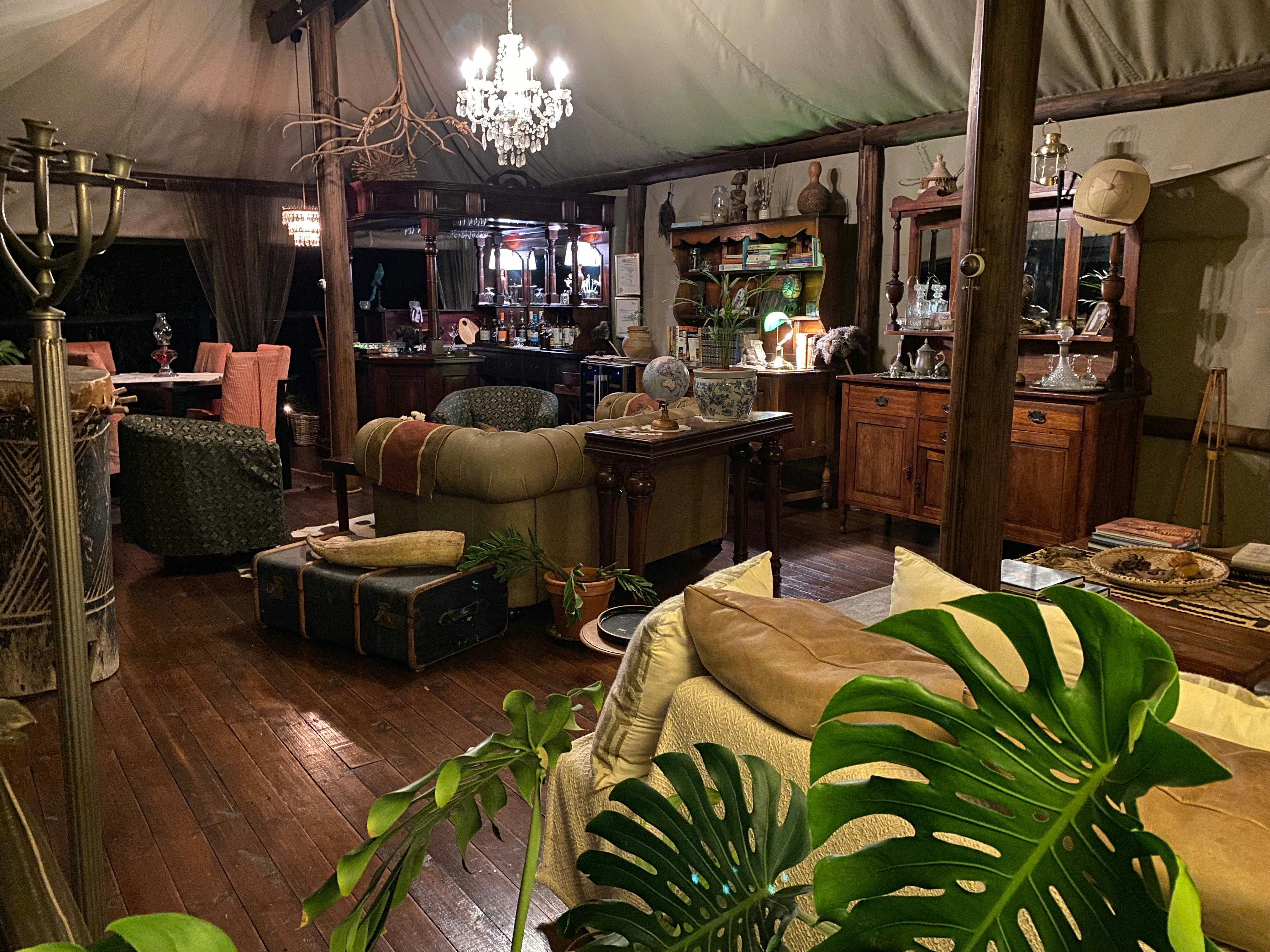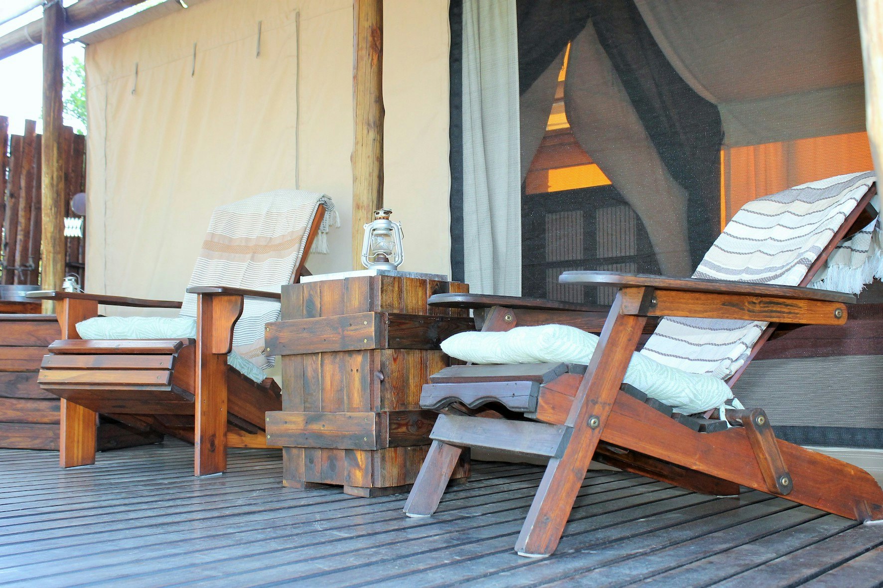Vir maksimum privaatheid is die eenhede 50 meter uitmekaar, geskei deur dik bos, en elke patio kyk na die Groot 5 wildheining. Die luukse tent-suites beskik oor ekstra-lengte koninggrootte-beddens, badkamers met 'n toilet, wasbak en buitestort. Ander geriewe sluit 'n klerekas, lessenaar, stoele en dekstoele in, alles op 'n verhoogde houtplatform wat toeganklik is via 'n oprit.