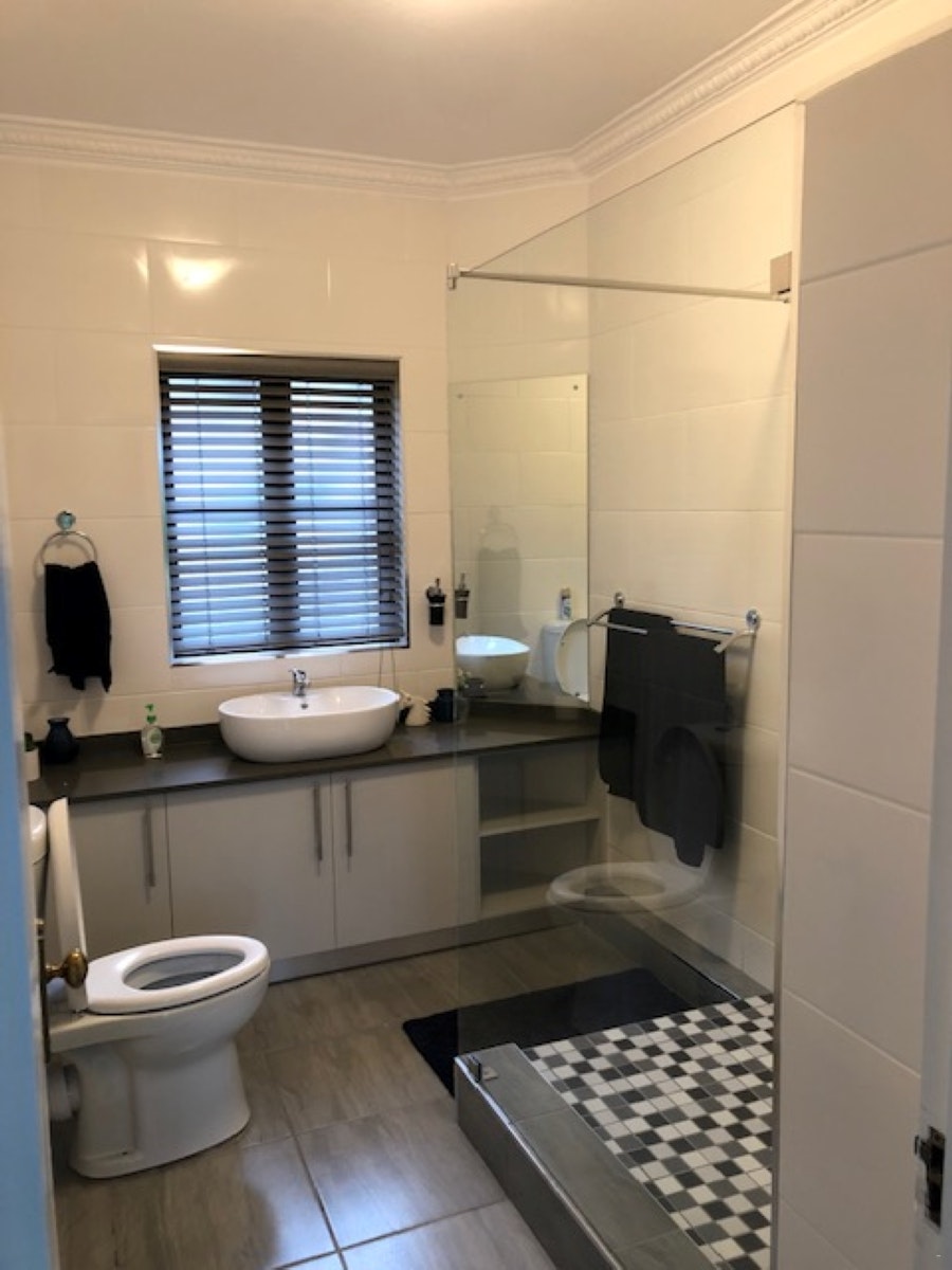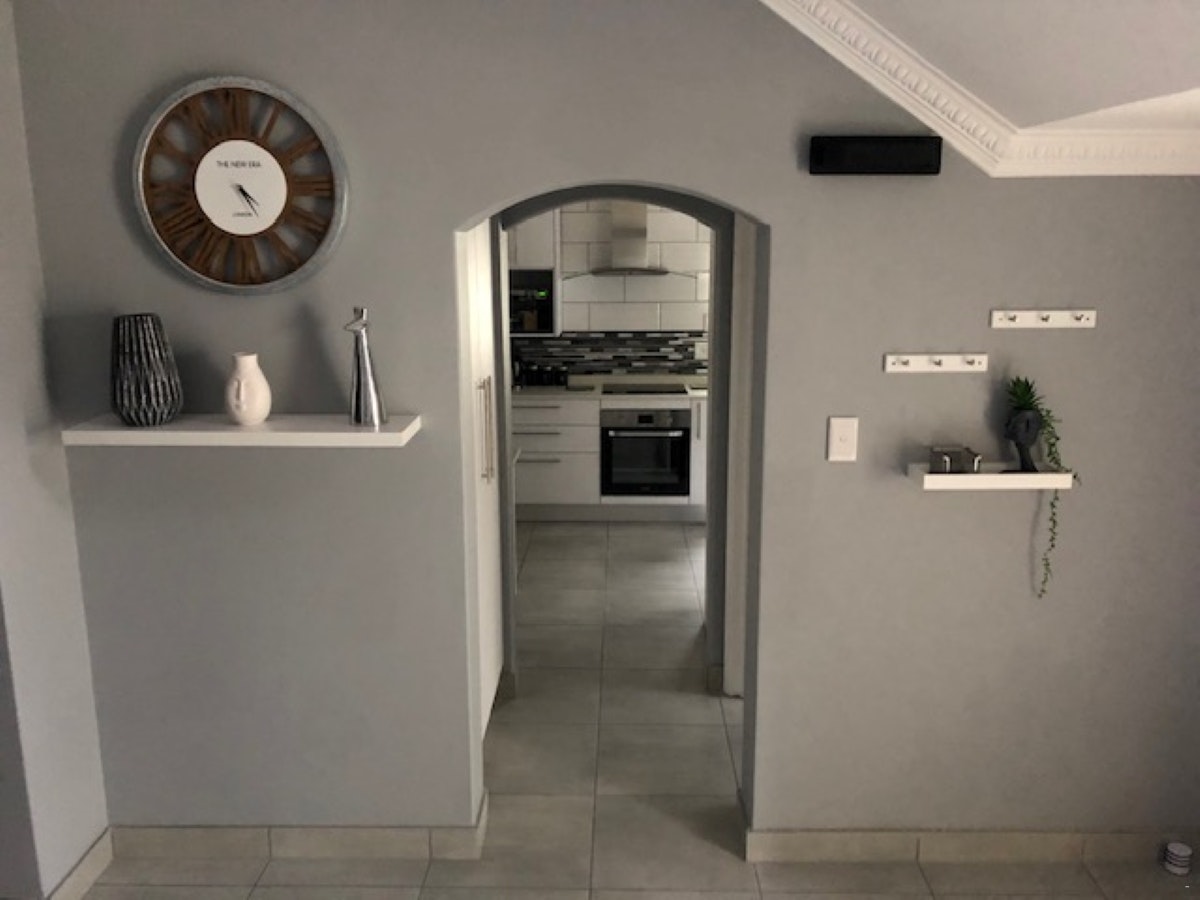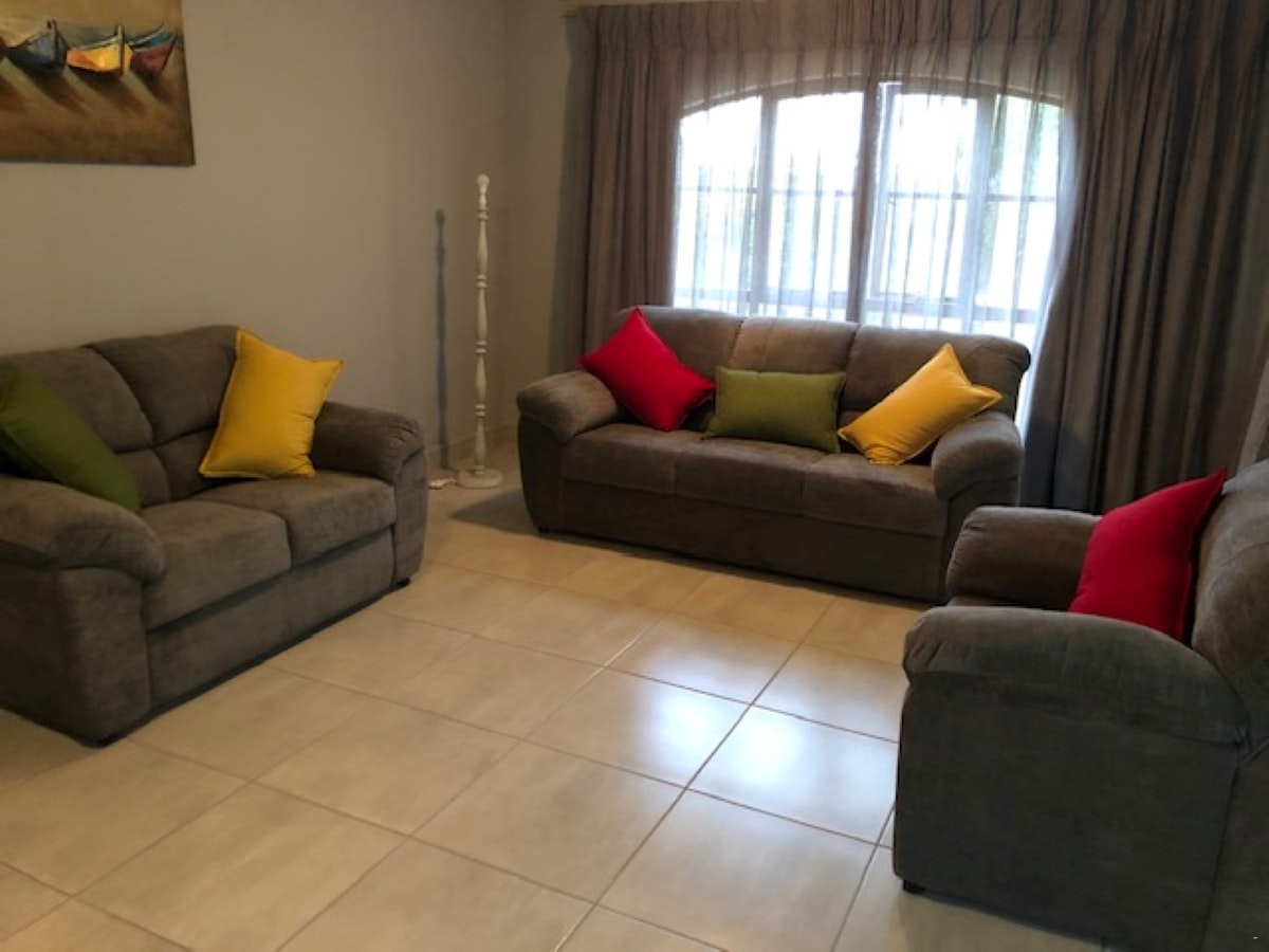 The kitchen is open-plan to the living room and is equipped with a fridge-freezer, stove, oven, microwave, basic cutlery, crockery, and tea- and coffee-making facilities. In addition, there’s a dishwasher, washing machine, and dryer for guests’ convenience. It extends to the dining table and further opens up to the living room furnished with comfy seating space, and a TV with a full selection of DStv channels. Free Wi-Fi is available throughout the house.