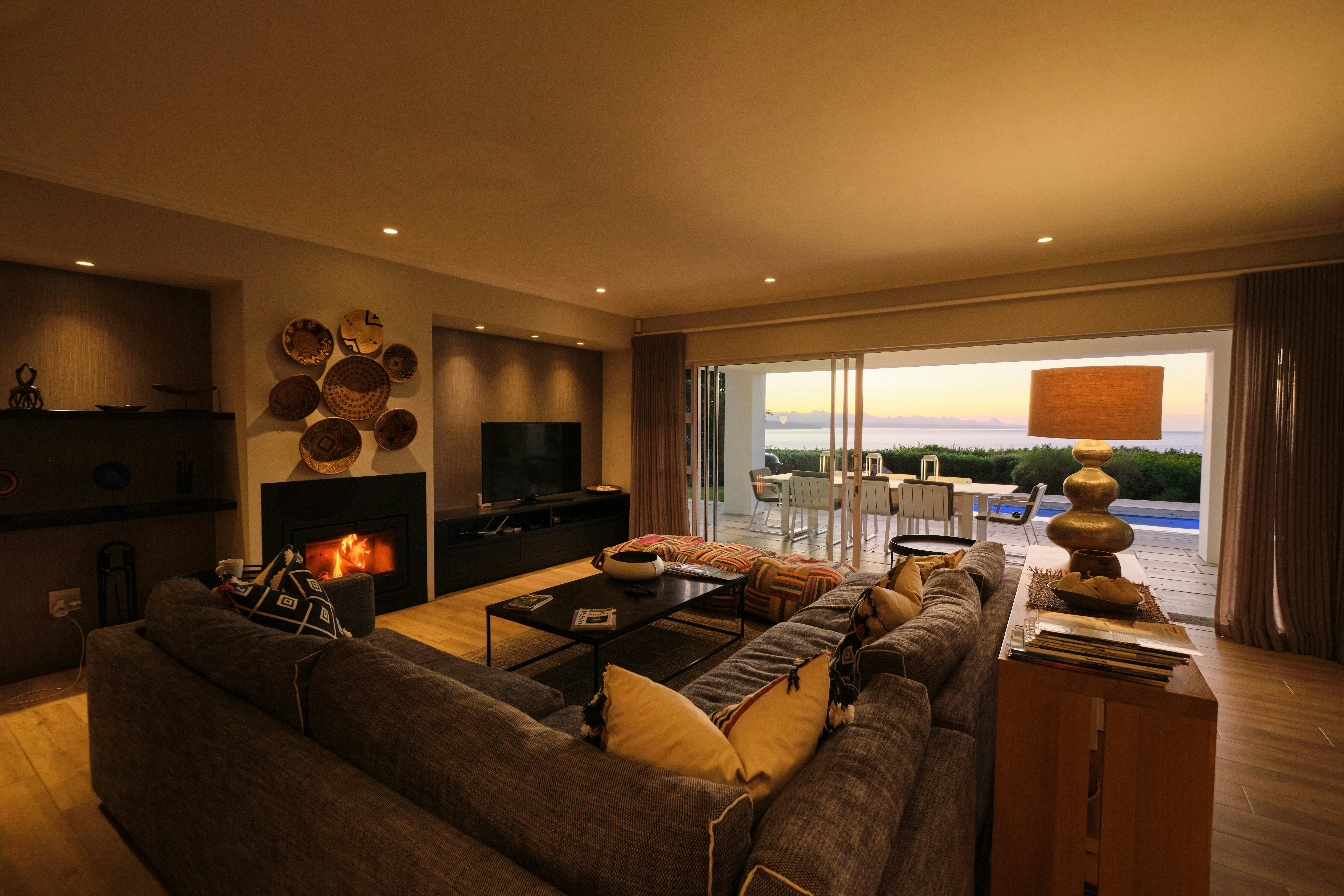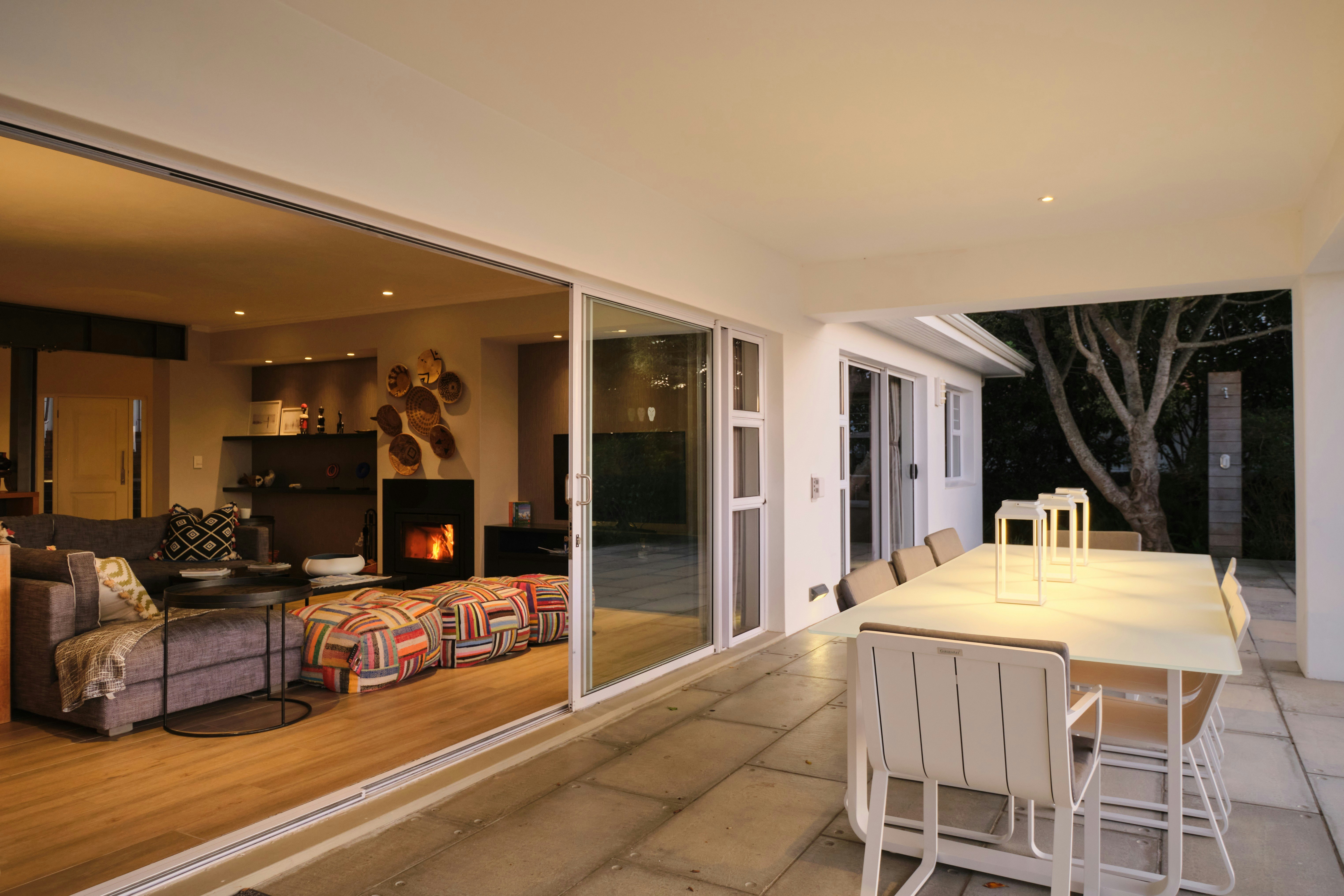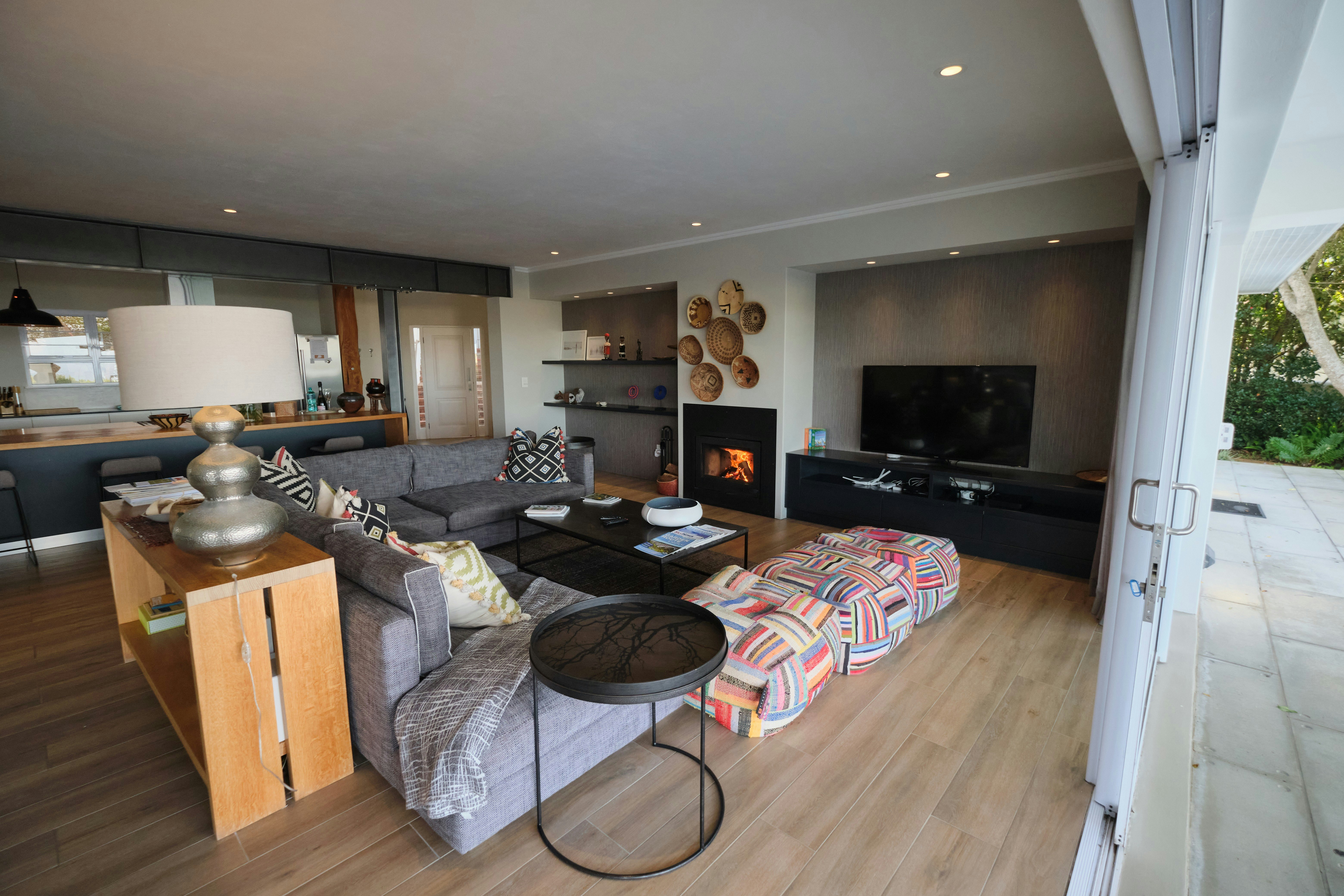 The kitchen is fully equipped for self-catering and includes an interleading scullery. The lounge features a wood-burning fireplace, and the living area opens through large sliding glass doors onto a covered deck. The deck overlooks a netted swimming pool, sun loungers, a Weber braai, and the garden. Wi-Fi is available, and guests can use their own login details to access streaming services such as Netflix and DStv on the smart TV.