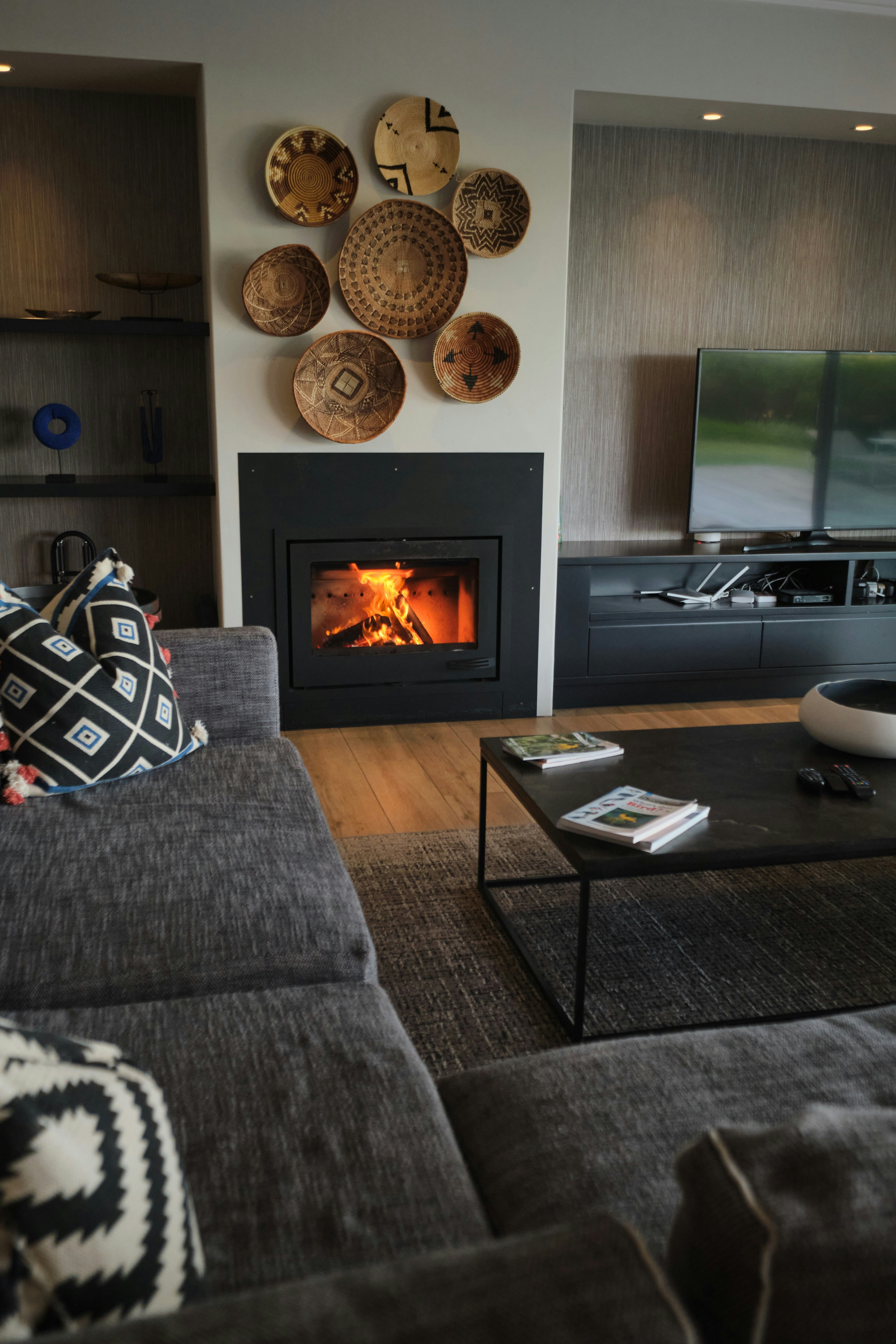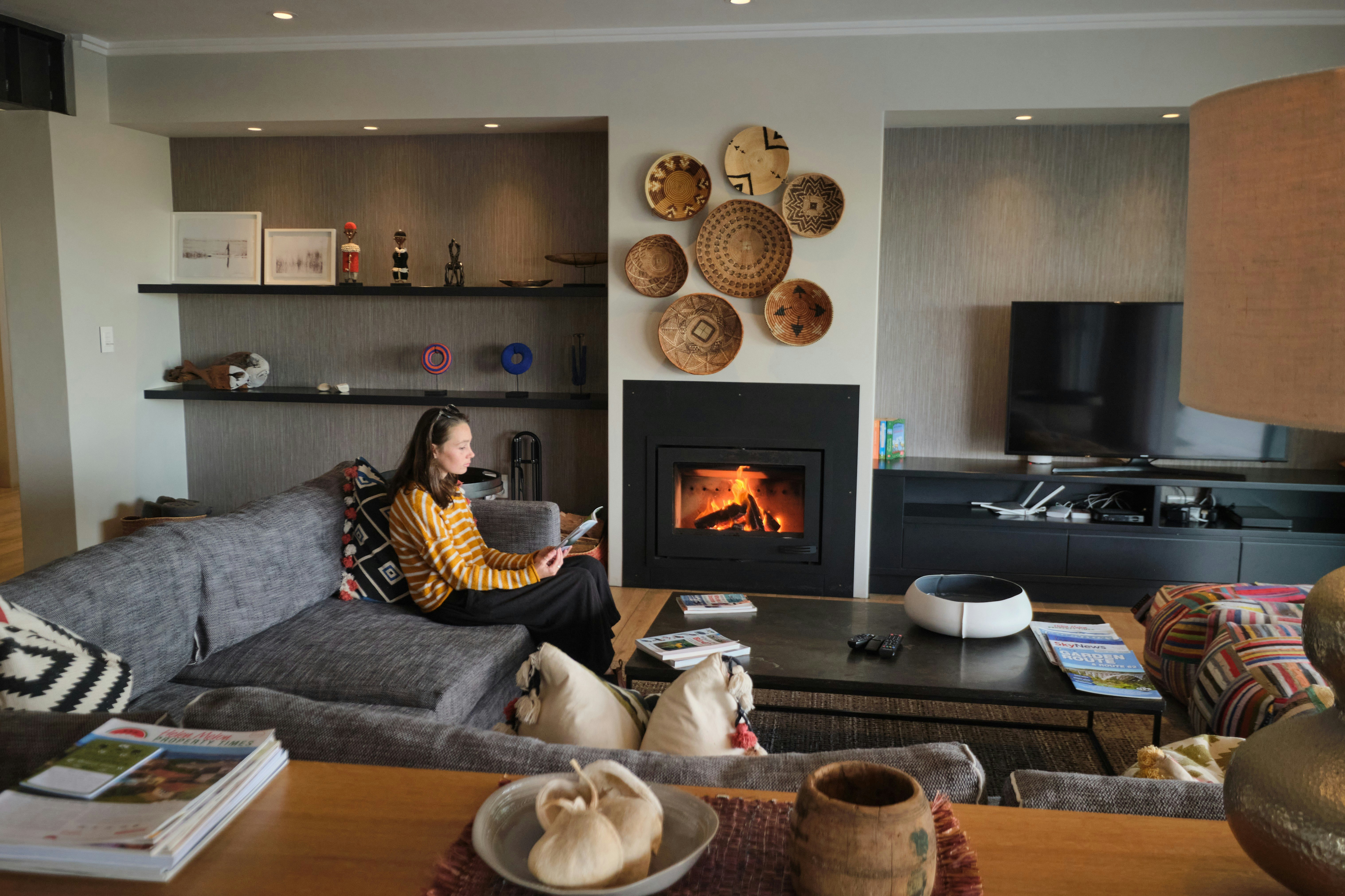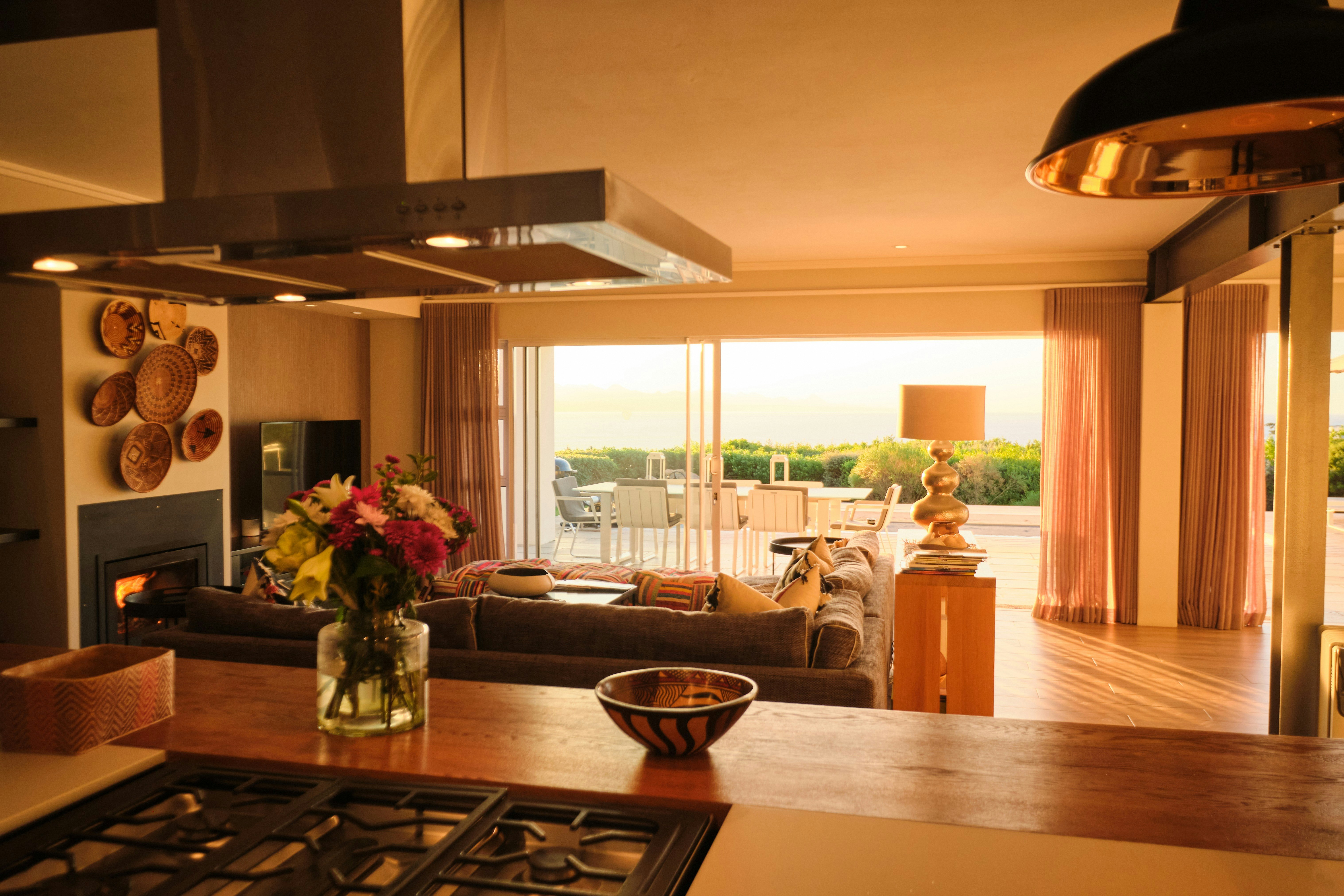 The kitchen is fully equipped for self-catering and includes an interleading scullery. The lounge features a wood-burning fireplace, and the living area opens through large sliding glass doors onto a covered deck. The deck overlooks a netted swimming pool, sun loungers, a Weber braai, and the garden. Wi-Fi is available, and guests can use their own login details to access streaming services such as Netflix and DStv on the smart TV.