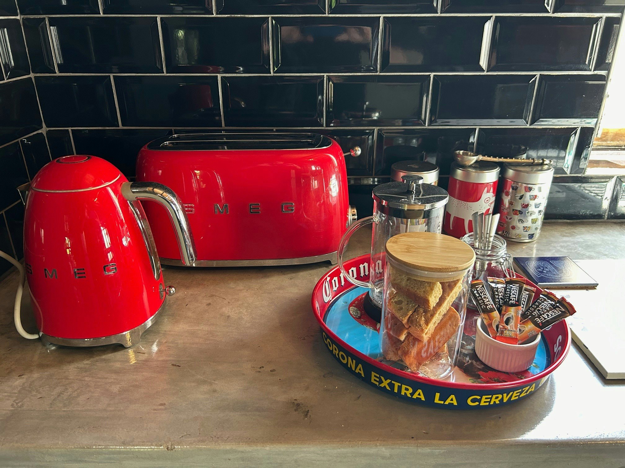 Die kombuisie is met 'n yskas-vrieskas, mikrogolfoond en tee- en koffiemaakgeriewe toegerus. Die kothuis lei na 'n stoep met sitplek en braaigeriewe.