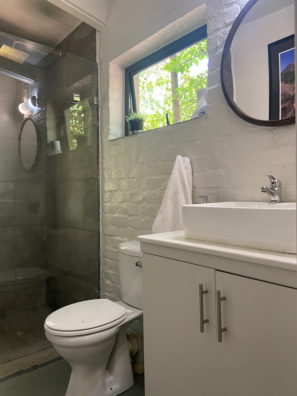 The kitchen is equipped with a 2-plate gas stove, 2 bar fridges, cutlery and crockery as well as tea- and coffee-making facilities. There is a 2-seater dining table where guests can enjoy their meals.