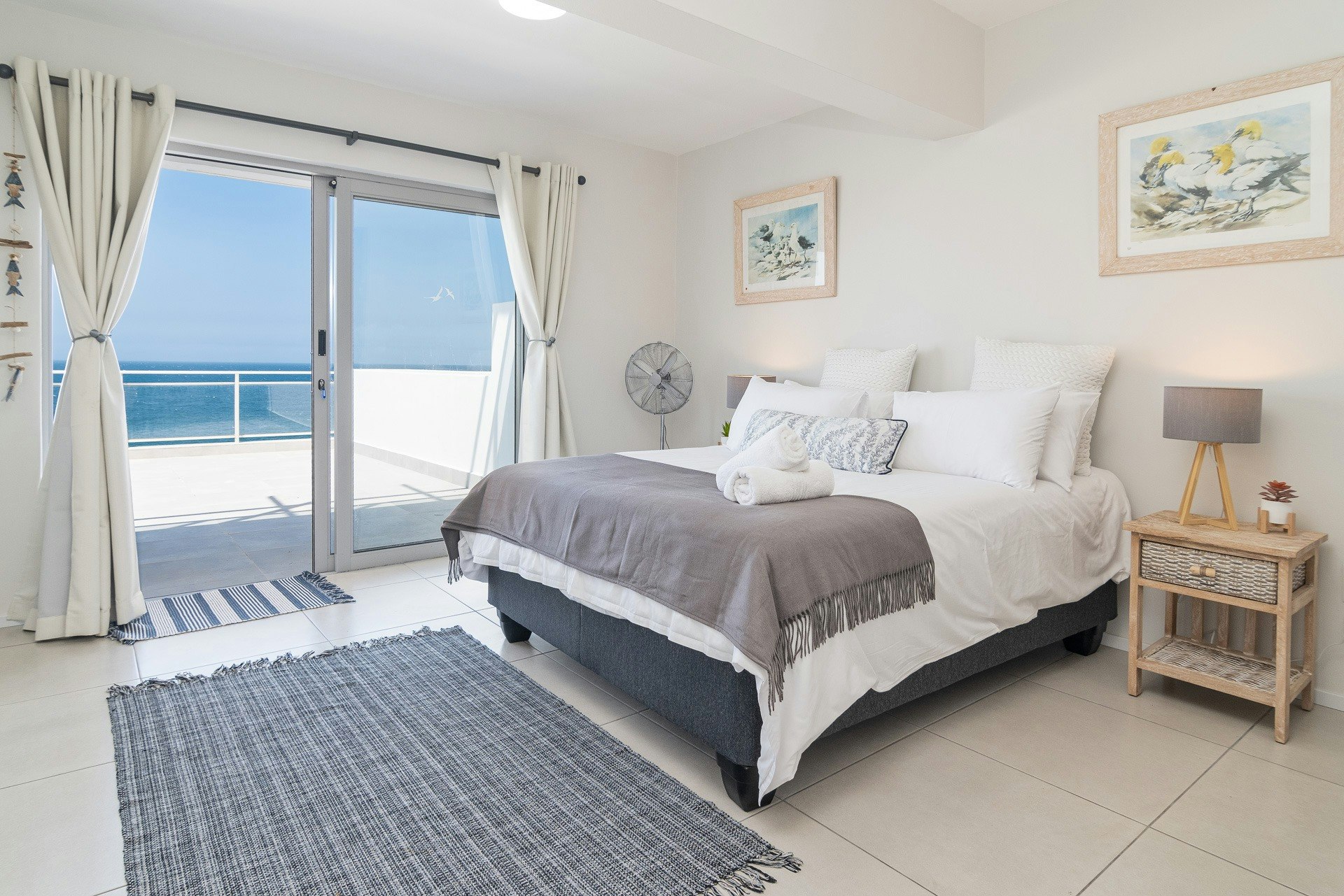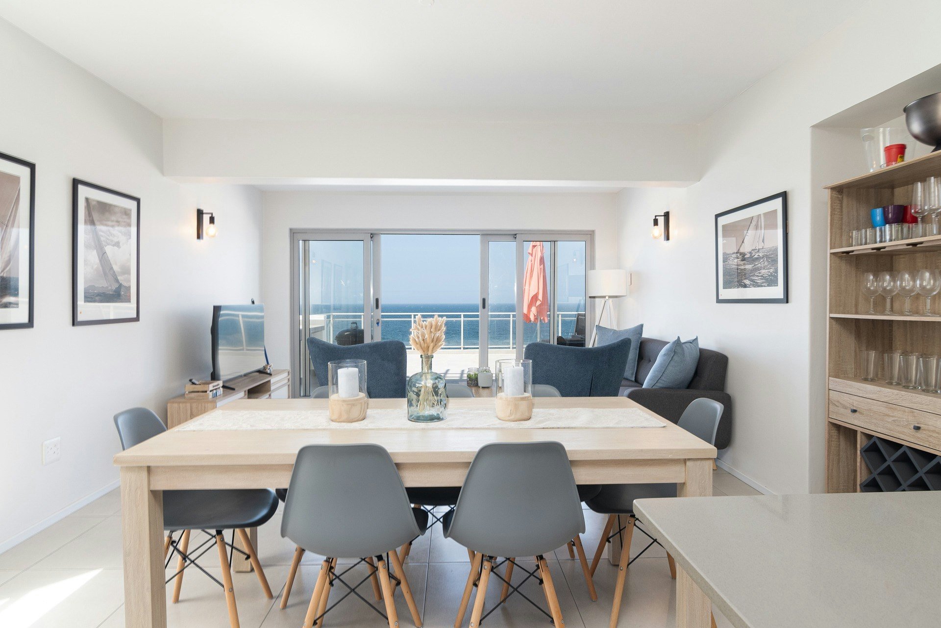 Die kombuis is volledig toegerus met 'n elektriese kookplaat, enkeloond, mikrogolf, broodrooster, ketel, yskas-vrieskas, eetgerei, breekware en 'n skottelgoedwasser. Van die kombuis af lei 'n etenstafel met sitplek vir 6, en langs dit is 'n gemaklike sitkamer met sagte rusbanke en sitplekke, en 'n slim-TV met toegang tot Netflix. WiFi is beskikbaar vir gaste se gerief. Die leefarea maak oop op 'n groot patio met 'n gemaklike patio-sitkamerstel met lugversorging, en dit is waar gaste die see-uitsigte kan bewonder en van die houtskoolbraai kan gebruik maak.