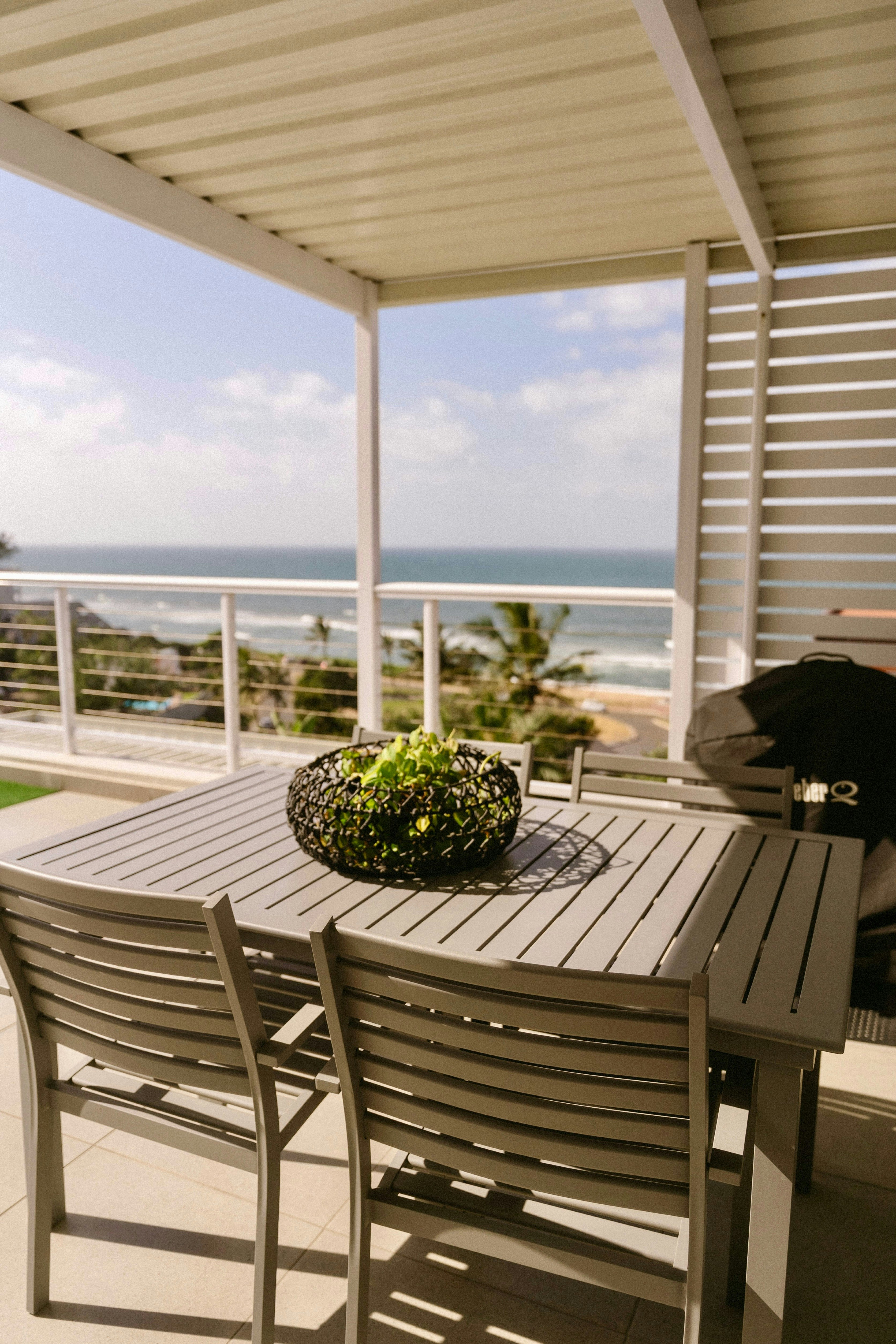 The living area features a stacking door that opens onto a patio with outdoor seating. Additionally, there is a rooftop patio with portable braai facilities and outdoor seating, offering magnificent views. Secure onsite parking is also provided for guests.