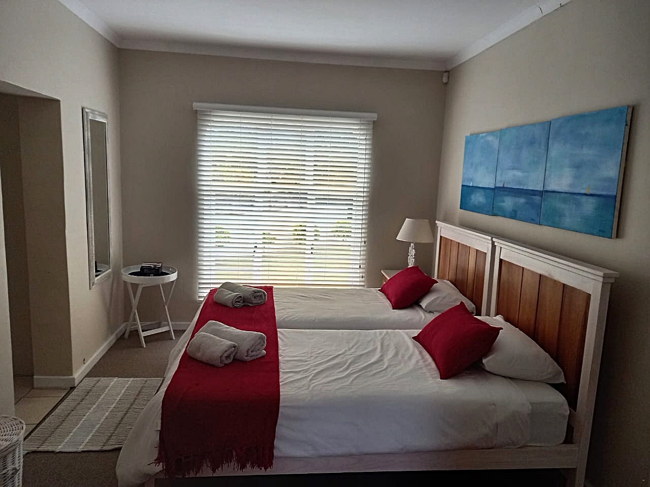 Die dubbelverdiepinghuis bied slaapplek aan 8 gaste en beskik oor 4 slaapkamers, 3 badkamers en 'n gastetoilet. Die hoofslaapkamer het 'n koninggrootte-bed en 'n en suite-badkamer met 'n bad. Die tweede slaapkamer het 2 enkelbeddens en 'n en suite-badkamer met 'n stort. Die ander twee slaapkamers het elk 2 dubbelbeddens en gaste in hierdie slaapkamers deel 'n badkamer met 'n bad en stort. Alle linne en badhanddoeke word voorsien, maar gaste moet hul eie strandhanddoeke saambring.