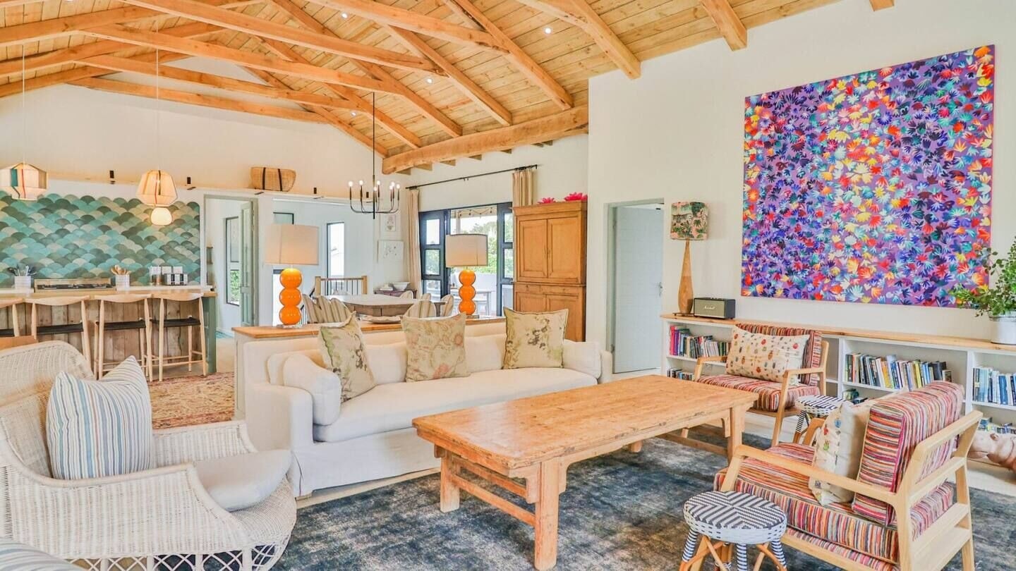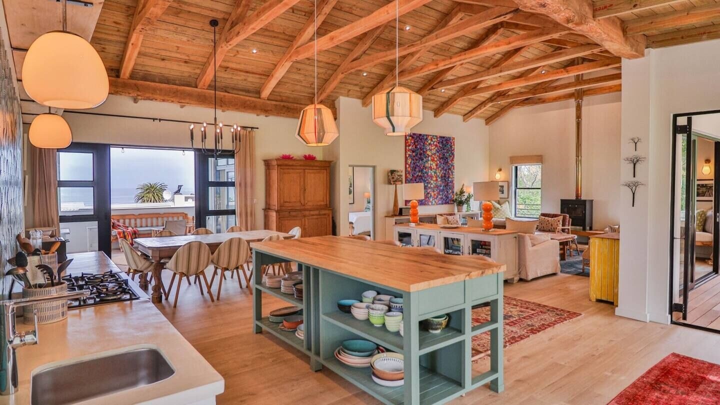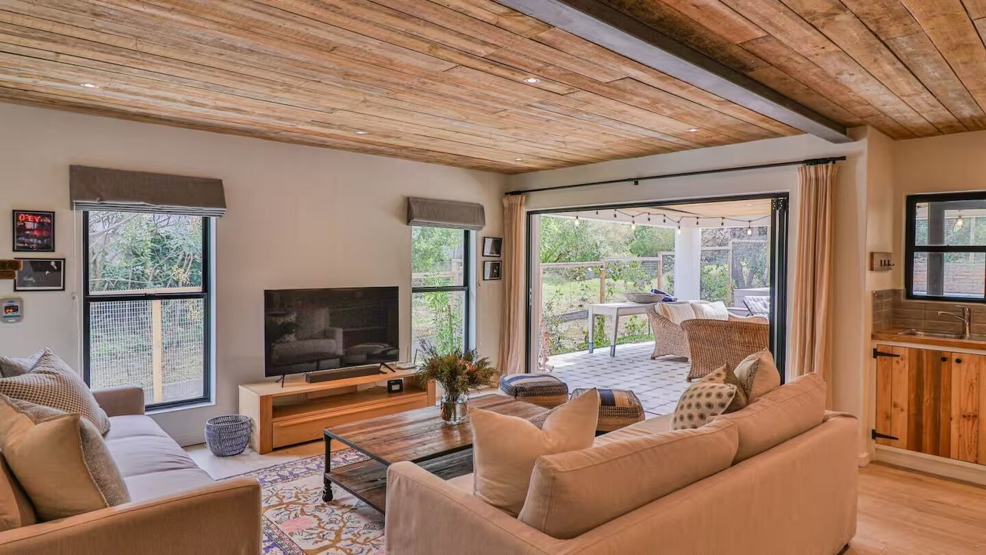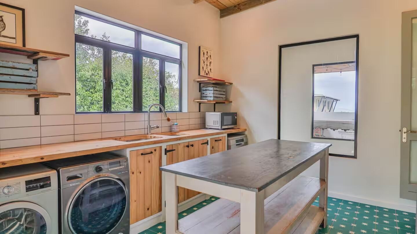 The home’s farmhouse-style open-plan kitchen, dining, and lounge areas provide an ideal space for gatherings. The kitchen includes an integrated fridge-freezer, gas hob, electric oven, microwave, cutlery, crockery, and tea- and coffee-making facilities. A separate scullery offers additional convenience with a dishwasher, washing machine, and tumble dryer. Guests can enjoy a long farmhouse dining table for shared meals. The main lounge features a wood-burning fireplace, while the downstairs TV lounge includes a large Smart TV with DStv and Netflix. A guest bathroom is available on the upper floor.