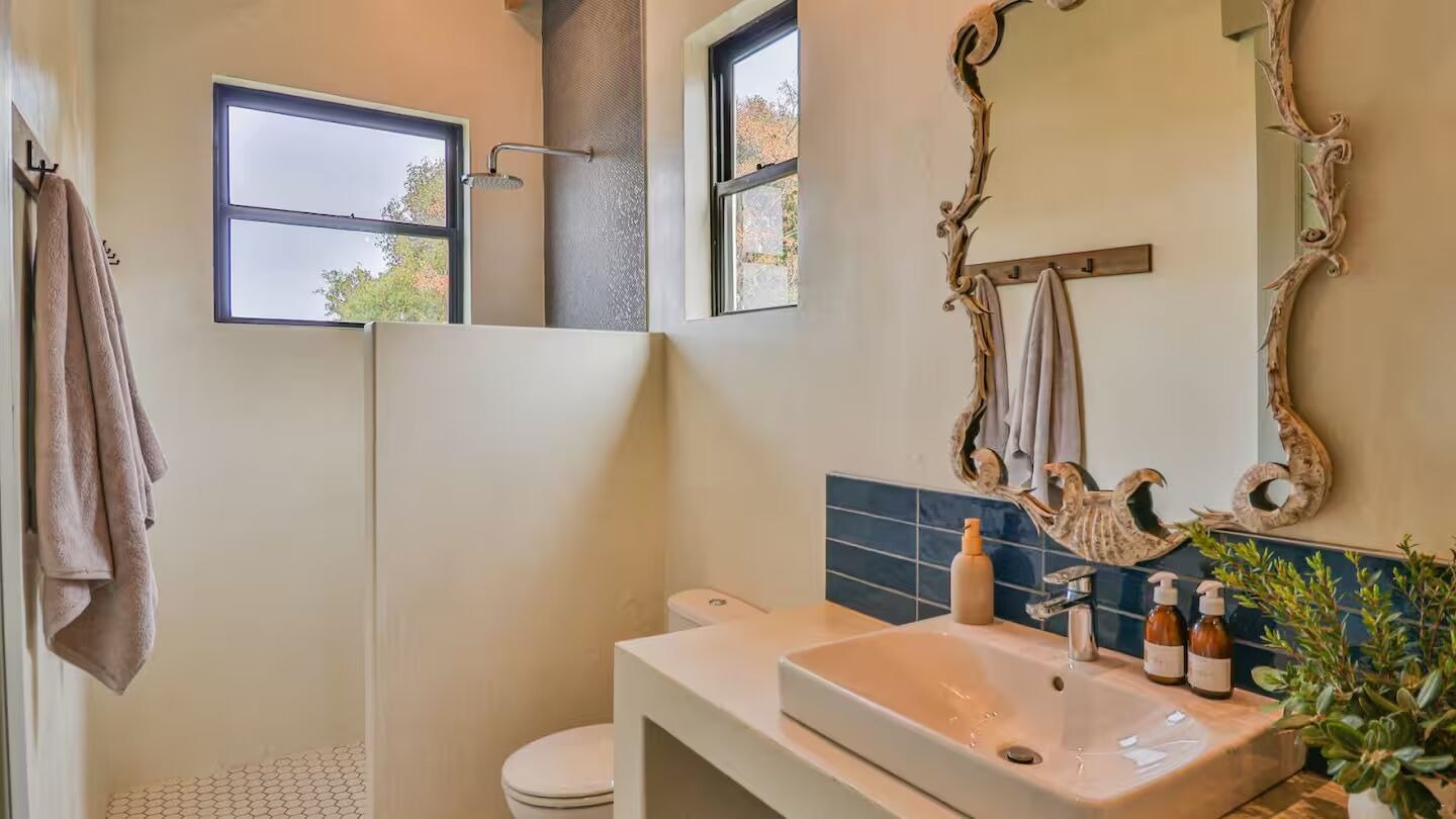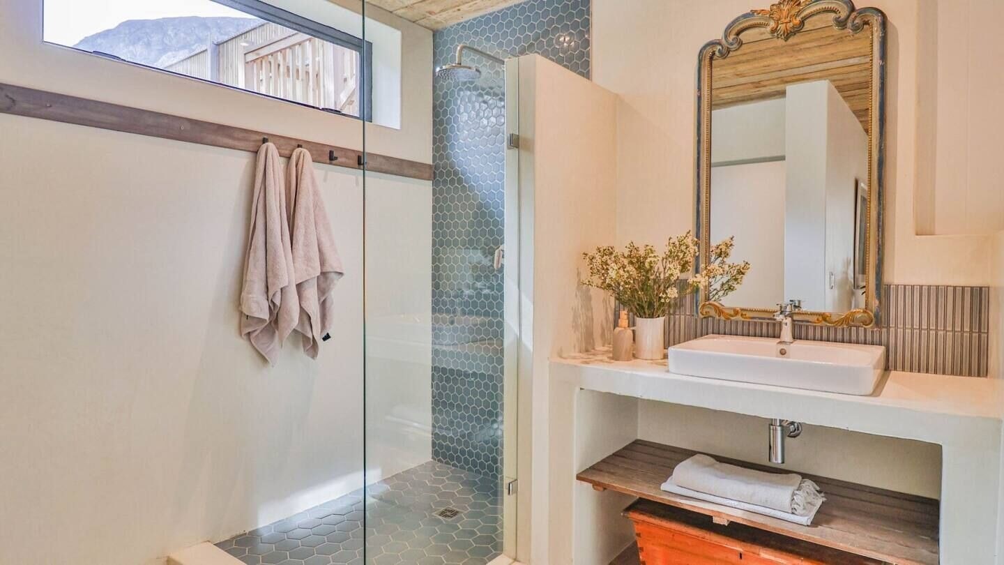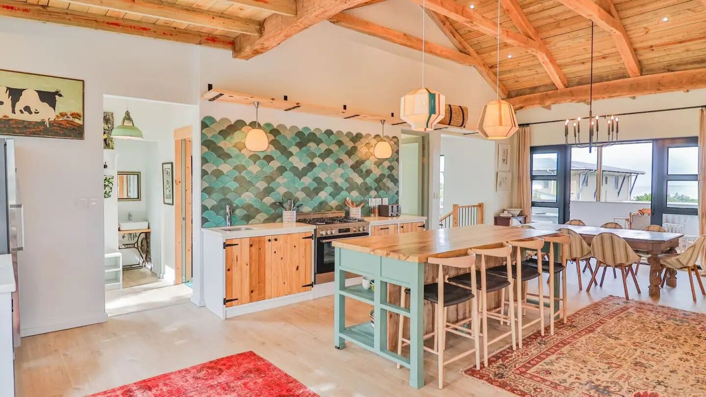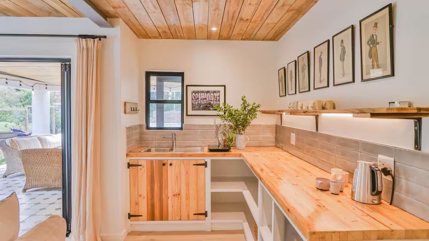 The home’s farmhouse-style open-plan kitchen, dining, and lounge areas provide an ideal space for gatherings. The kitchen includes an integrated fridge-freezer, gas hob, electric oven, microwave, cutlery, crockery, and tea- and coffee-making facilities. A separate scullery offers additional convenience with a dishwasher, washing machine, and tumble dryer. Guests can enjoy a long farmhouse dining table for shared meals. The main lounge features a wood-burning fireplace, while the downstairs TV lounge includes a large Smart TV with DStv and Netflix. A guest bathroom is available on the upper floor.
