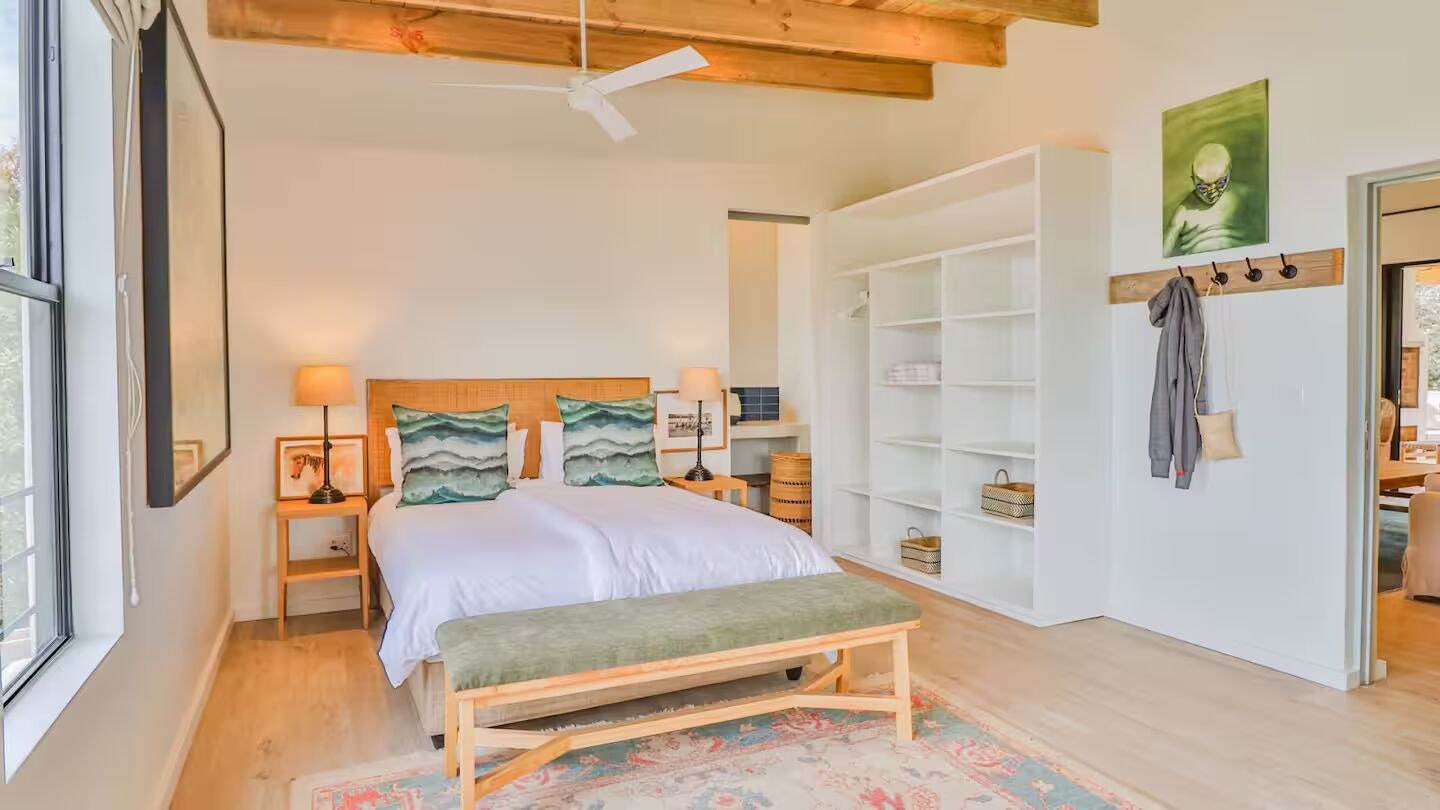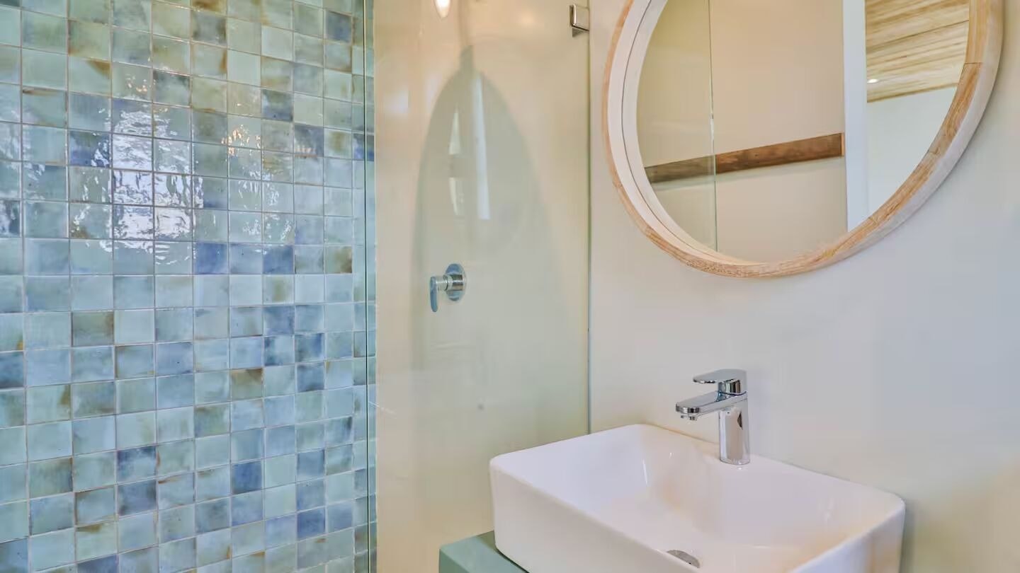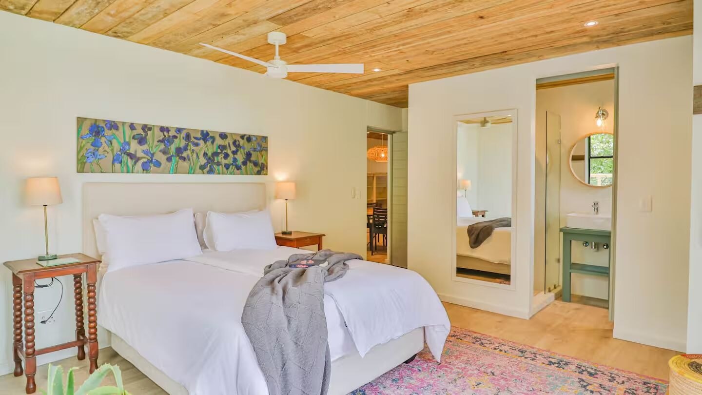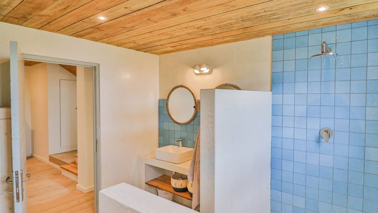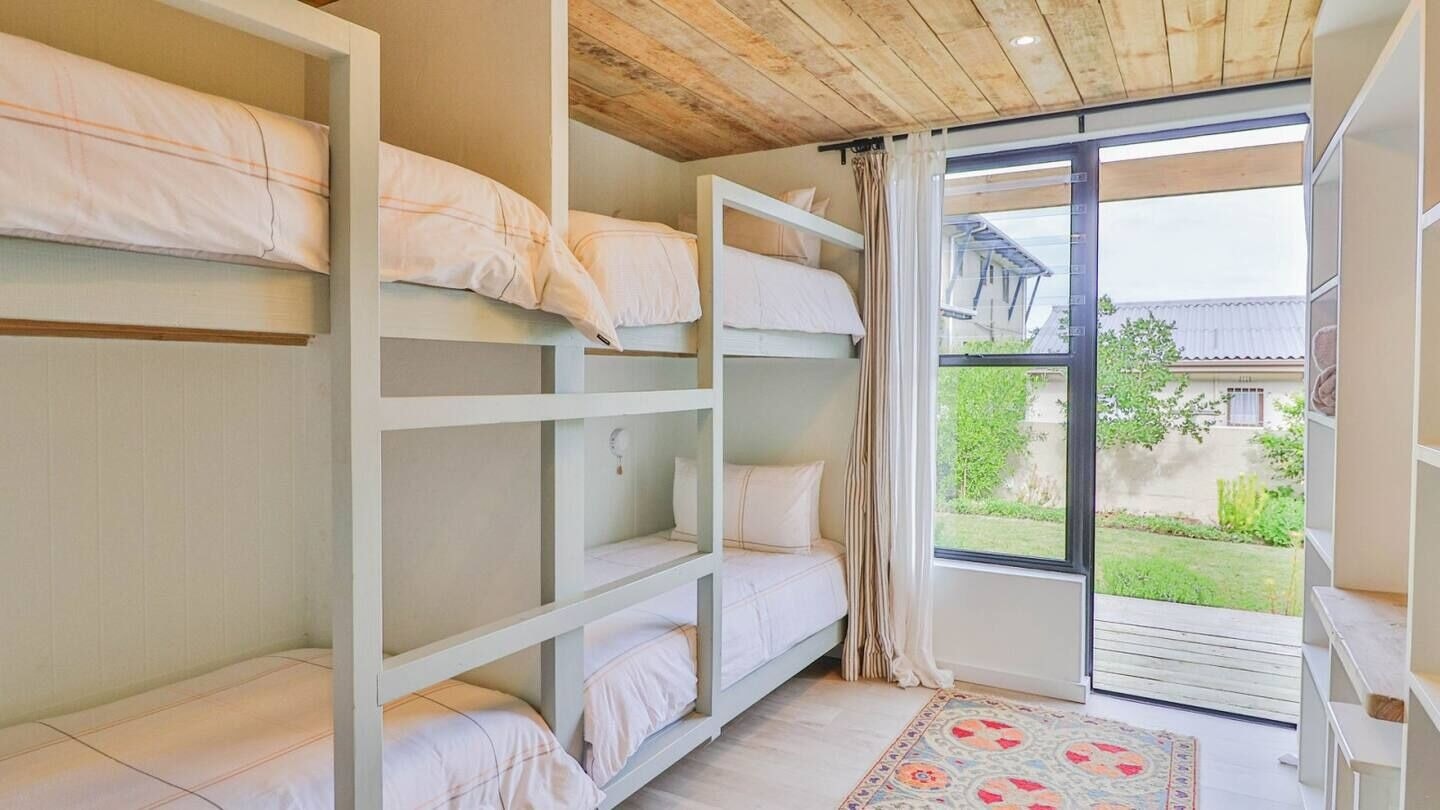 The main bedroom on the upper floor features a queen-size bed, work desk, en-suite bathroom with shower, and access to a sea-facing balcony with ocean and garden views. The second bedroom on the lower level offers a queen-size bed and a spacious en-suite bathroom with a shower, opening onto the covered patio and pool area. The third bedroom, also with a queen-size bed and en-suite shower, opens to the lower deck and is situated adjacent to the TV lounge. The fourth bedroom has 2 single beds and shares a bathroom with the fifth bedroom, which includes two built-in adult-size bunk beds. Both rooms open onto the lower deck. Linen and towels are provided.