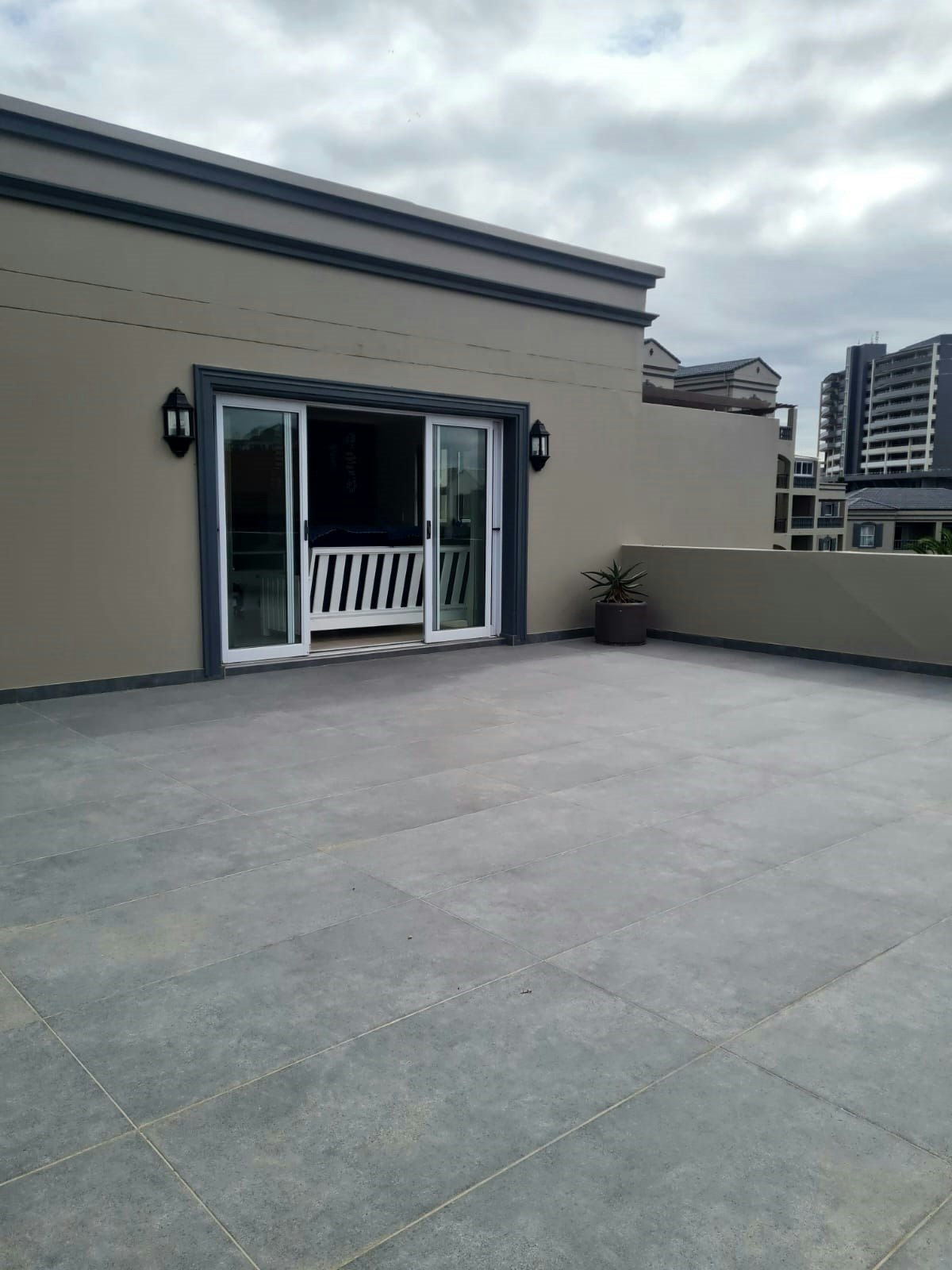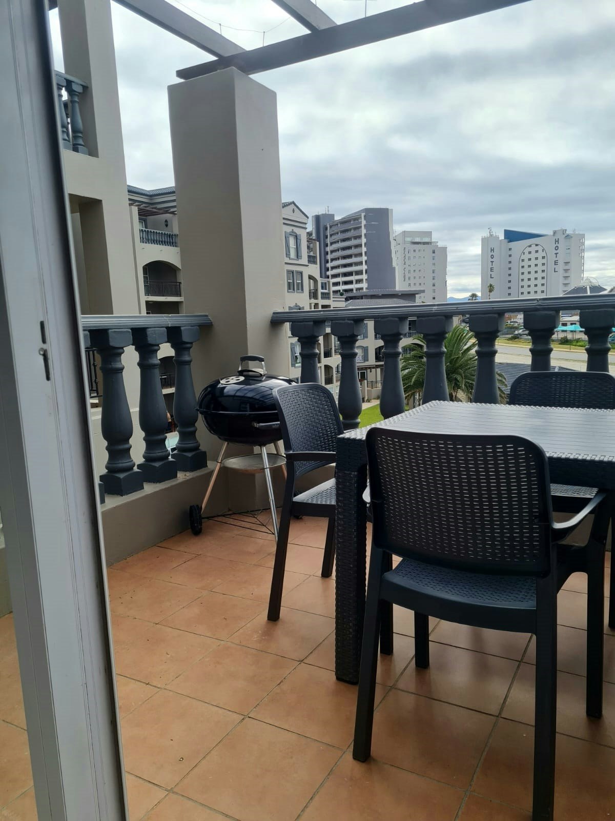 Through the sliding doors, there is a lovely patio with outdoor seating and a Weber braai. Please note this unit does not have a sea view however guests may make use of the communal swimming pool of the complex.