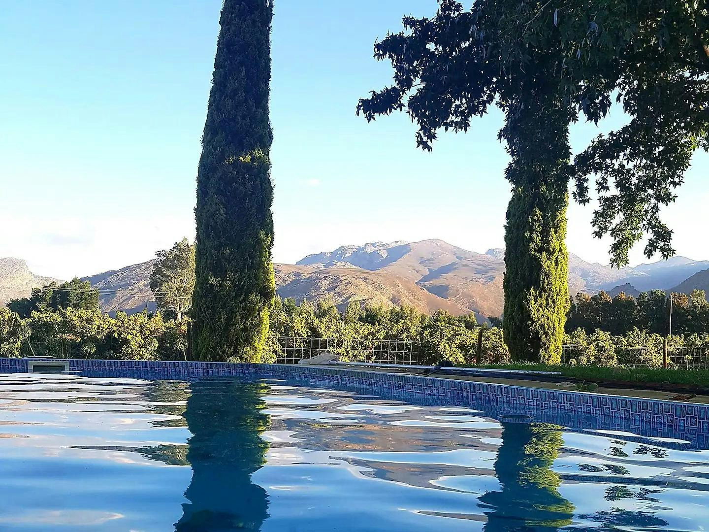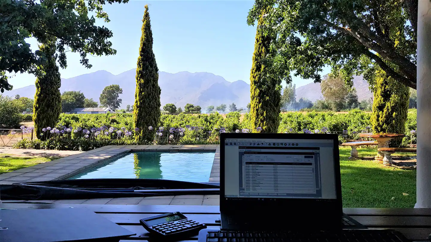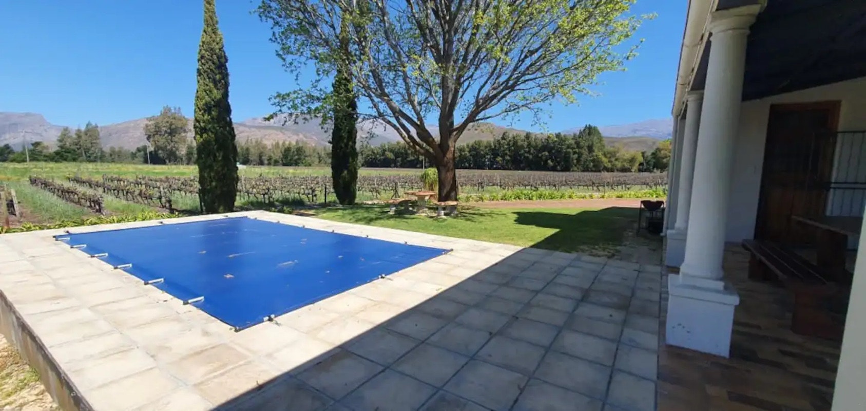 The living area opens up to the outdoor entertainment area, offering breathtaking vistas of the mountains and wine farms. The patio features a swimming pool, a dining area, and a free-standing braai.