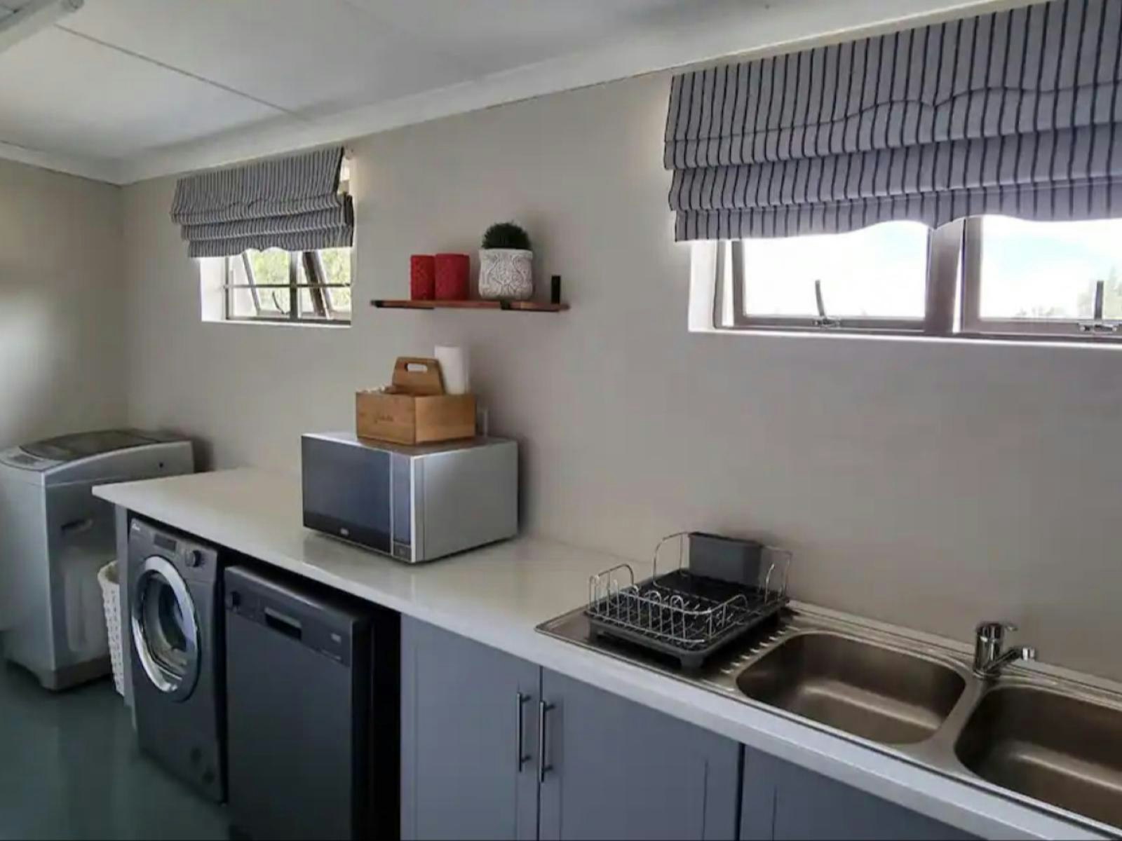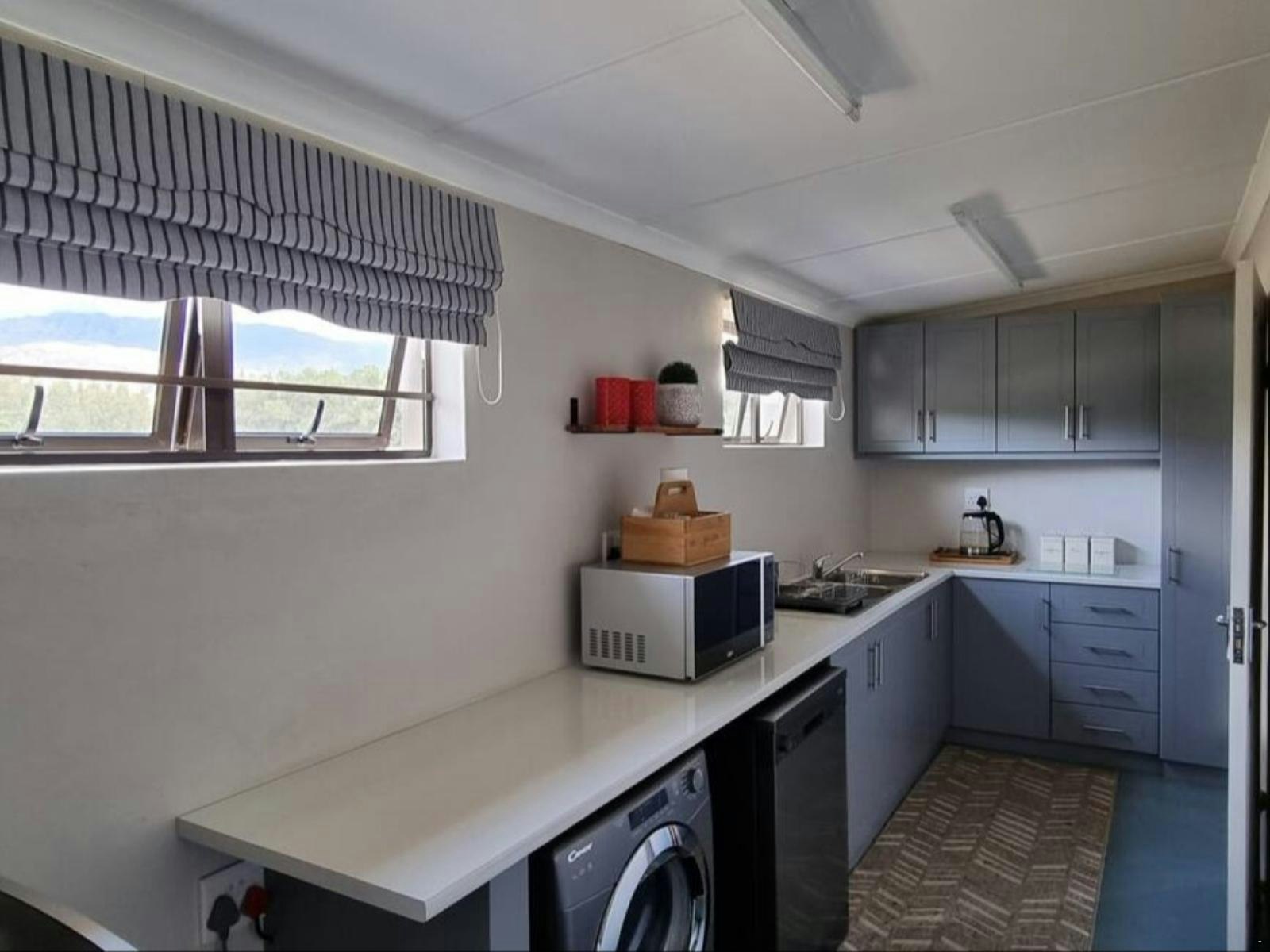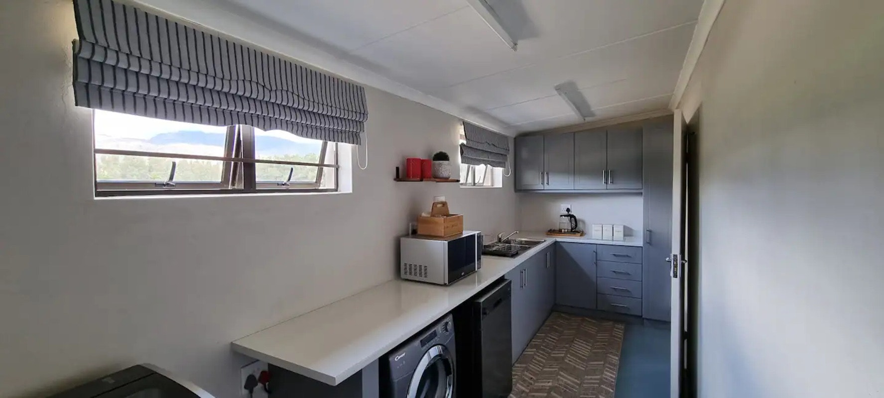 The open-plan living area features a lounge and a kitchen. The kitchen is equipped with a stove, oven, fridge-freezer, tea- and coffee-making facilities and cutlery and crockery. The kitchen has a scullery with a microwave, a dishwasher, a tumble dryer and a washing machine. The lounge is furnished with a comfortable lounge suite, a coffee table, a built-in braai and a gas stove. Access to free Wi-Fi is available.
