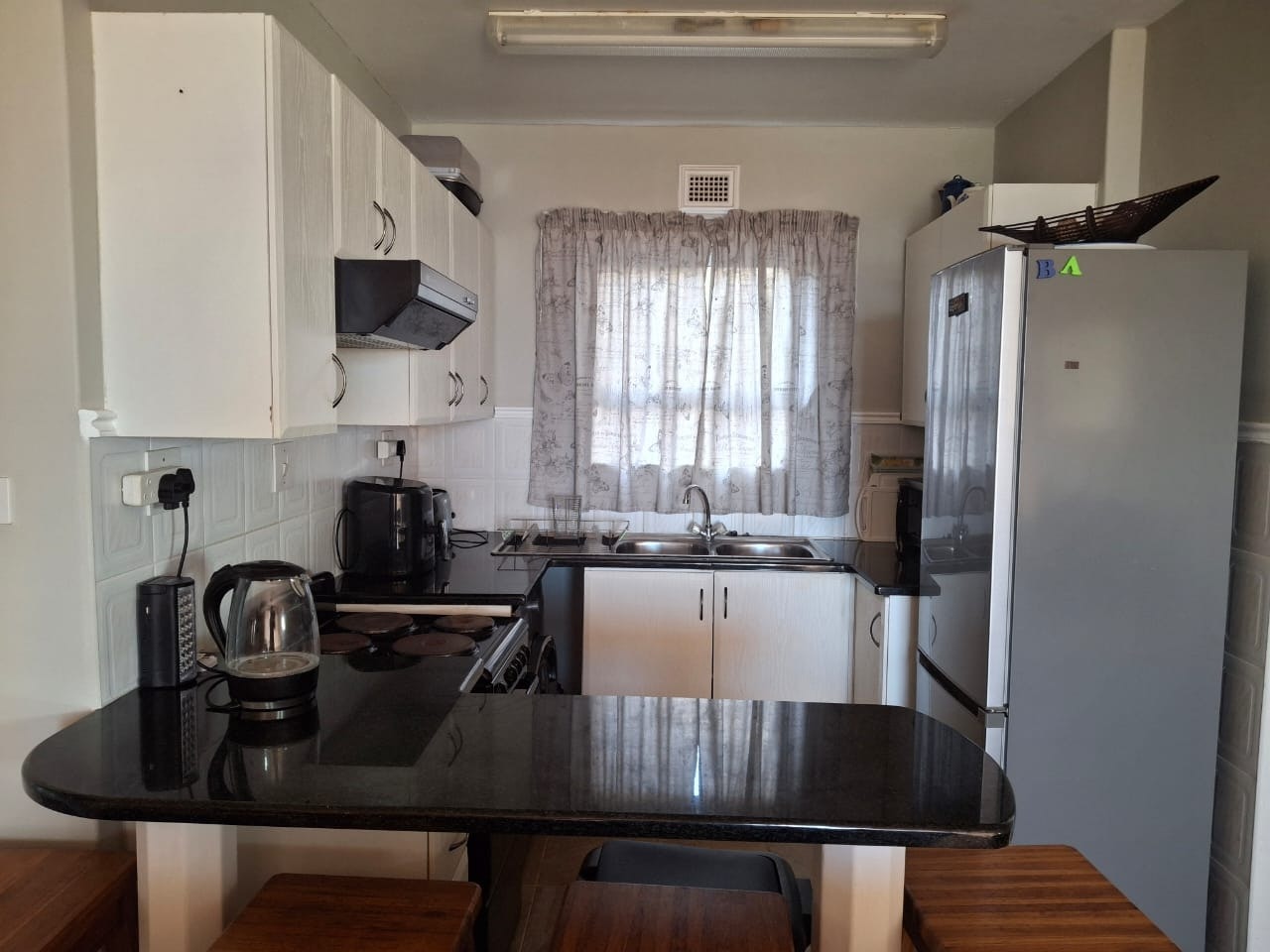 The unit features a fully equipped kitchen, including a stove, oven, microwave, fridge-freezer, kettle, toaster, cutlery, and crockery. The breakfast seating area flows into a spacious lounge with comfortable couches, a flat-screen TV, ceiling fans, and unlimited Wi-Fi access. This living area opens onto a patio with sea views, where a gas braai is provided.
