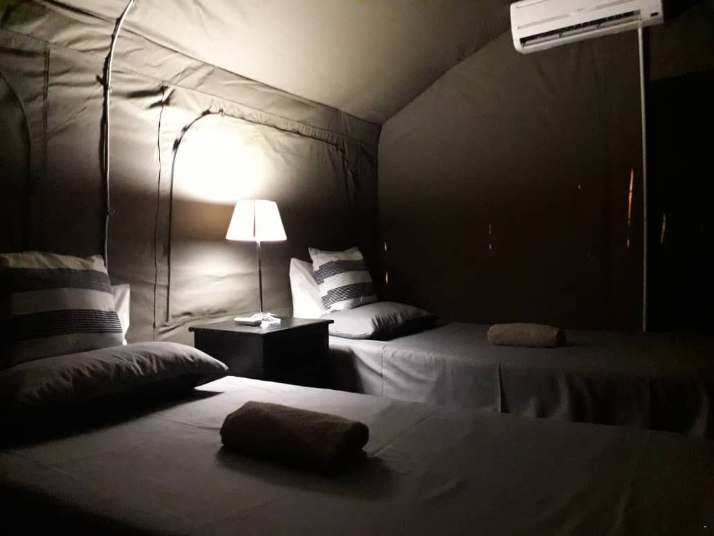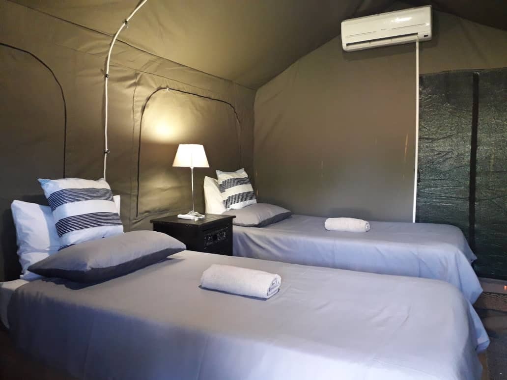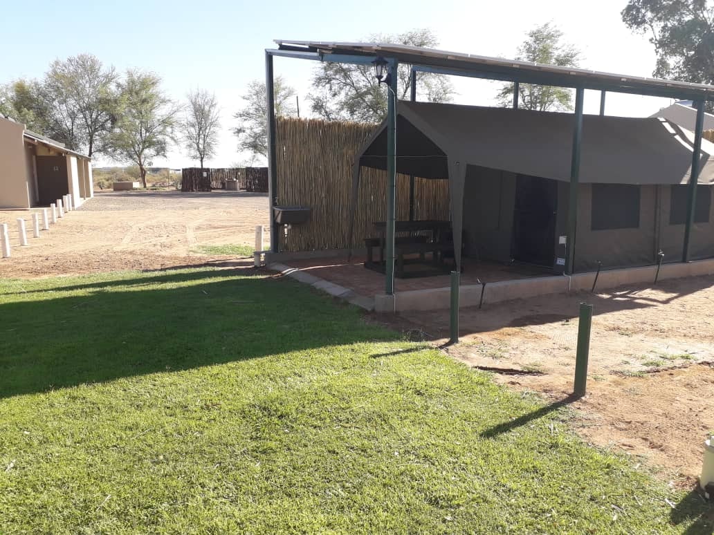Die tentkamp het 2 enkelbeddens, lugversorging, beddegoed, handdoeke, WiFi, 'n ketel, tee en koffie, koppies, glase, messe, vurke, borde en braaitoerusting. Daar is 'n grasperkie voor die tent met 'n braaiplekkie, 'n piekniektafel en 'n wasbak. Die tent het nie sy eie toilet en stort nie, maar gebruik die kampeerterrein se ablusieblok net 'n paar treë verder.