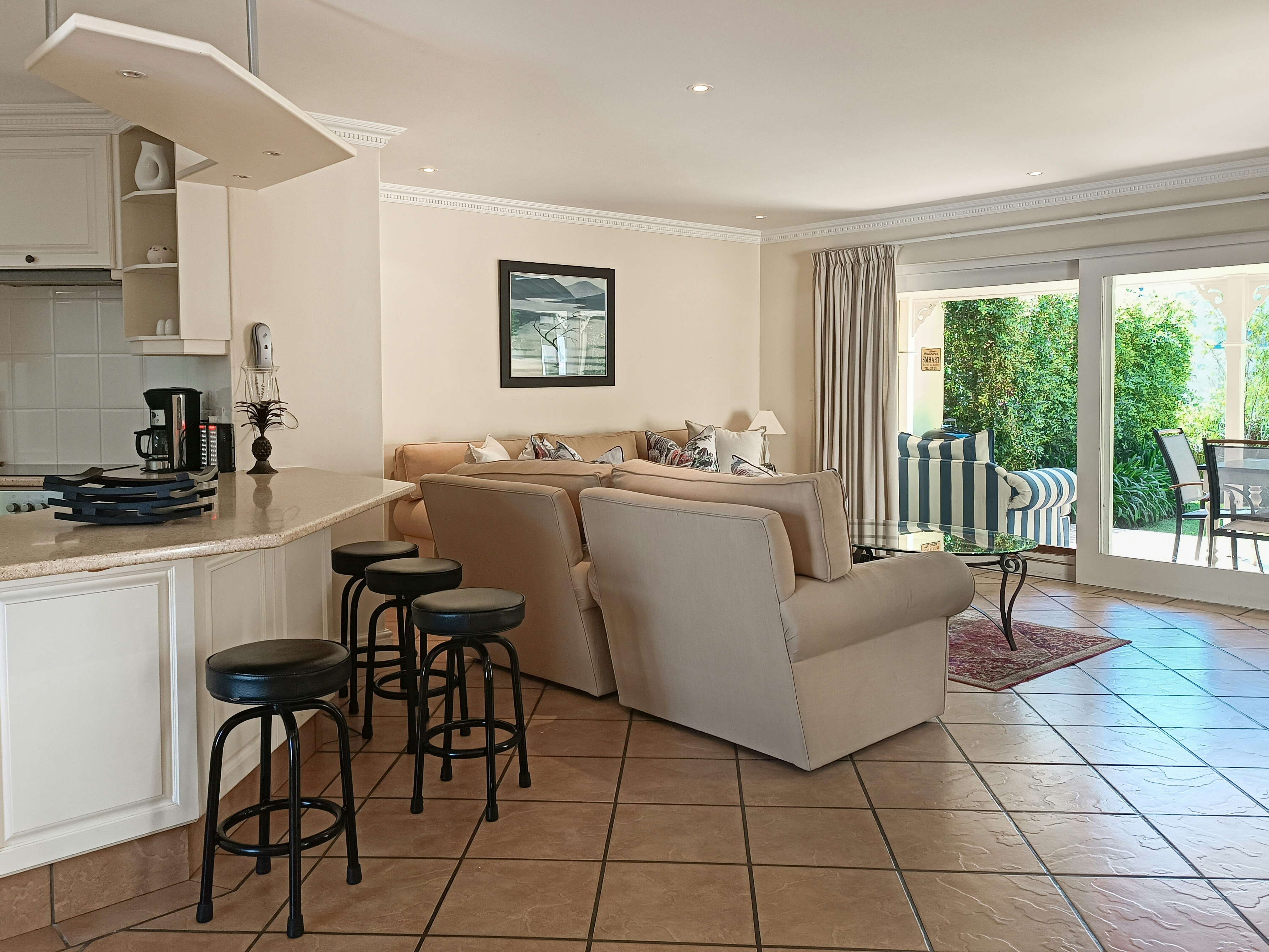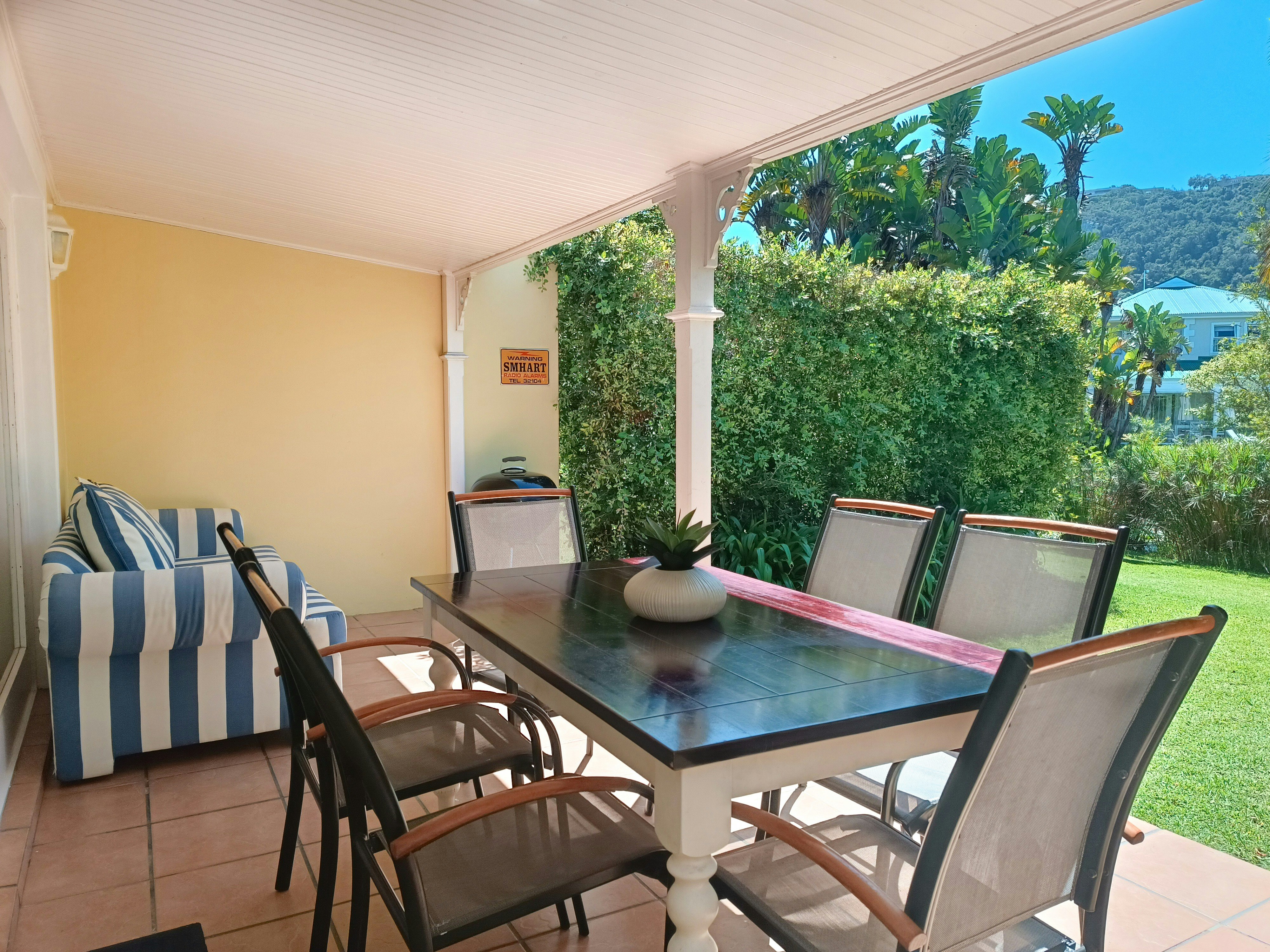Op die onderste verdieping is daar 'n oopplan-kombuis, -eetarea en -sitarea wat na 'n onderdakstoep met 'n uitsig oor die gemeenskaplike dam en goedversorgde tuin lei. Die sitarea het 'n TV met DStv Now en Netflix, Gaste kan met hulle eie besonderhede inteken om dit te kyk. Onbeperkte WiFi is ook beskikbaar. Die enkelmotorhuis is beskikbaar om branderplanke of fietse te stoor. Parkeerplek vir 1 voertuig direk voor die eenheid en 'n besoekersparkeerplek is beskikbaar.