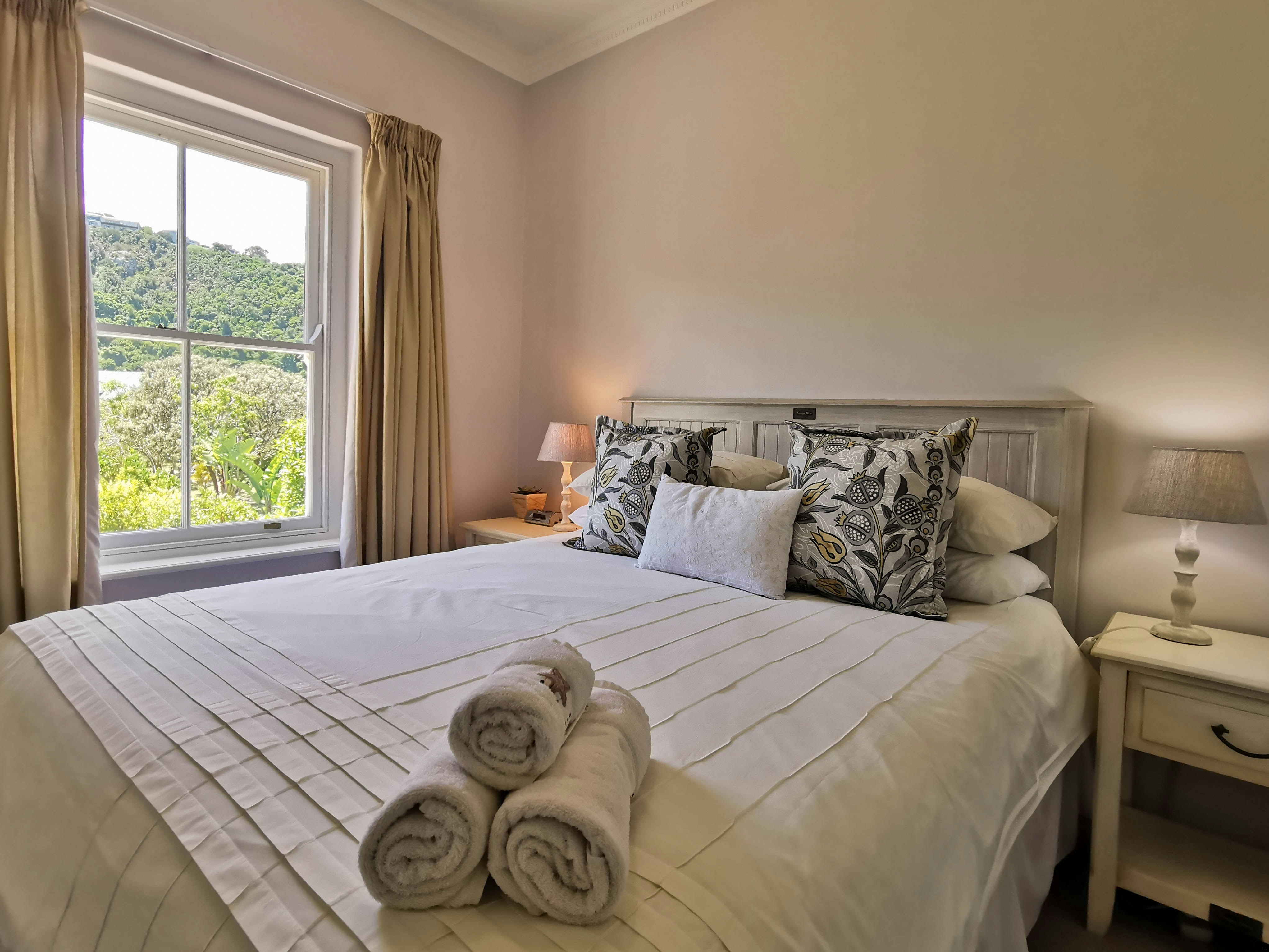 Die slaapkamers en badkamers is op die boonste verdieping. Die eerste slaapkamer het 'n koningingrootte-bed, 'n en suite-badkamer met 'n stort-oor-bad en 'n toilet en 'n slim-TV. Dié kamer bied toegang tot 'n balkon wat oor 'n dam en netjiese tuine kyk. Die tweede slaapkamer het 2 enkelbeddens en maak oop op 'n balkon. Die derde slaapkamer het 'n koningingrootte-bed. Die 2 kamers deel 'n badkamer met 'n stort en 'n toilet.