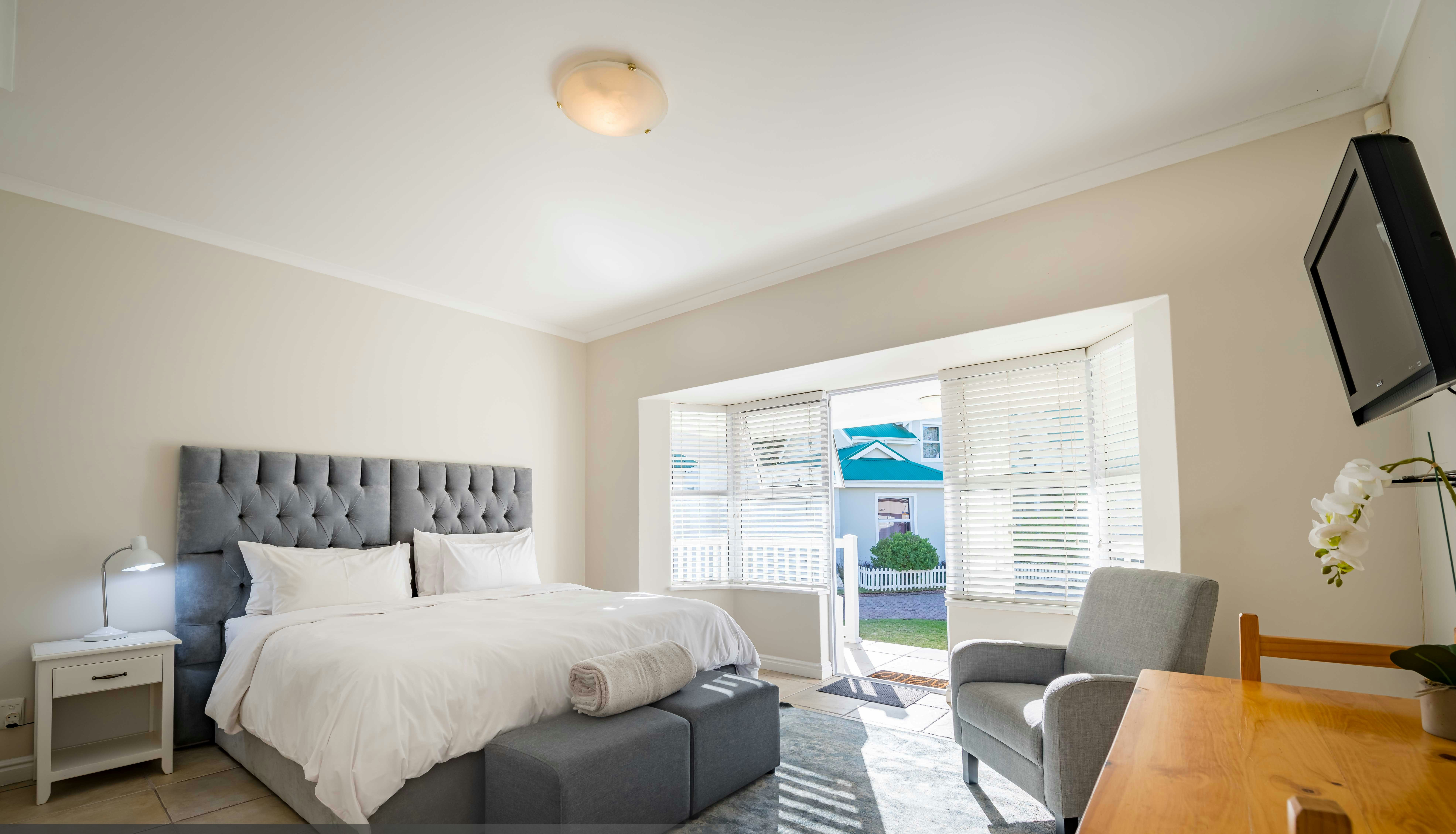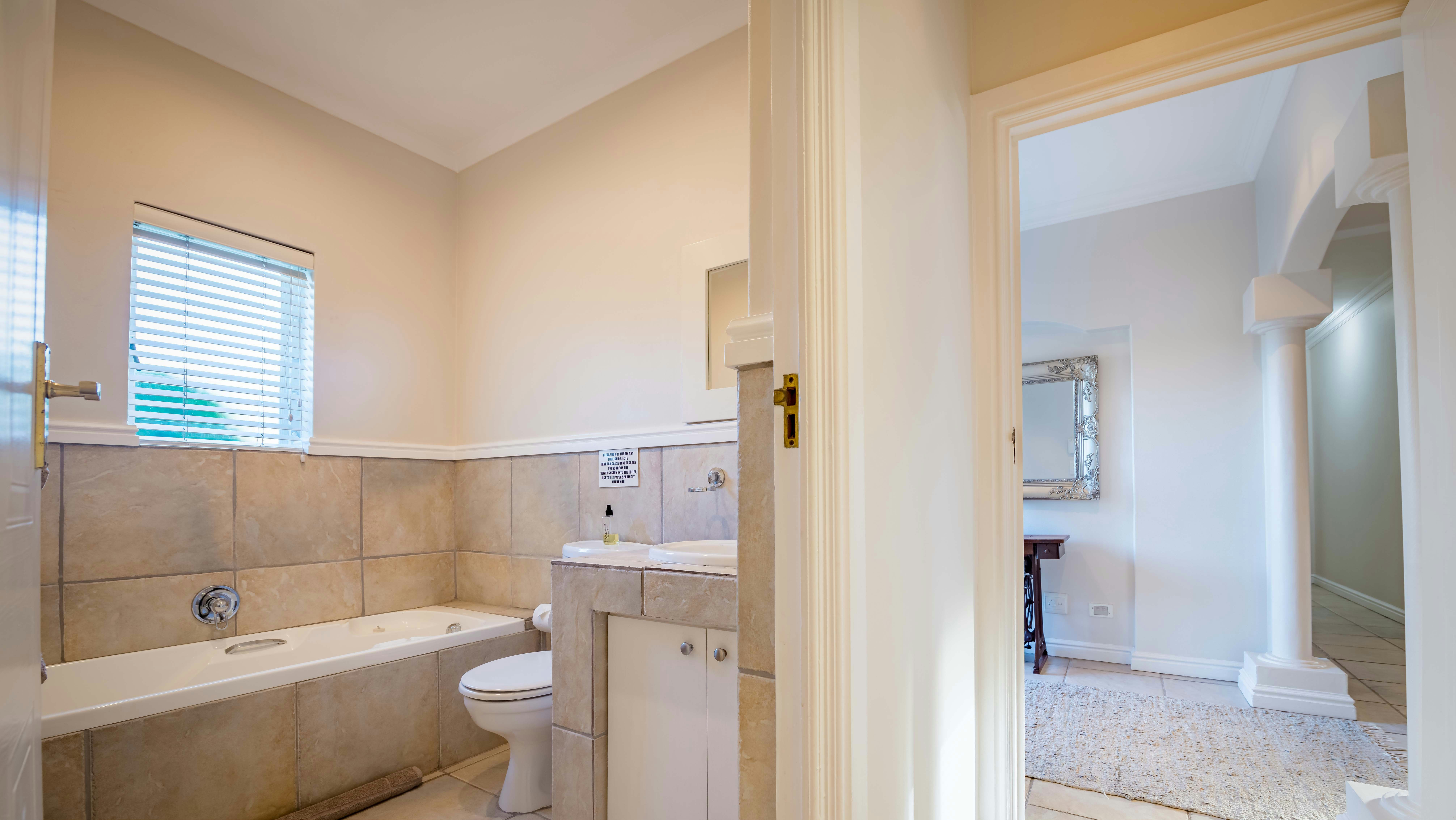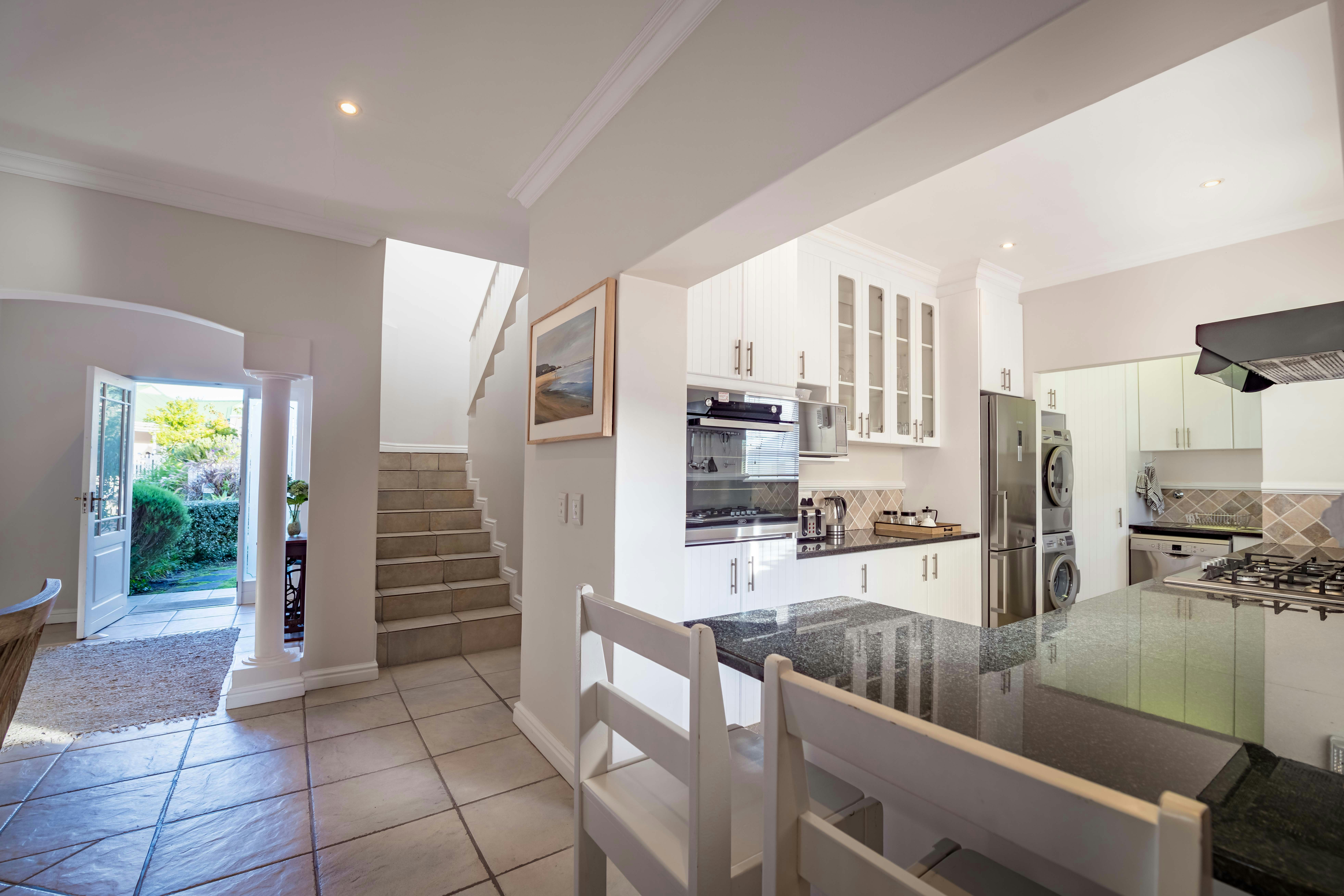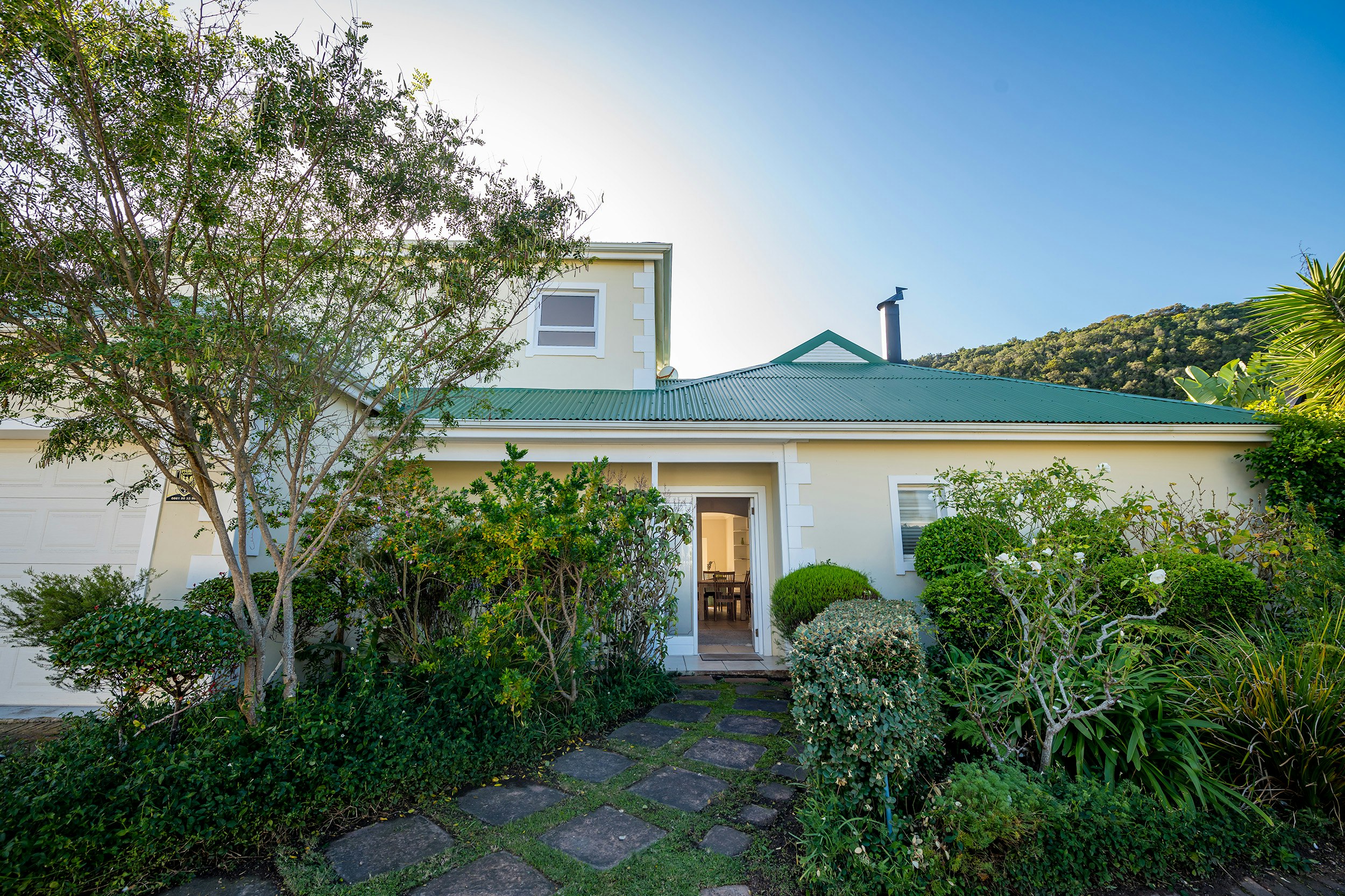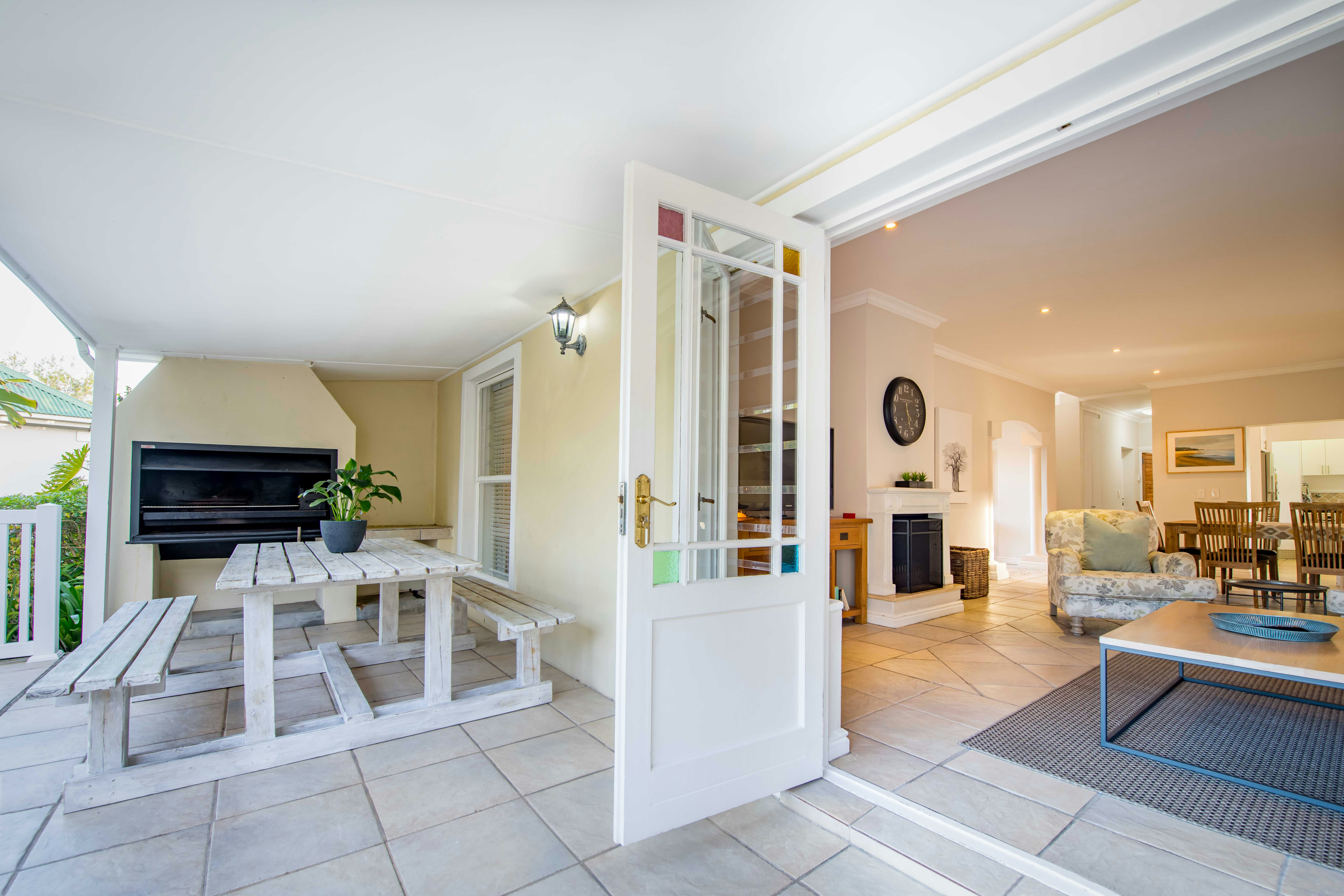 Leading through double doors is a covered patio with a built-in braai, outside dining table and picnic bench. A well-kept private garden leads off the patio to a short boardwalk not too far from the beautiful river. This home is installed with an inverter which keeps the TV and Wi-Fi running. Rechargeable emergency lights are also provided and guests are afforded secure parking.