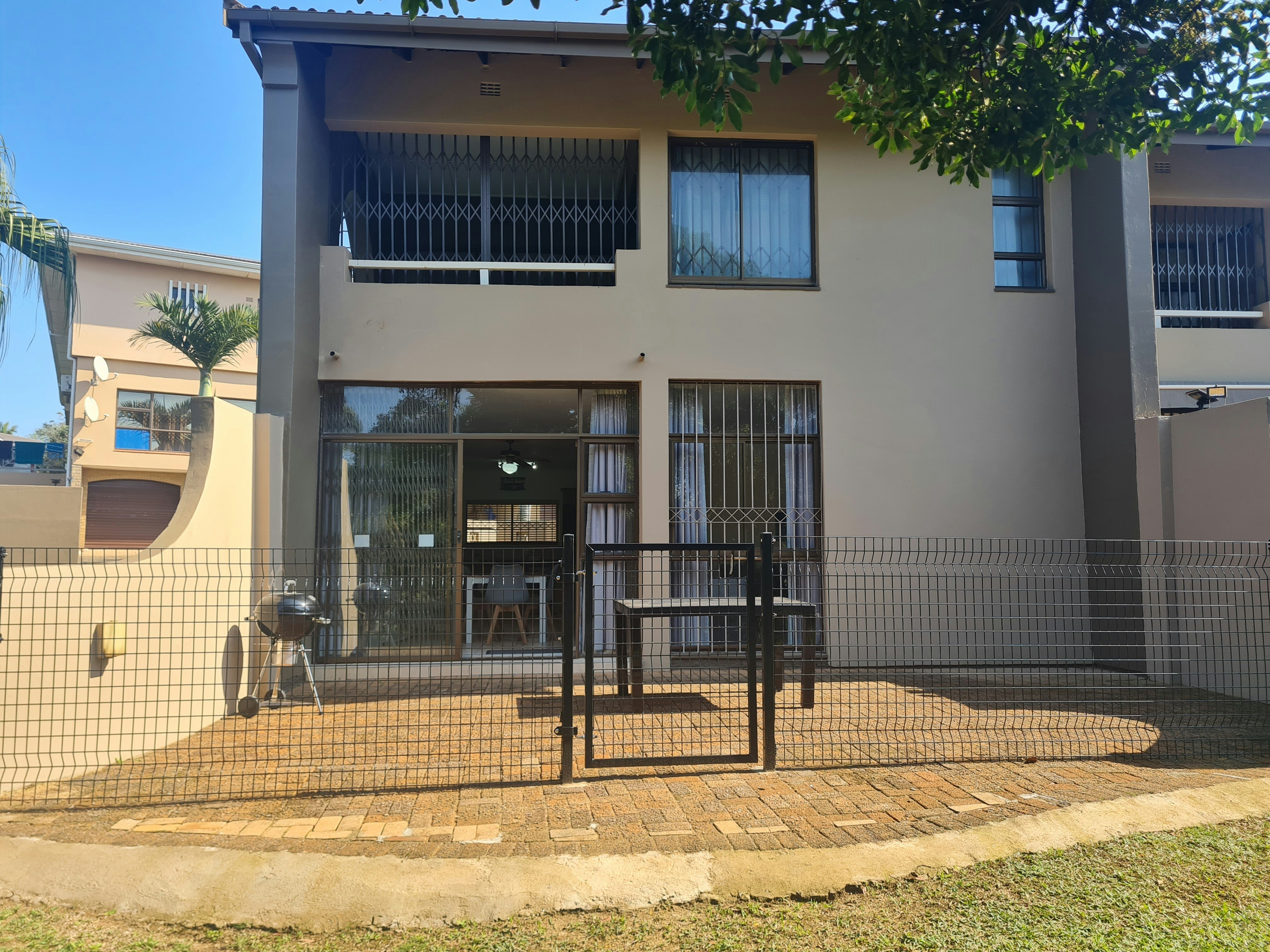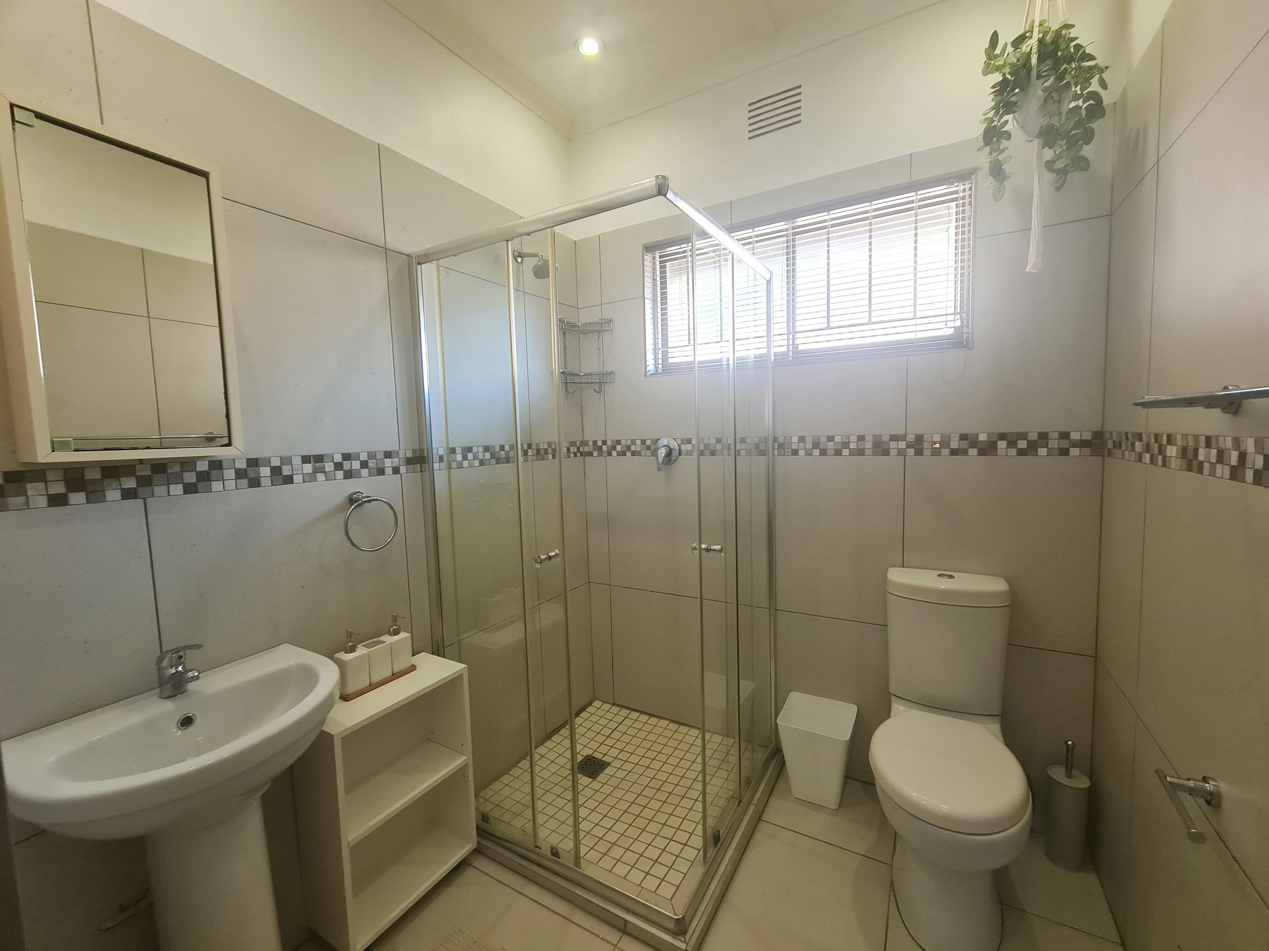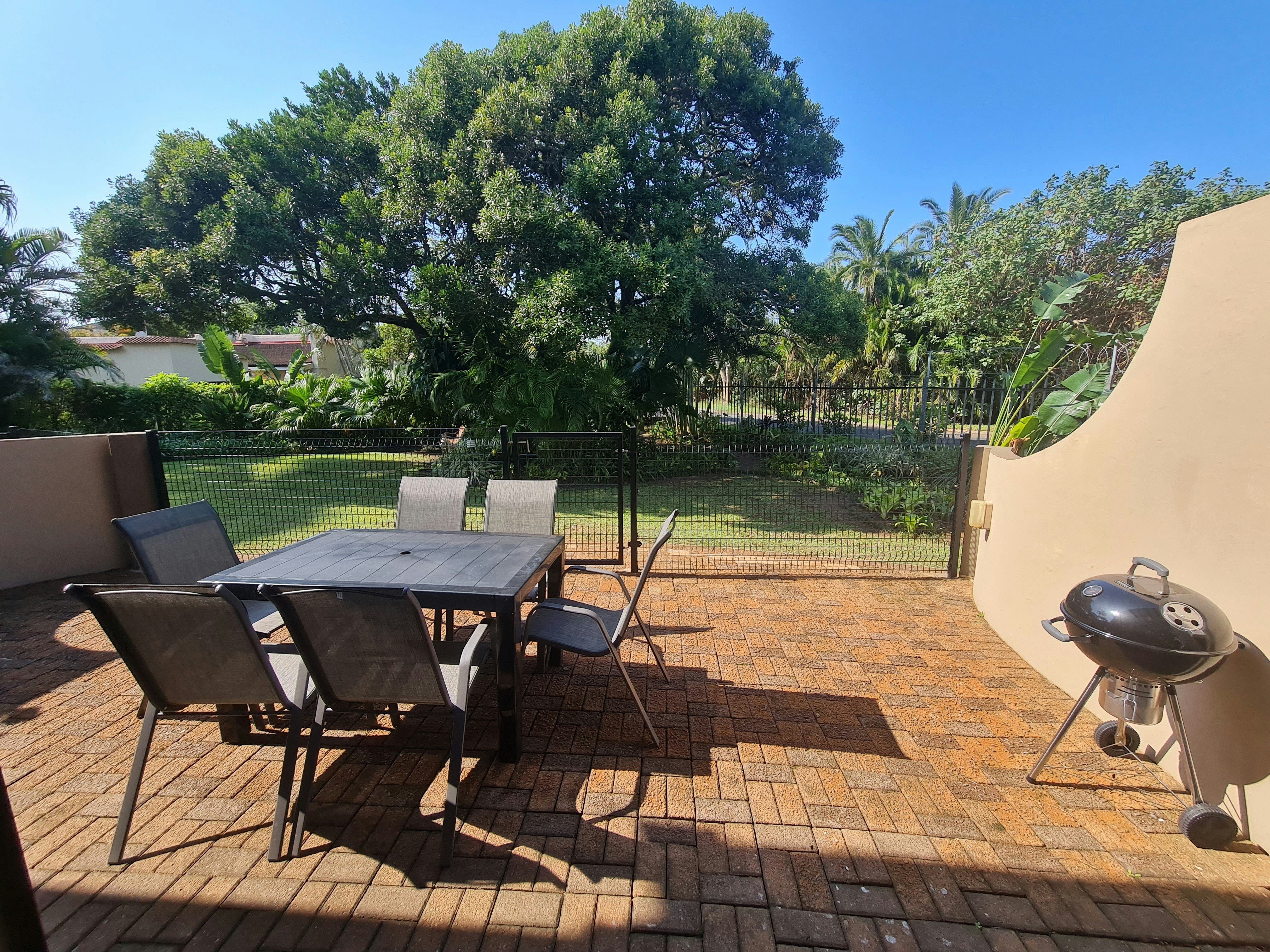 The lounge leads out to a small enclosed patio, furnished with a patio table, chairs, and a Weber braai for guest use. This secure patio area is perfect for small pets. Guests also have access to a designated lock-up garage for added convenience.