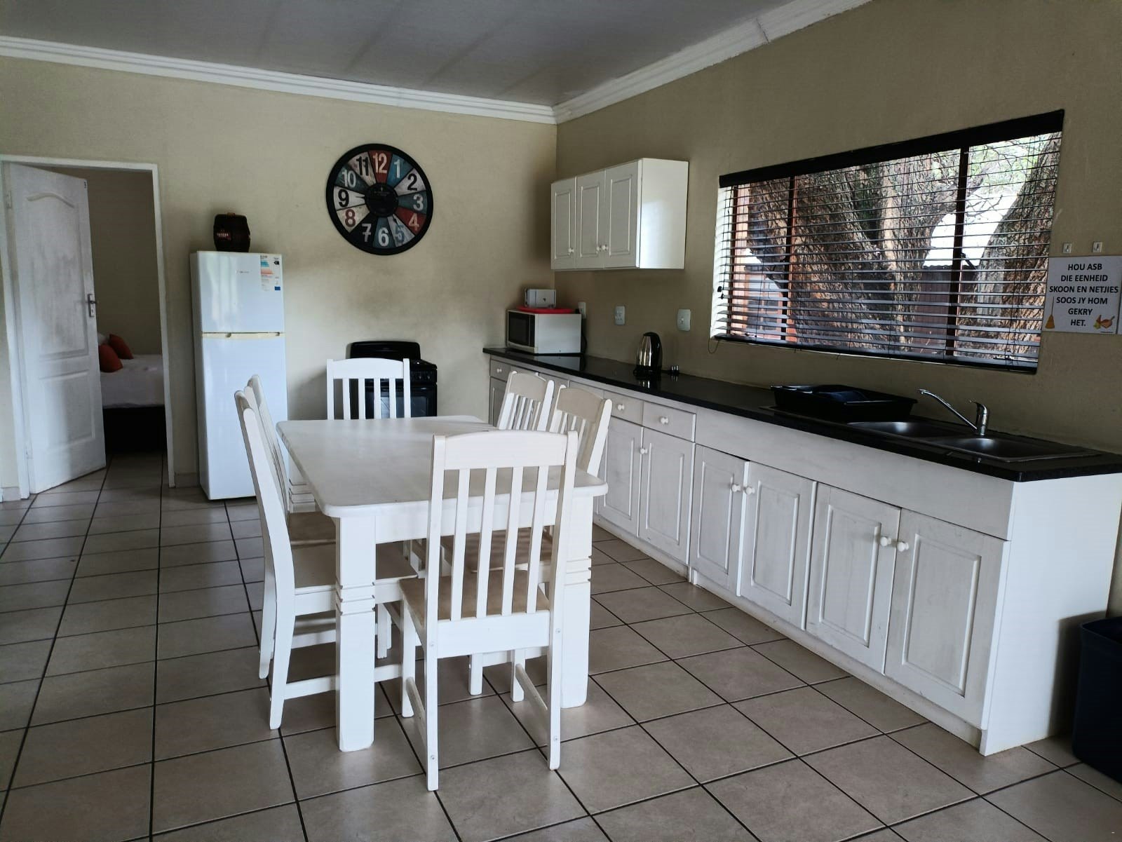 Die kombuis is volledig toegerus vir selfsorg en sluit 'n stoof, oond, yskas-vrieskas, mikrogolfoond, eetgerei en breekware in. Die leefarea spog met 'n etenstafel, gemaklike sitplek en 'n binnenshuise kaggel.