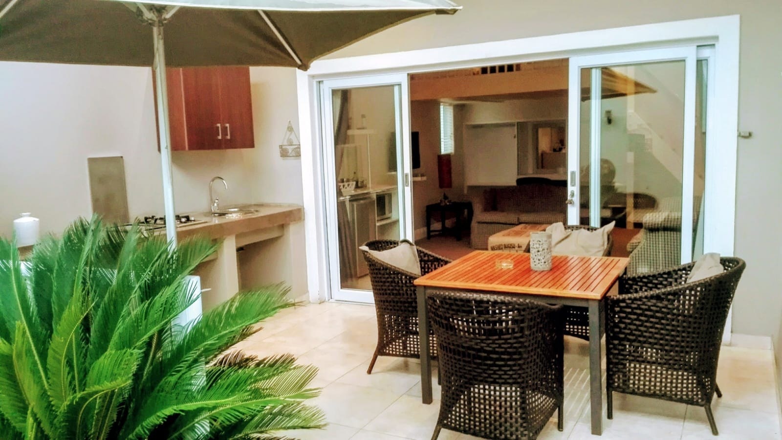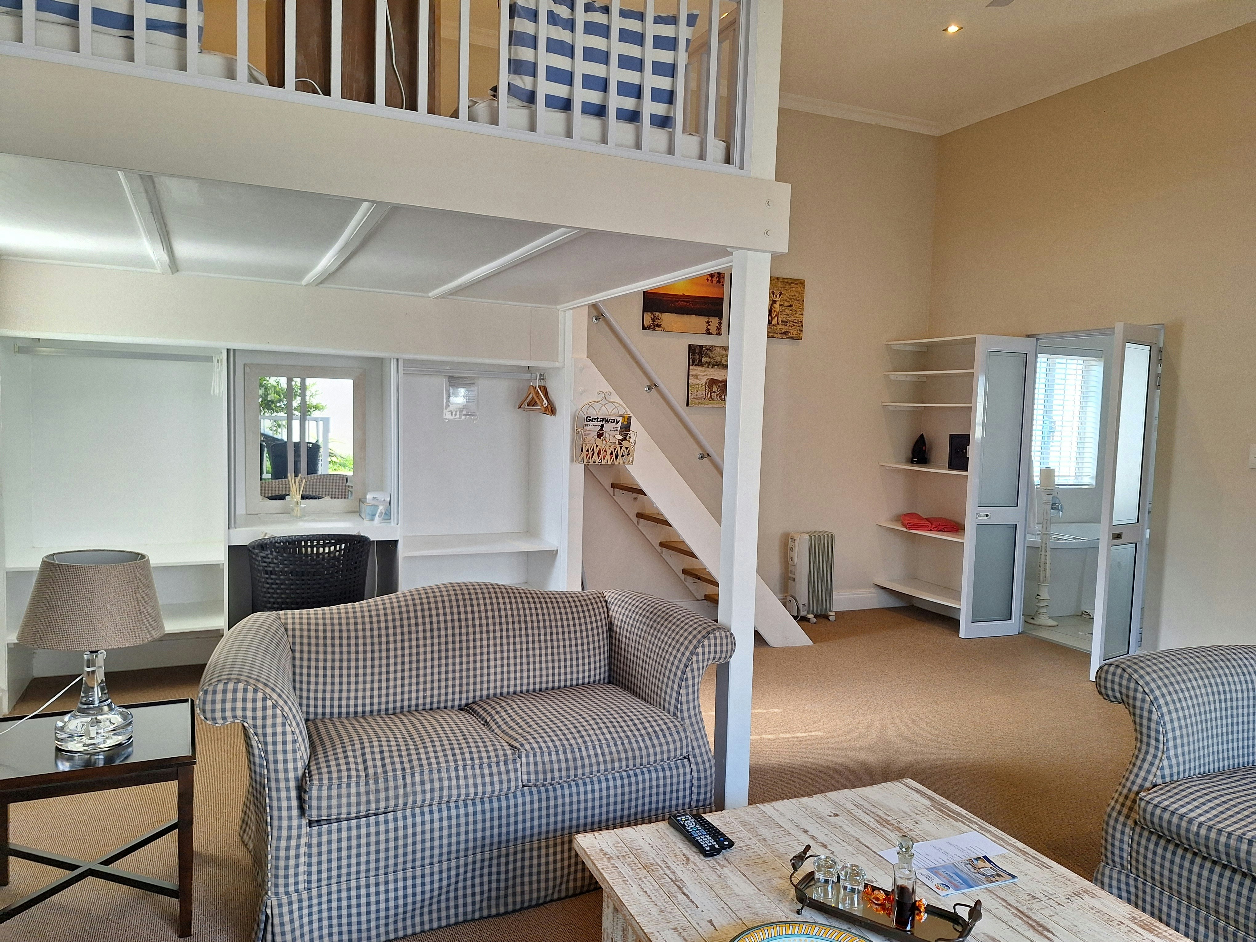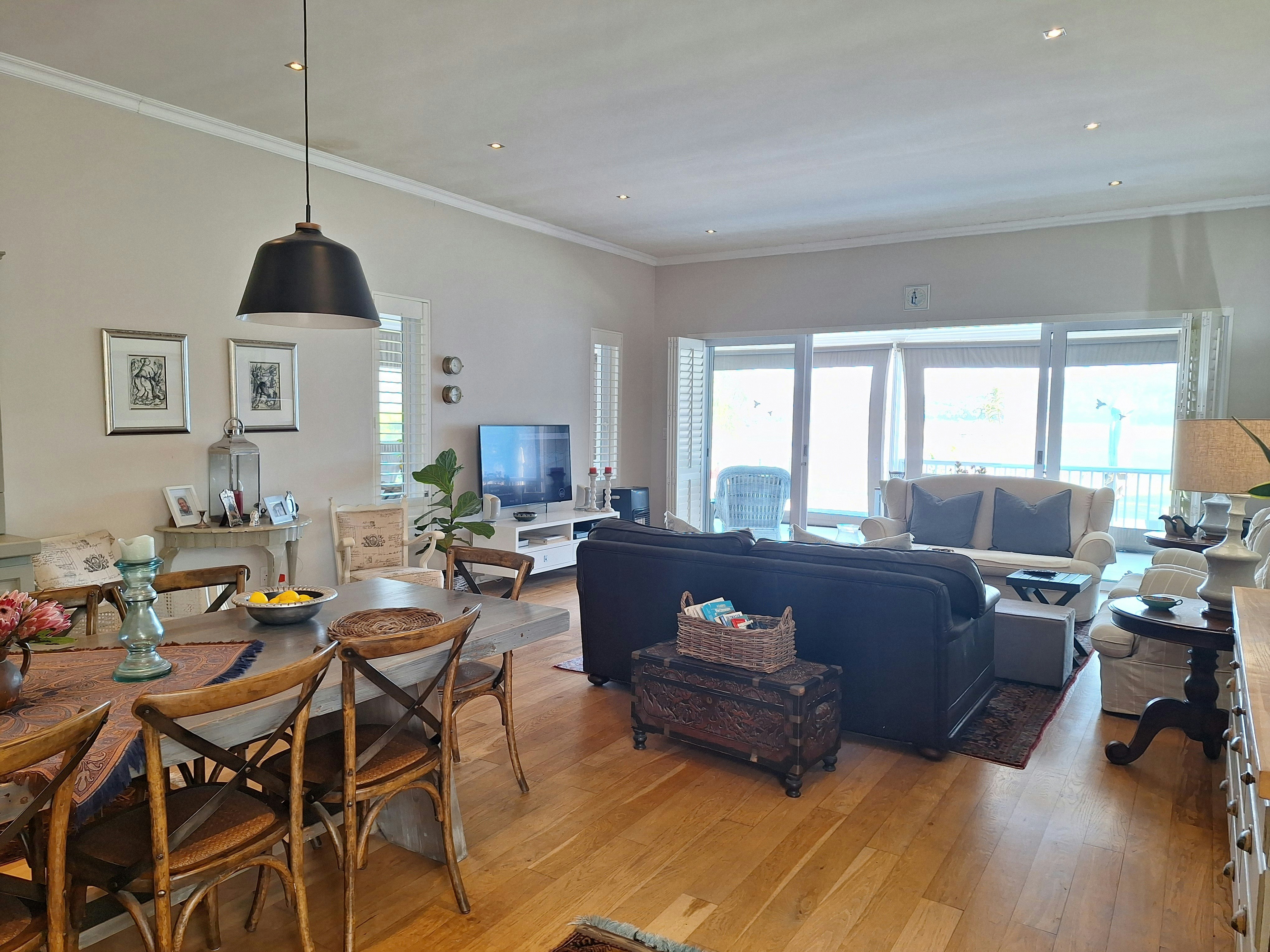 Die oopplankombuis lei na die leefarea en is met 'n yskas-vrieskas, mikrogolfoond, oond, gasstoof, eetgerei, breekware en tee- en koffiemaakgeriewe toegerus. In die leefarea is daar 'n etenstafel, gemaklike rusbanke en 'n TV met DStv en dit lei na 'n toegeboude stoep met sitplek, 'n etenstafel en 'n ingeboude braai.