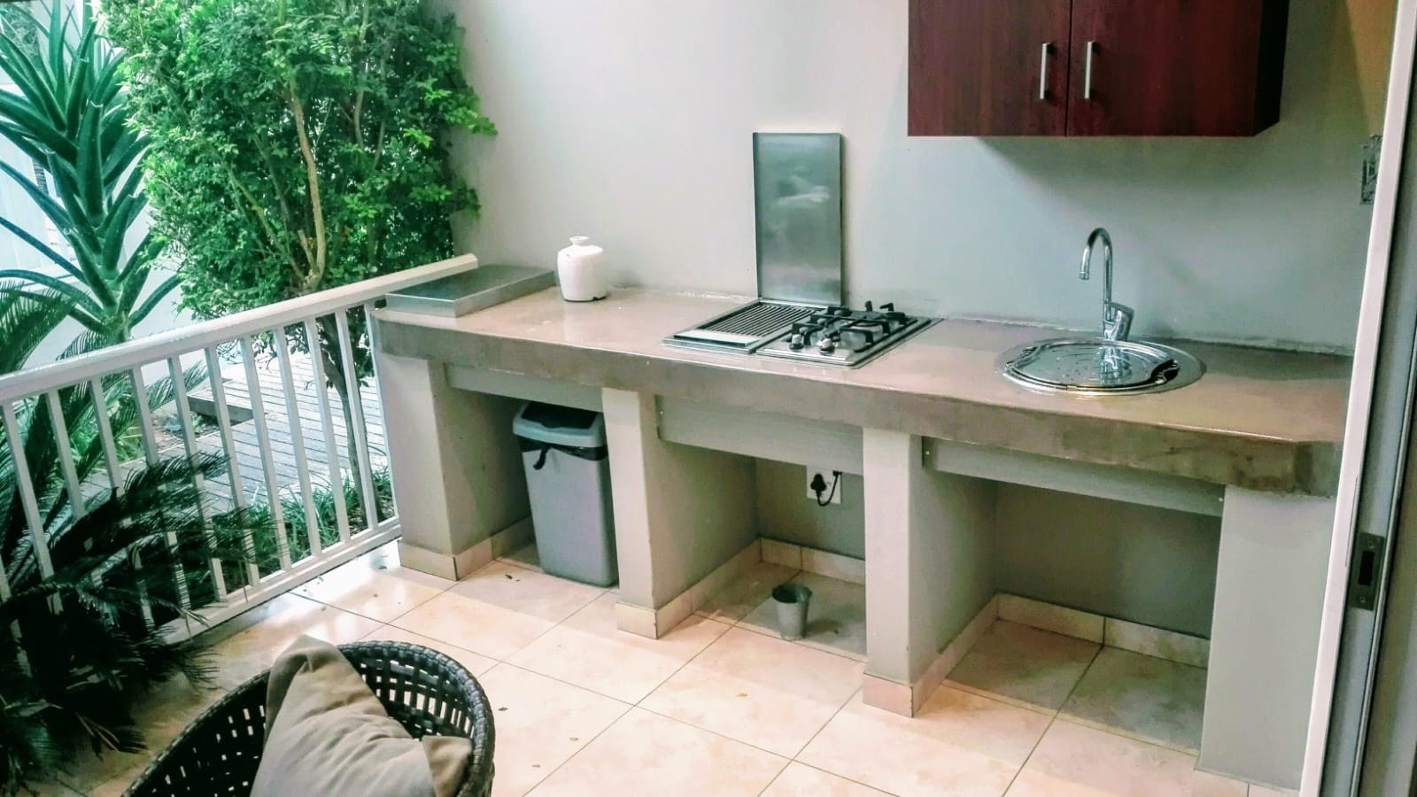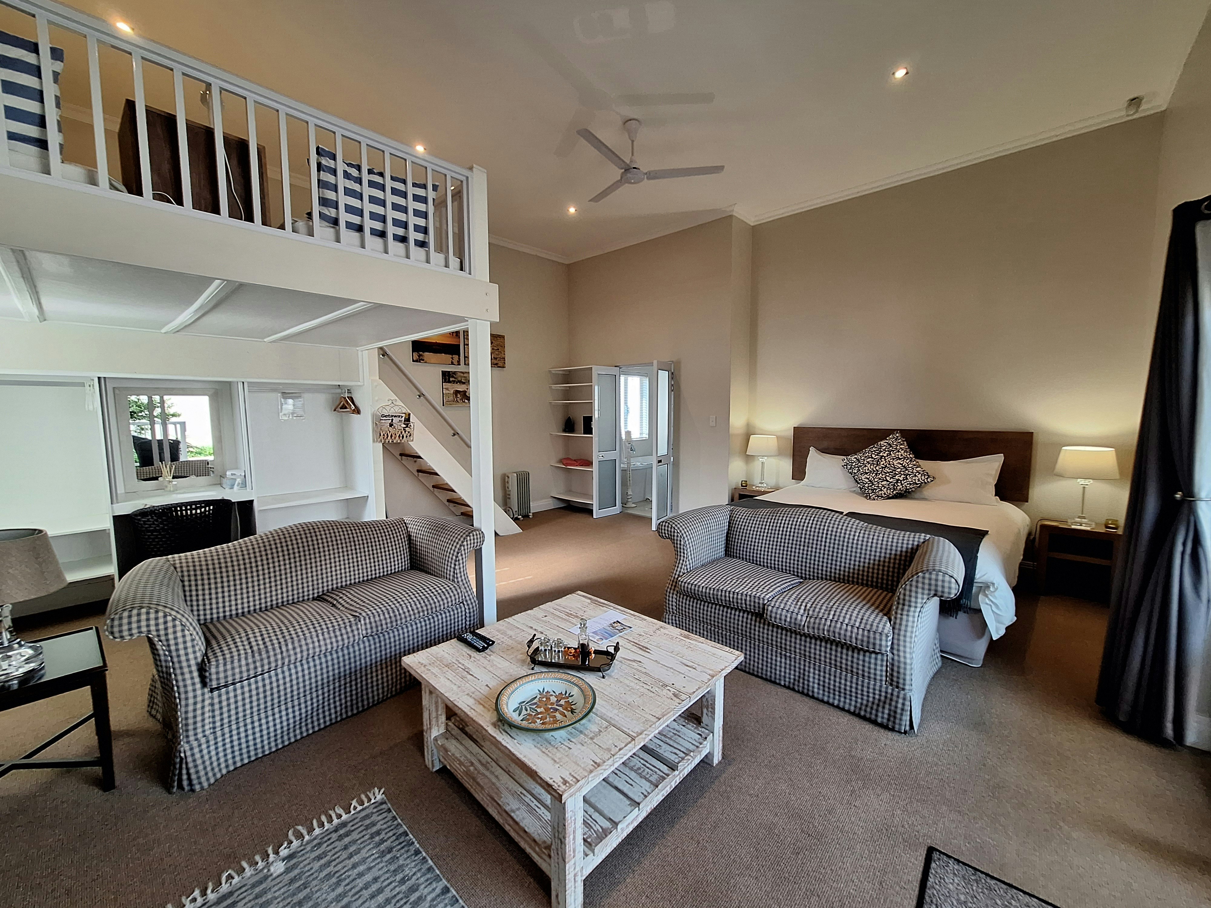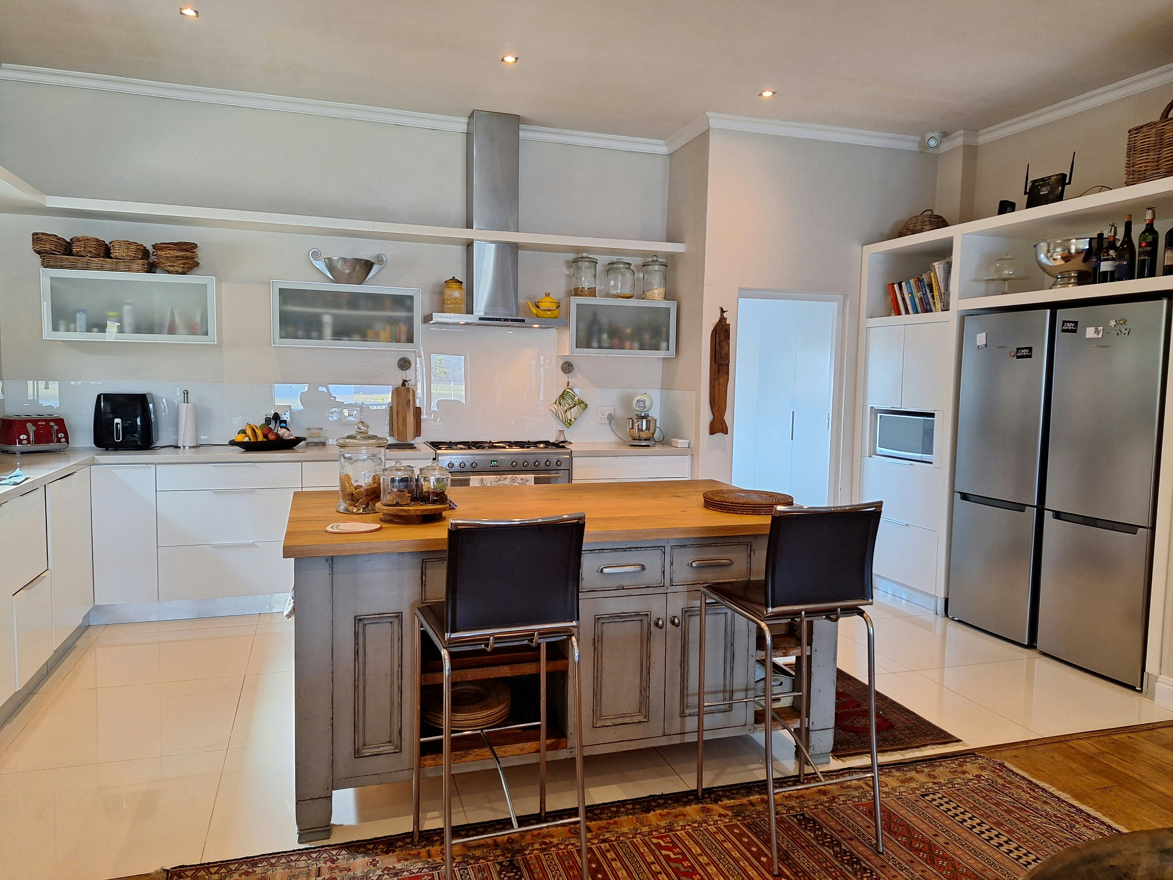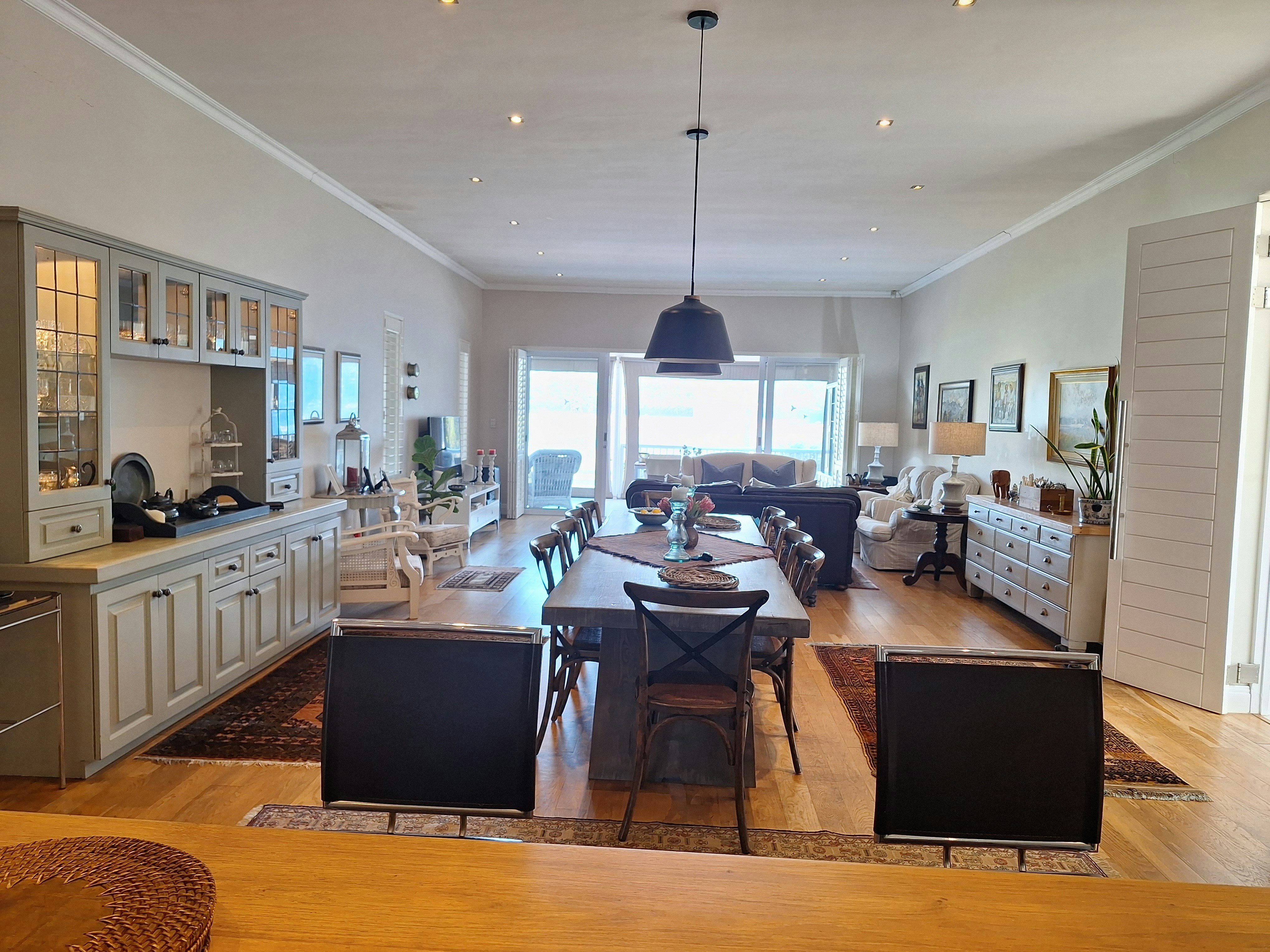 Die oopplankombuis lei na die leefarea en is met 'n yskas-vrieskas, mikrogolfoond, oond, gasstoof, eetgerei, breekware en tee- en koffiemaakgeriewe toegerus. In die leefarea is daar 'n etenstafel, gemaklike rusbanke en 'n TV met DStv en dit lei na 'n toegeboude stoep met sitplek, 'n etenstafel en 'n ingeboude braai.