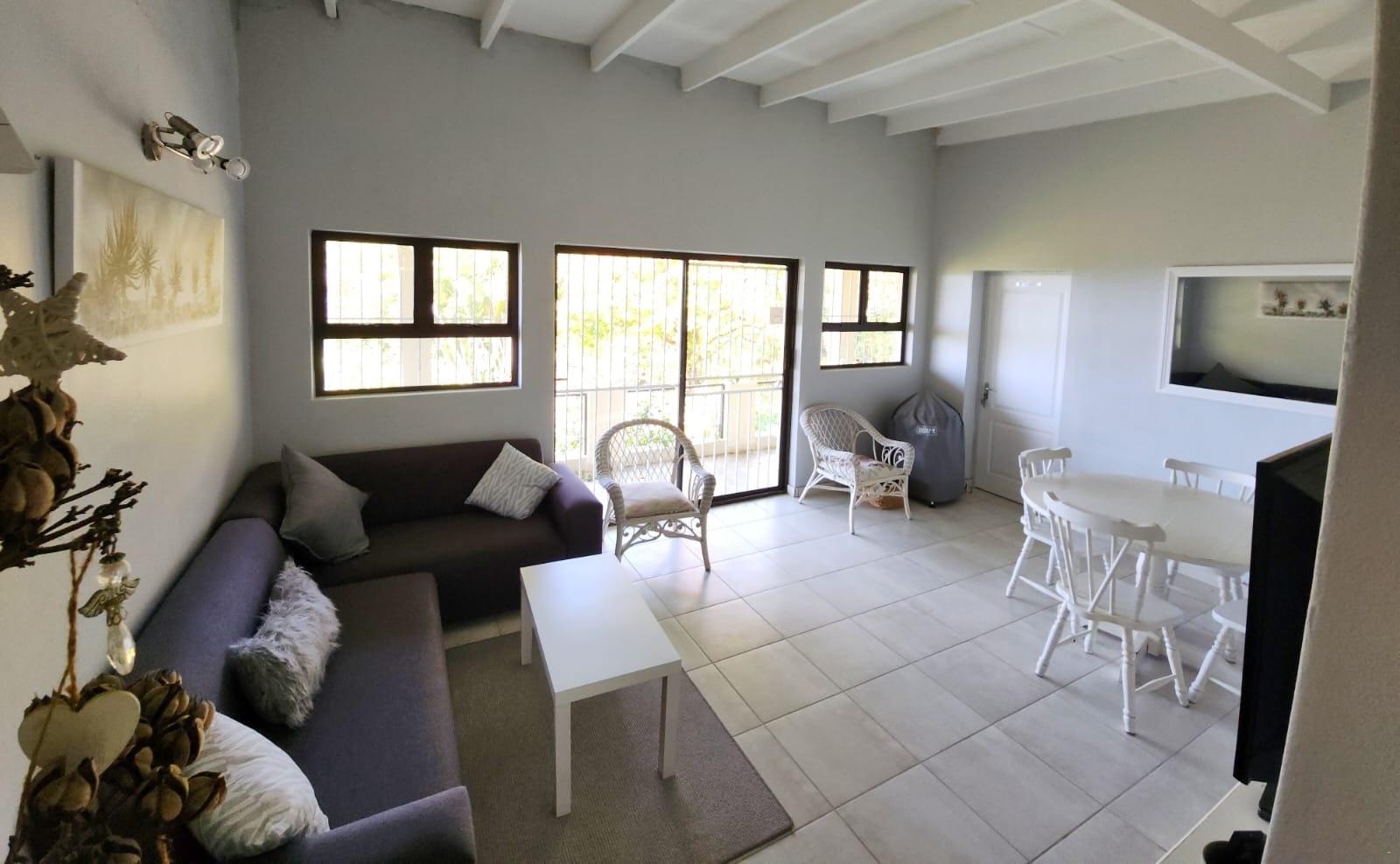 The living area features an open-plan design with a fully equipped kitchen, including a stove, oven, microwave, fridge-freezer, cutlery, and crockery. A 4-seater dining table adjacent to the kitchen is perfect for meals. The lounge area is furnished with comfortable seating and a TV.