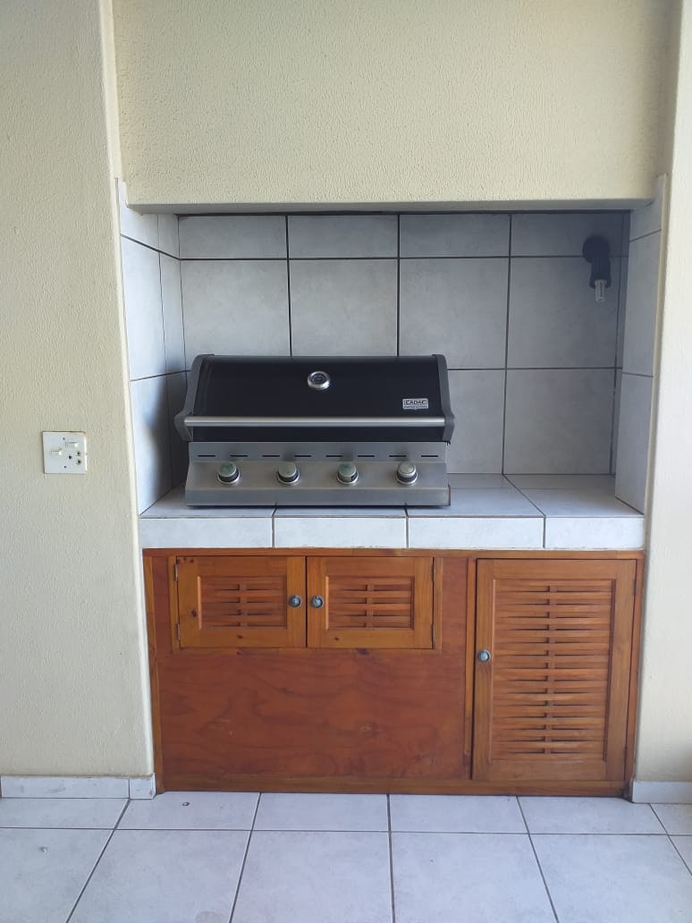 The kitchen is fully equipped for self-catering and includes a stove and oven, a fridge-freezer, a microwave, and a dishwasher. The dining area contains an 8-seater dining table and chairs. The lounge area features a TV. The living area opens through sliding doors to a covered balcony with outdoor dining furniture and braai facilities.