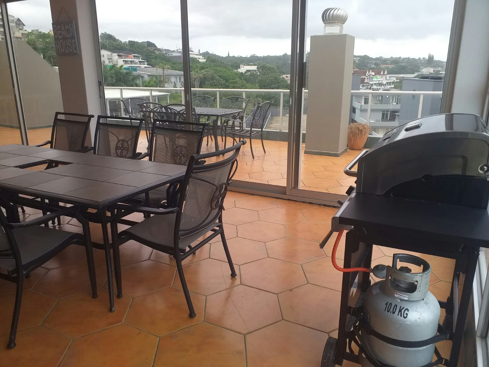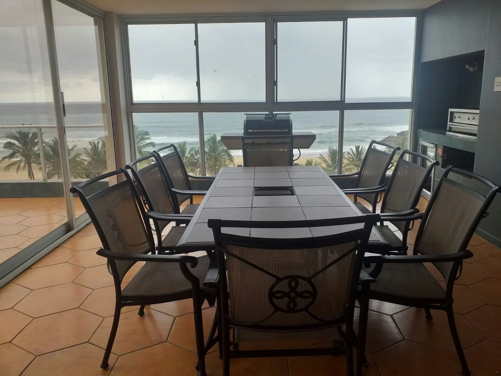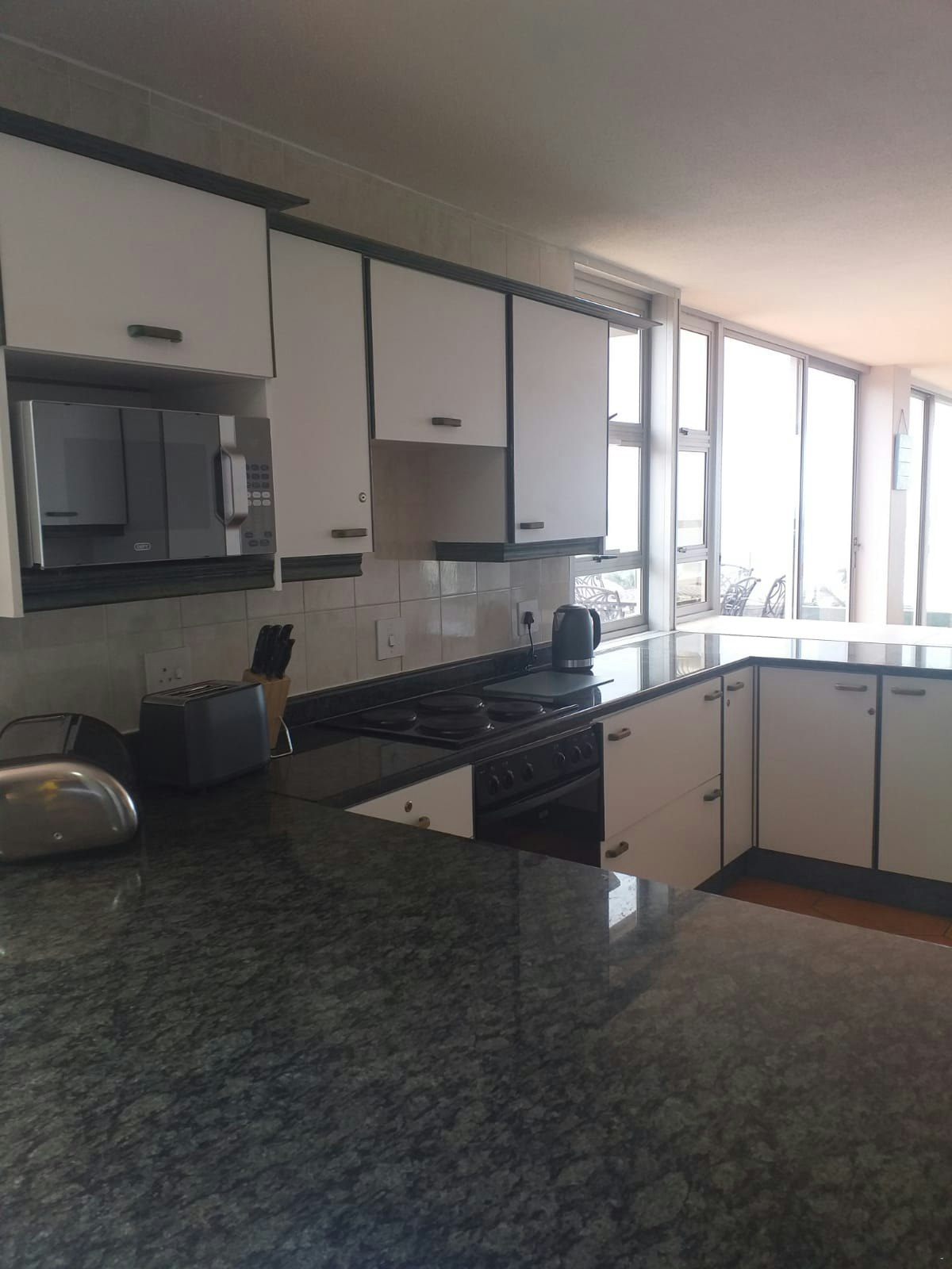 The kitchen is fully equipped for self-catering and includes a stove and oven, a fridge-freezer, a microwave, and a dishwasher, as well as a breakfast bar with stools. The lounge area contains a TV. The apartment features an enclosed balcony with an 8-seater dining table and chairs, and built-in braai facilities.