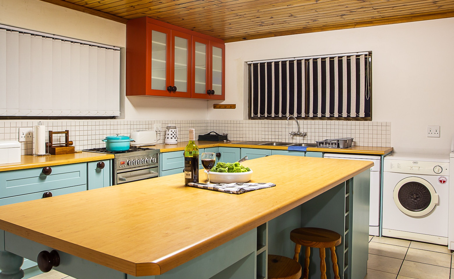 The house comprises 5 bedrooms and 4 bathrooms, 3 of which are en-suite. The bedrooms are equipped with either double or single beds and the bathrooms have a shower or bath with a basin and toilet. Linen and towels are provided. The kitchen, lounge and dining area are open-plan, and the kitchen includes facilities such as fridge-freezer and a microwave, a stove as well as a washing machine, tumble dryer and a dishwasher with other appliances.