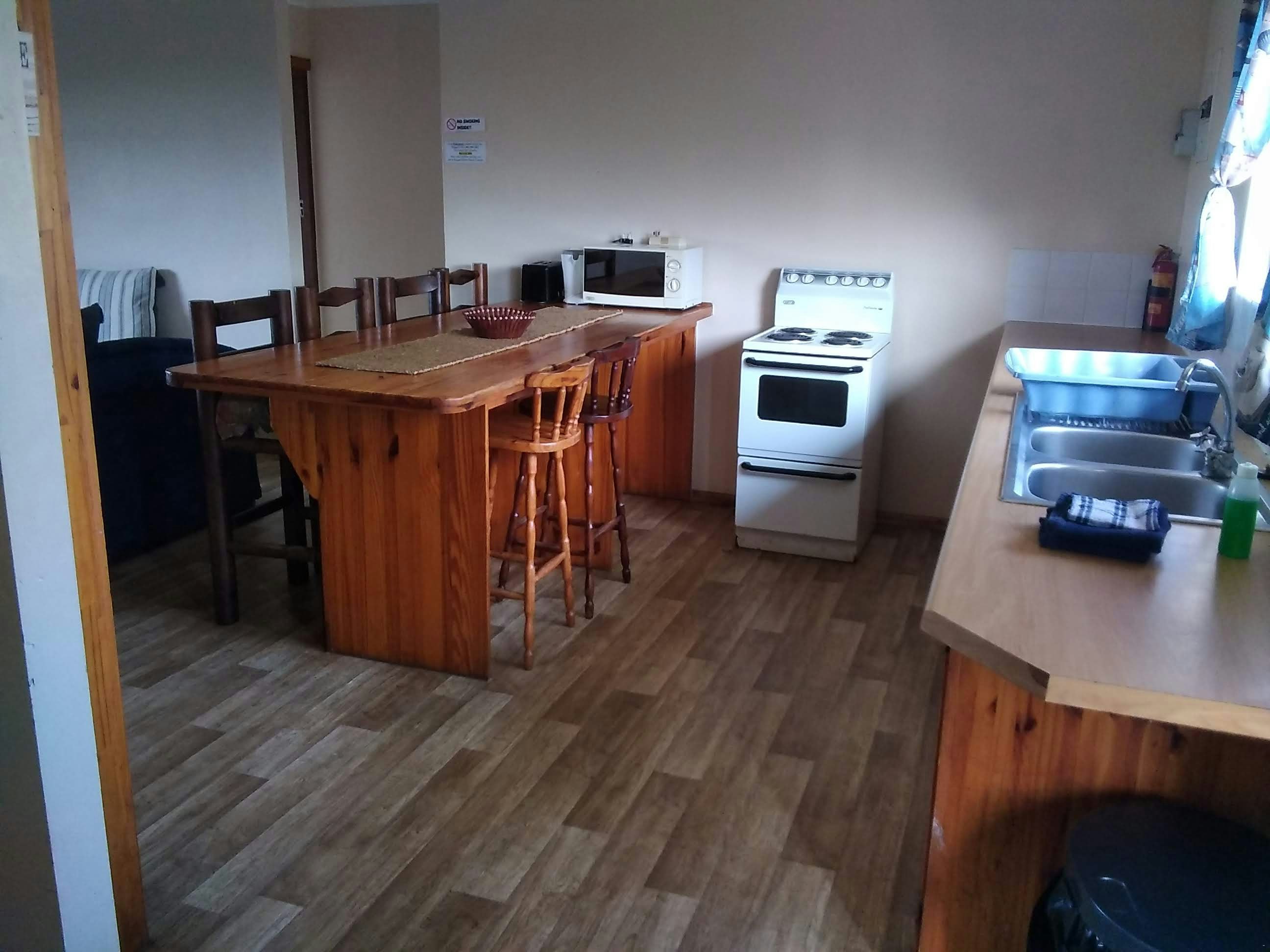 The open-plan living space features a dining area and a lounge furnished with comfortable couches and a TV. The kitchen is equipped with a fridge-freezer, stove, oven, and microwave. Guests are required to bring their own beach and bath towels. Braai facilities are available.