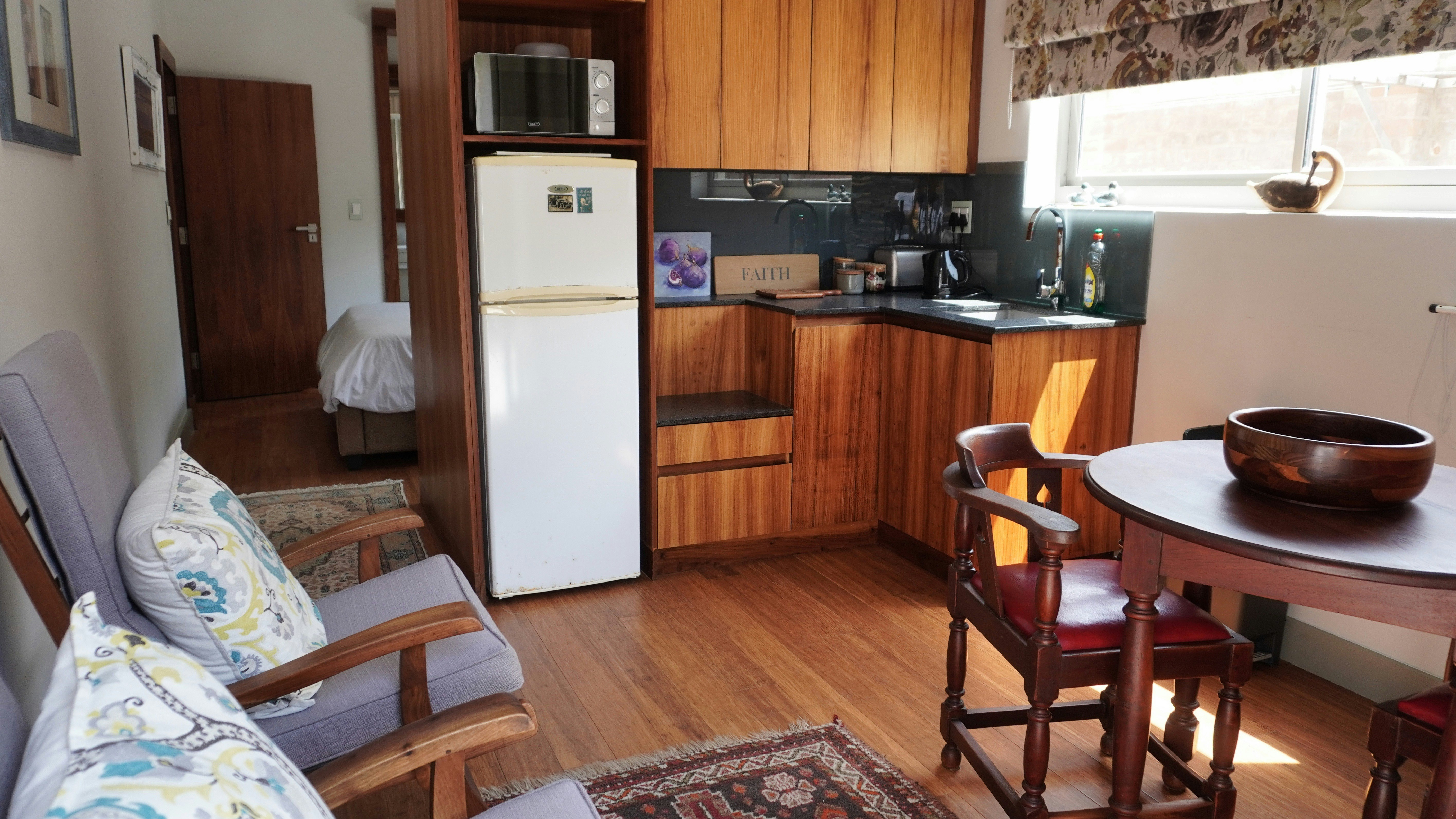 The kitchen is equipped with a fridge-freezer, microwave oven, gas stove, cutlery, crockery, and tea- and coffee-making facilities. The living area includes a fireplace, a dining table, and comfortable seating.
