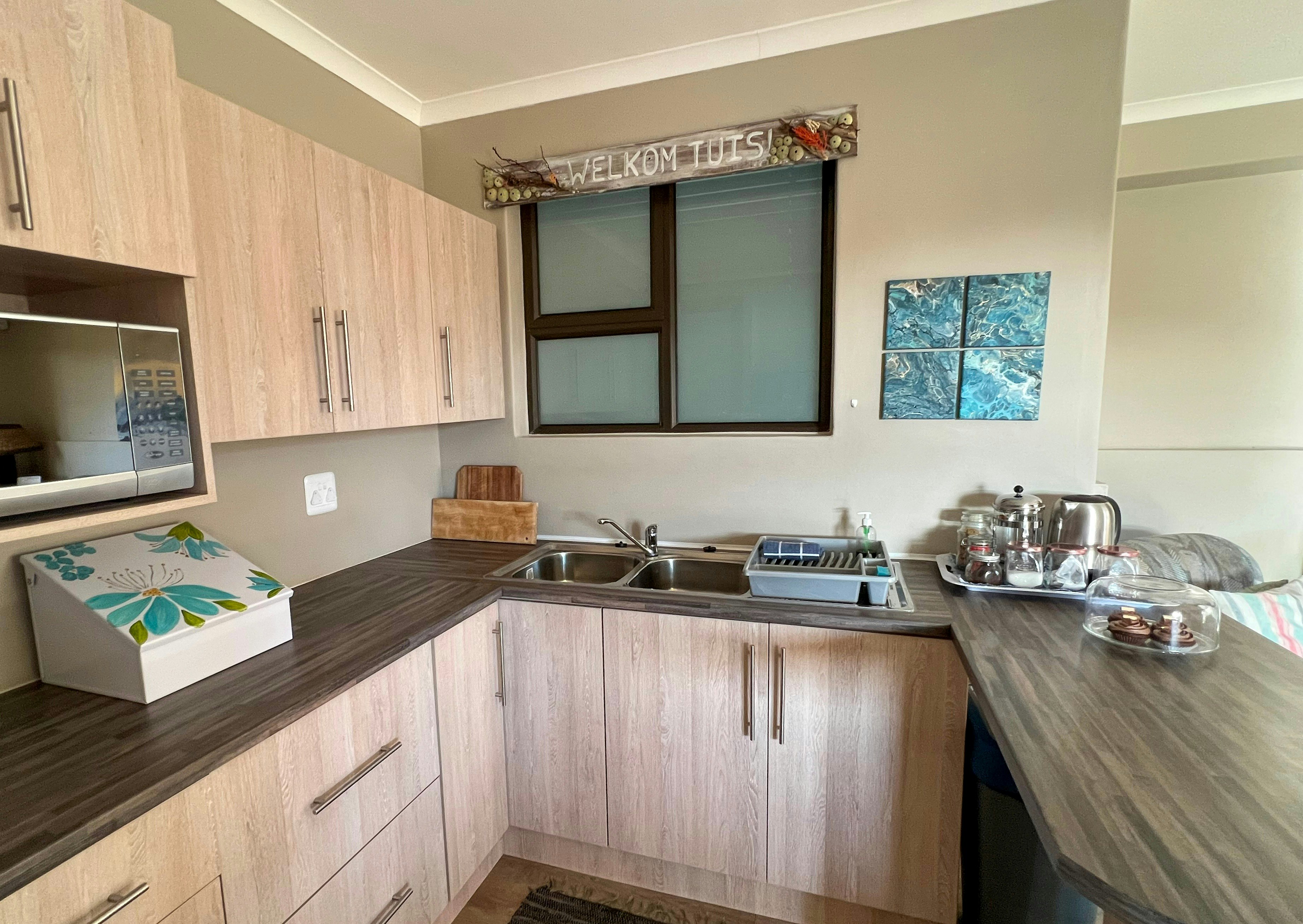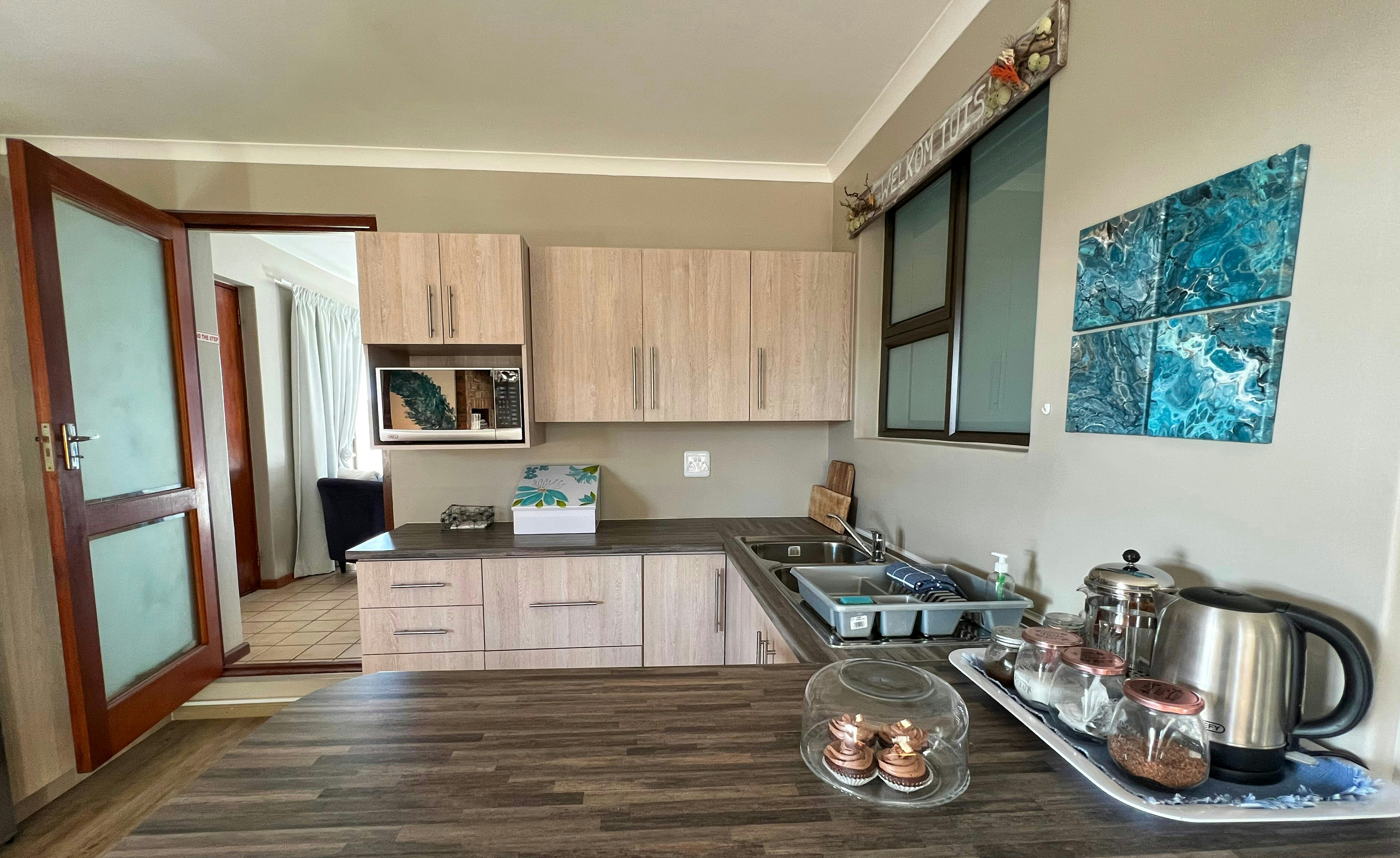 Die helder en lugtige leefarea beskik oor 'n volledig toegeruste kombuis met 'n yskas-vrieskas, gasstoof, elektriese oond, mikrogolfoond, eetgerei, breekware, en tee- en koffiemaakgeriewe, saam met 'n ontbyttoonbank en stoele. Langs die kombuis bied die sitkamer gemaklike sitplek, 'n muurgemonteerde TV met 'n volledige reeks DStv-kanale, en komplimentêre WiFi.