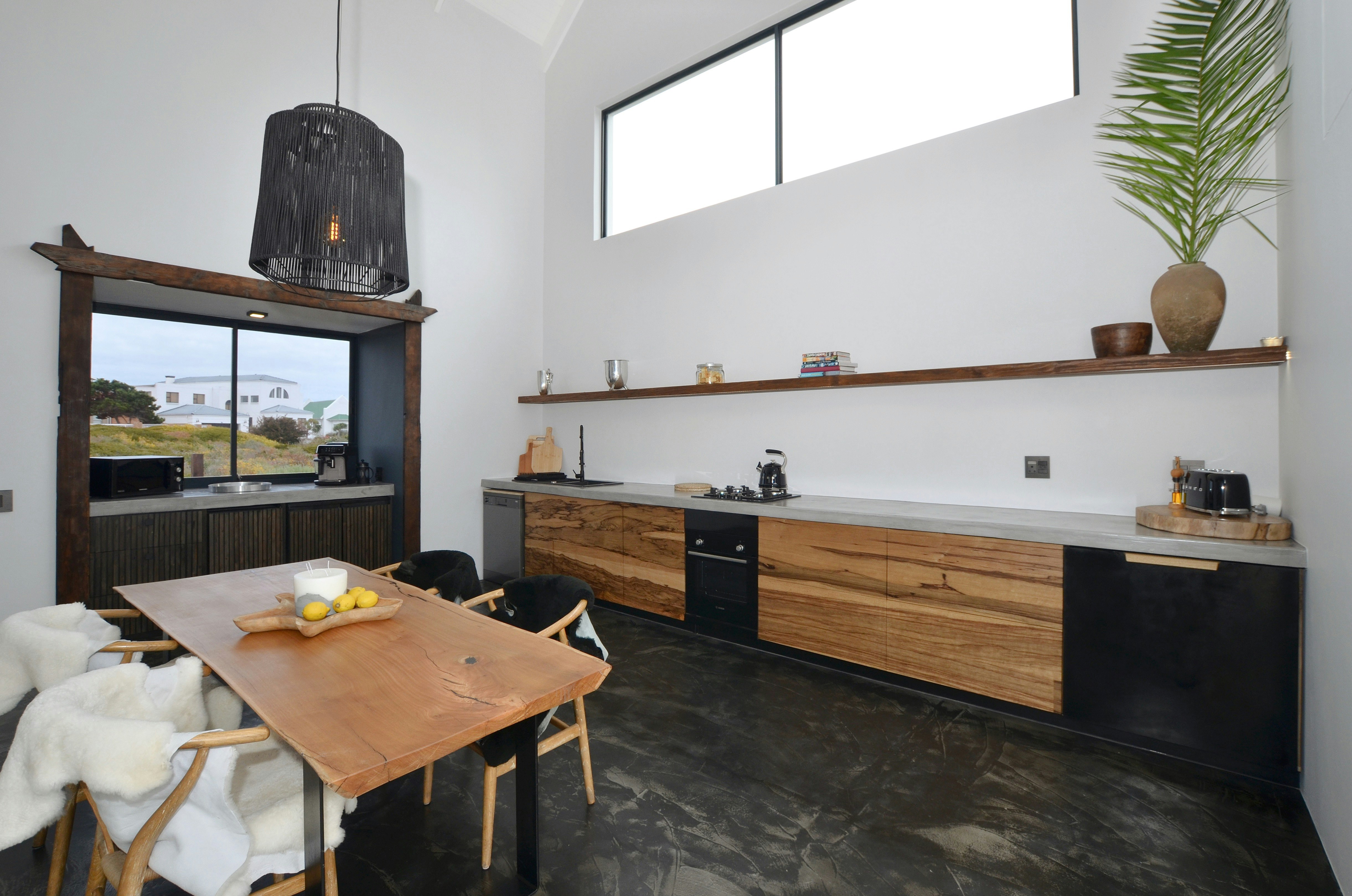 Die ruim oopplan-kombuis is toegerus met 'n yskas-vrieskas, gasstoof, oond, mikrogolfoond, eetgerei en breekware, tee- en koffiemaakgeriewe en 'n etenstafel. 'n Skottelgoedwasser is beskikbaar vir ekstra gerief. Die leefarea is ingerig met gemaklike rusbanke en 'n kaggel. Toegang tot WiFi is beskikbaar.