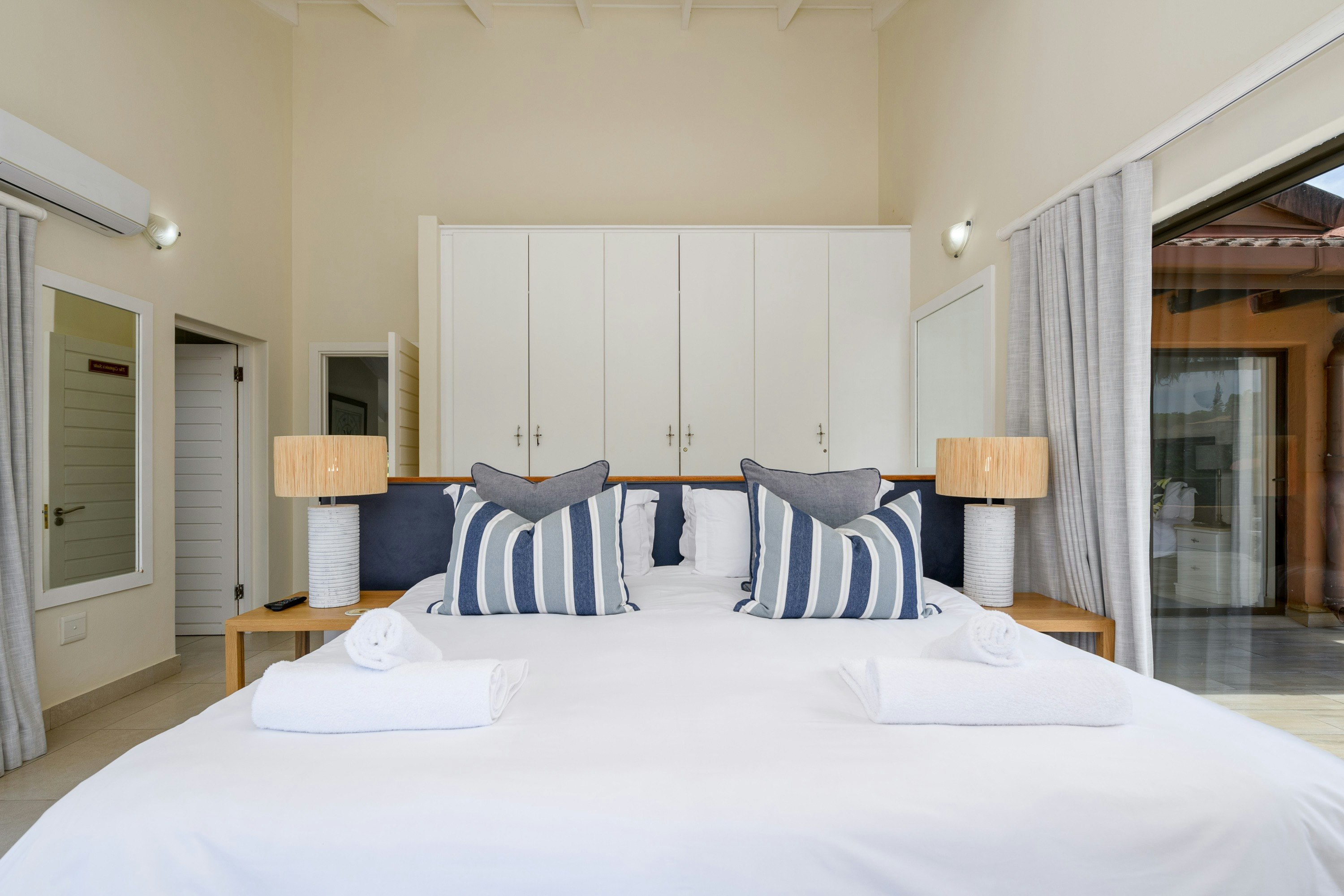 Dié tripelverdieping-villa het lugversorging en bied slaapplek aan 8 gaste. Dit beskik oor 4 slaapkamers en 3 badkamers. Die hoofslaapkamer het 'n super koninggrootte-bed en die en suite-badkamer het 'n stort en bad. Die tweede slaapkamer het 'n koninggrootte-bed en 'n en suite-badkamer met 'n stort en 'n bad. Daar is 4 enkelbeddens in die ander 2 slaapkamers. Elke slaapkamer bied direkte toegang tot die balkon wat met 'n uitsig oor die landgoed spog. Linne en badhanddoeke word voorsien, maar gaste moet asb. hul eie swemhanddoeke saambring. Die vyfde slaapkamer is langs die villa en het 'n koningingrootte-bed en 'n privaat badkamer.