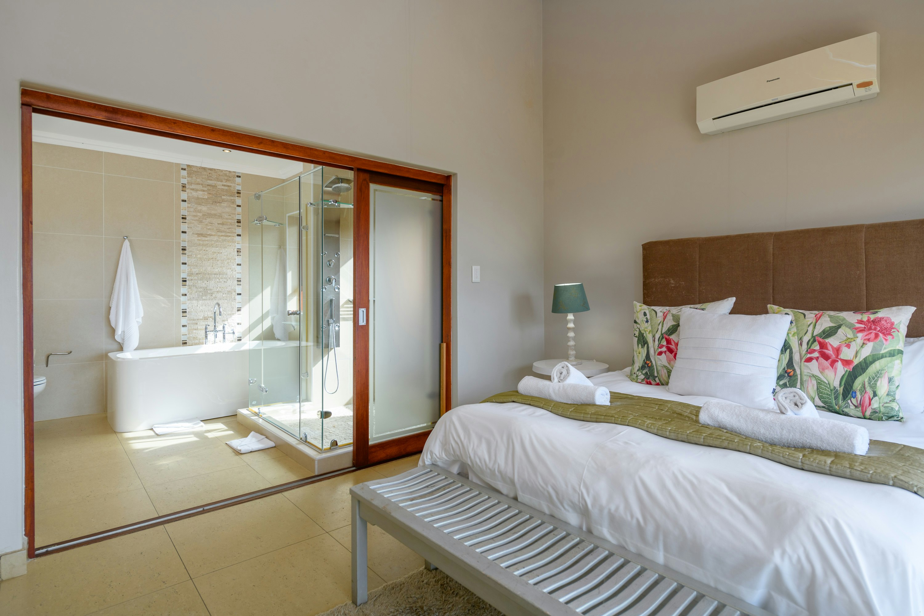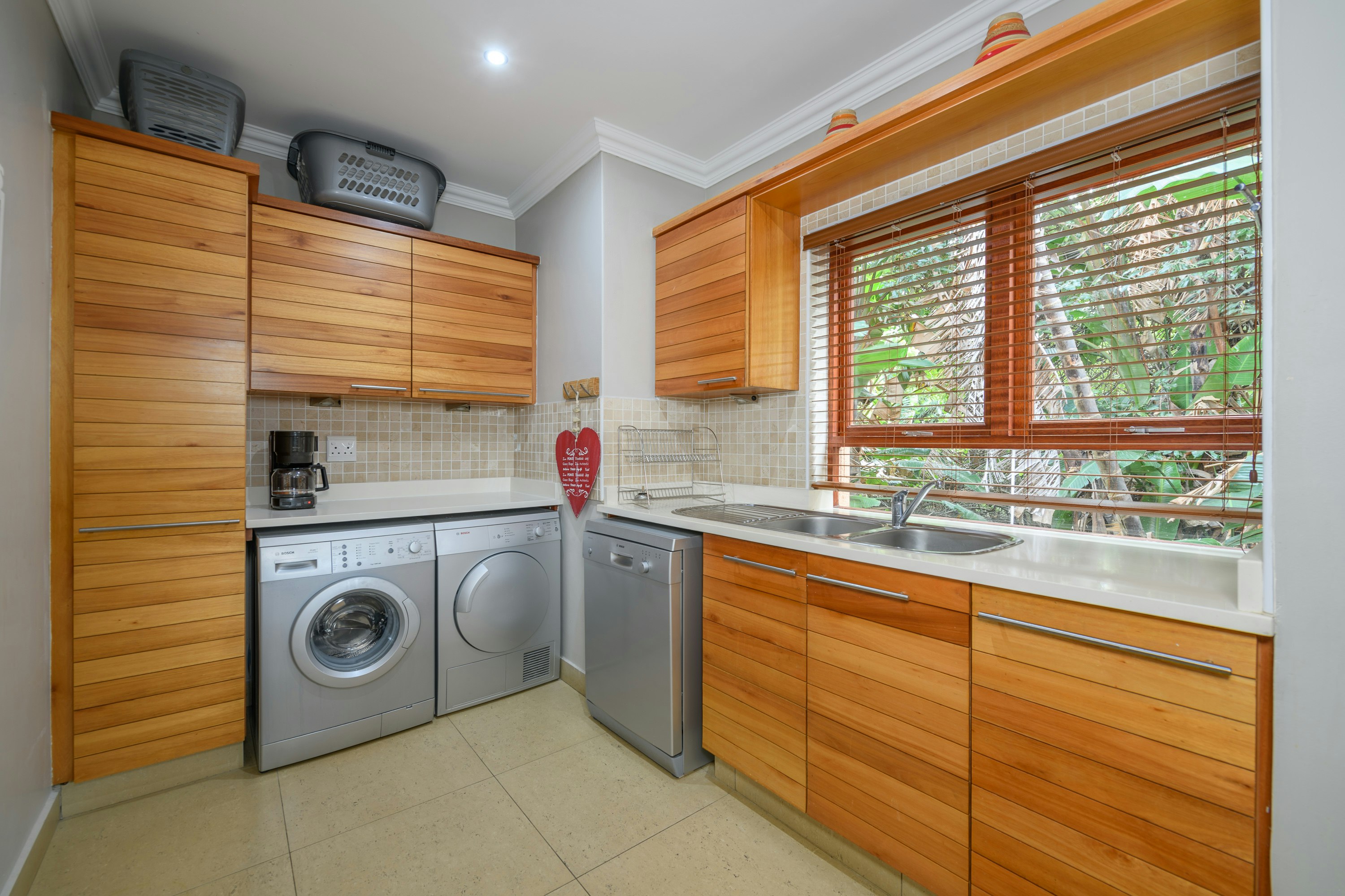 The kitchen is fully equipped for self-catering and contains a stove, oven, fridge-freezer, microwave, and cutlery and crockery. There is also a dishwasher, a washing machine and a tumble-dryer provided. The dining area has seating space for 8 people, while the lounge has a comfy lounge suite and a flat-screen TV with selected DStv channels and a DVD player.