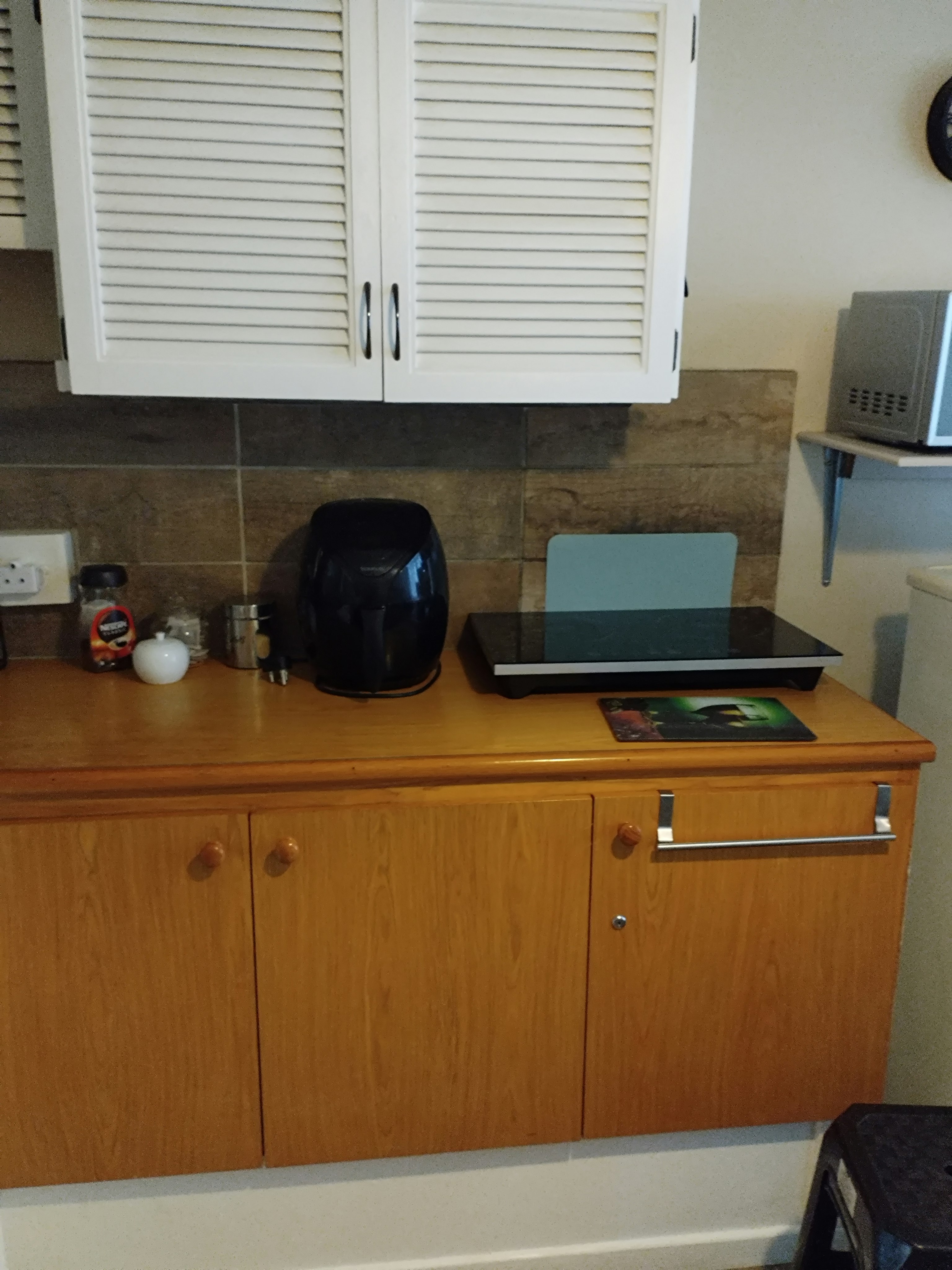 Die kombuis is toegerus met 'n tweeplaat-induksiestoof, mikrogolfoond, yskas, lugbraaier, tee- en koffiemaakgeriewe, eetgerei en breekware. Die kombuis het ook 'n tafel met 4 stoele wat buite by die braai gebruik kan word. Die sitkamer is gemeubileer met 'n slaapbank vir 2 kinders of 1 volwassene en 'n TV.