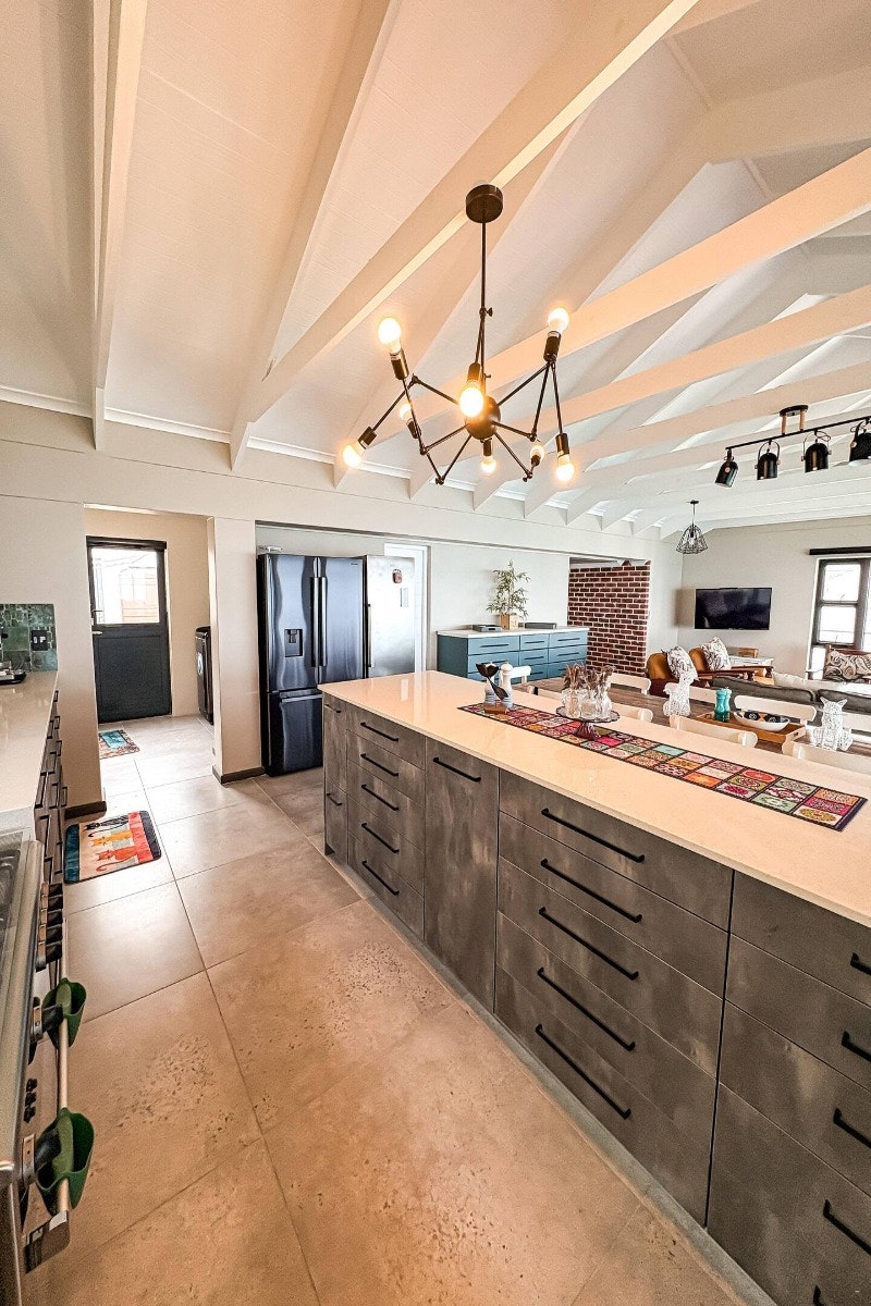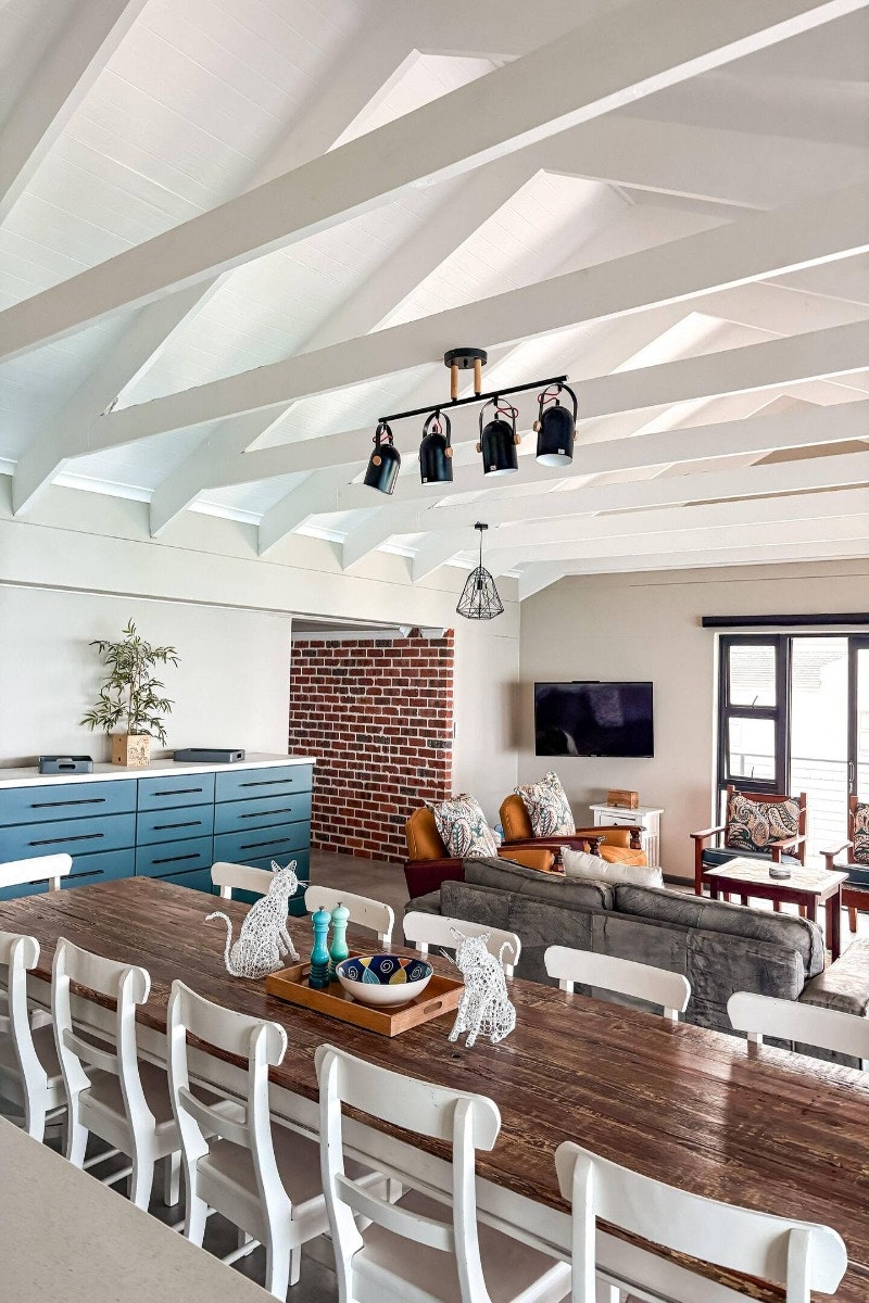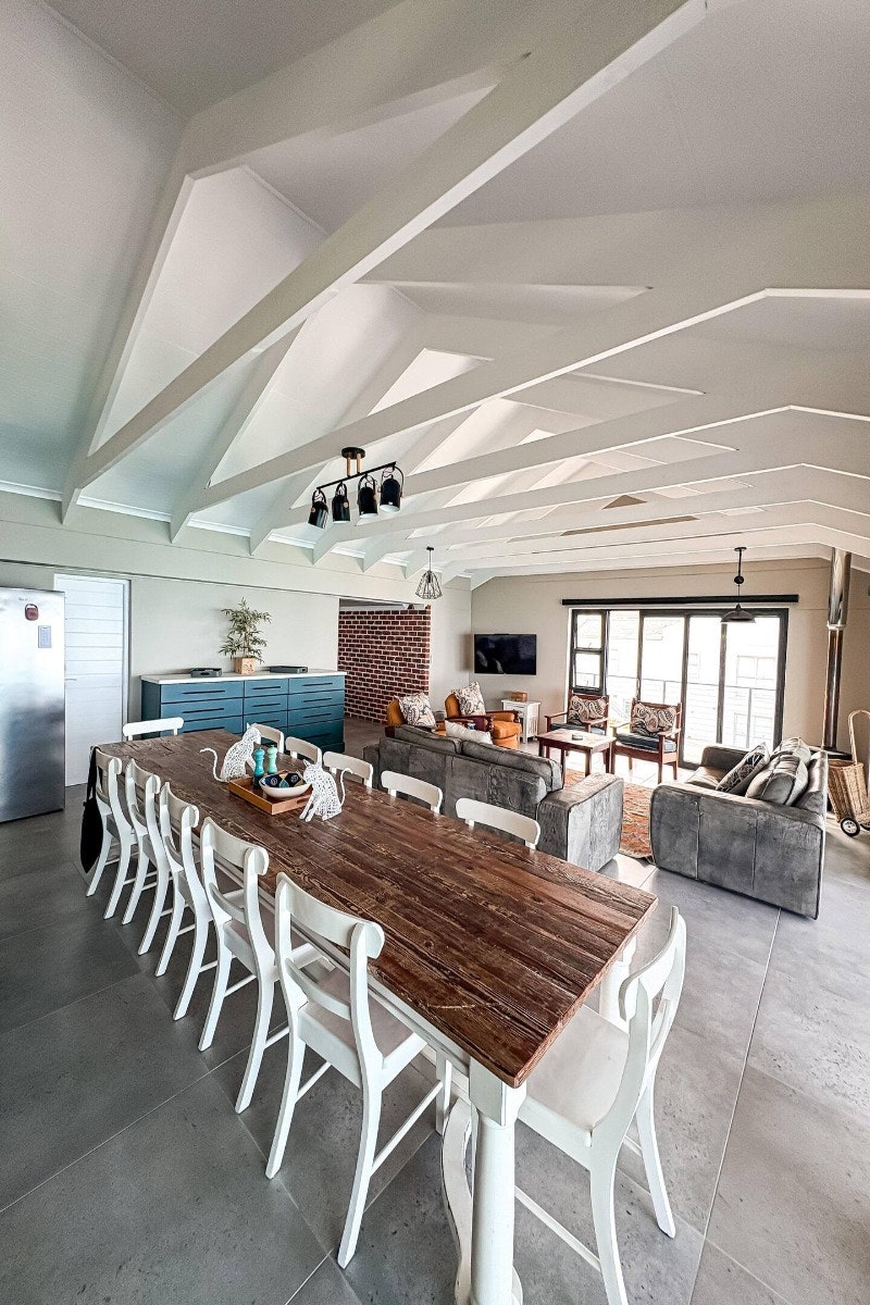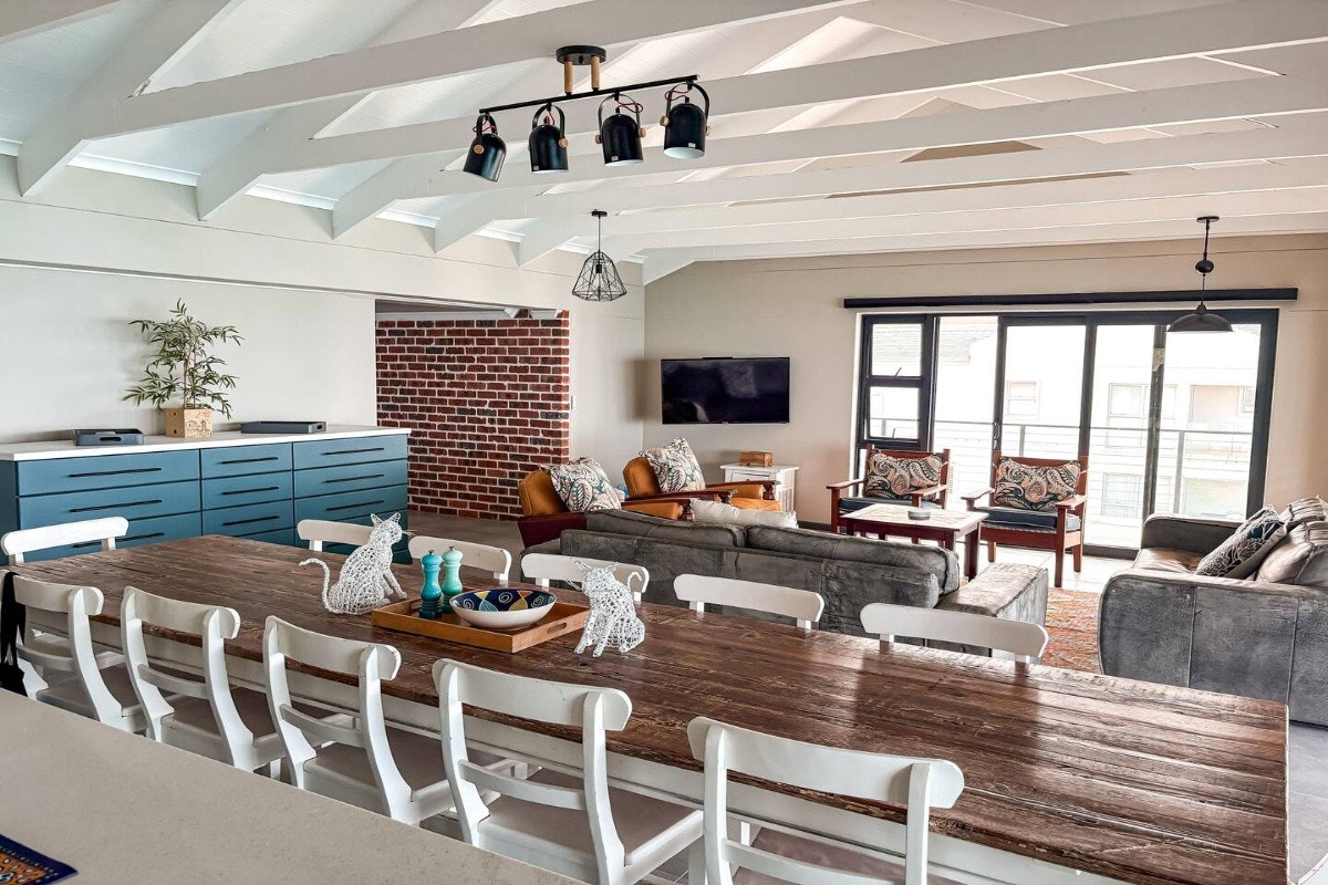 Die ruim oopplan-leefarea sluit 'n moderne kombuis in wat toegerus is met 'n yskas-vrieskas, gasstoof, oond, mikrogolfoond, eetgerei en breekware, en tee- en koffiemaakgeriewe. 'n Skottelgoedwasser is ook in die opwaskamer beskikbaar vir ekstra gerief. Aangrensend aan die kombuis is 'n eetkamertafel met 12 sitplekke wat moeiteloos in die gemaklik gemeubileerde sitkamer vloei, kompleet met 'n slim-TV met stromingsdienste en asemrowende see-uitsigte. Gratis WiFi is ook beskikbaar.