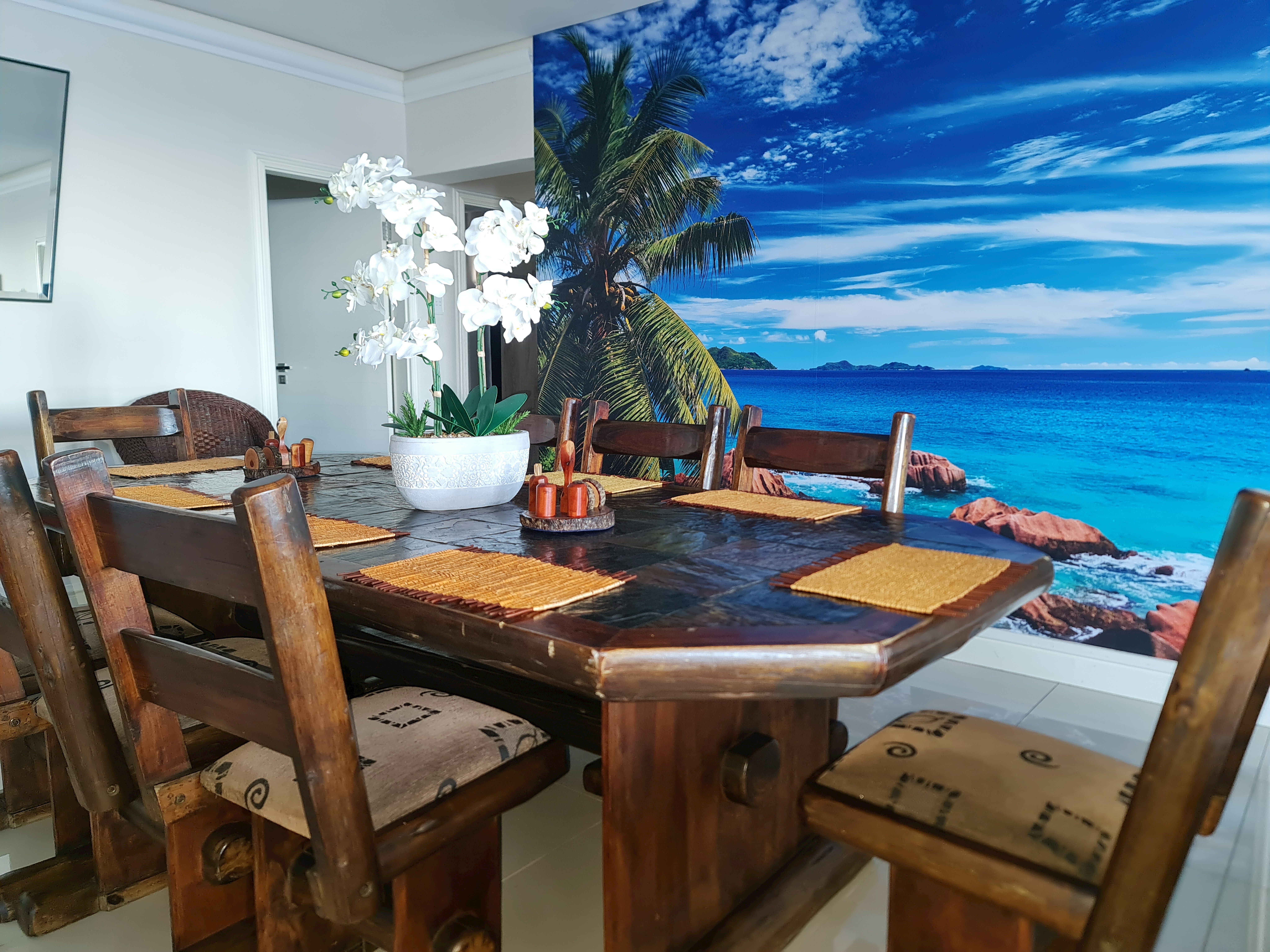 Buite is 'n groot balkon met 'n eetstel waar gaste ook die see-uitsig kan geniet.