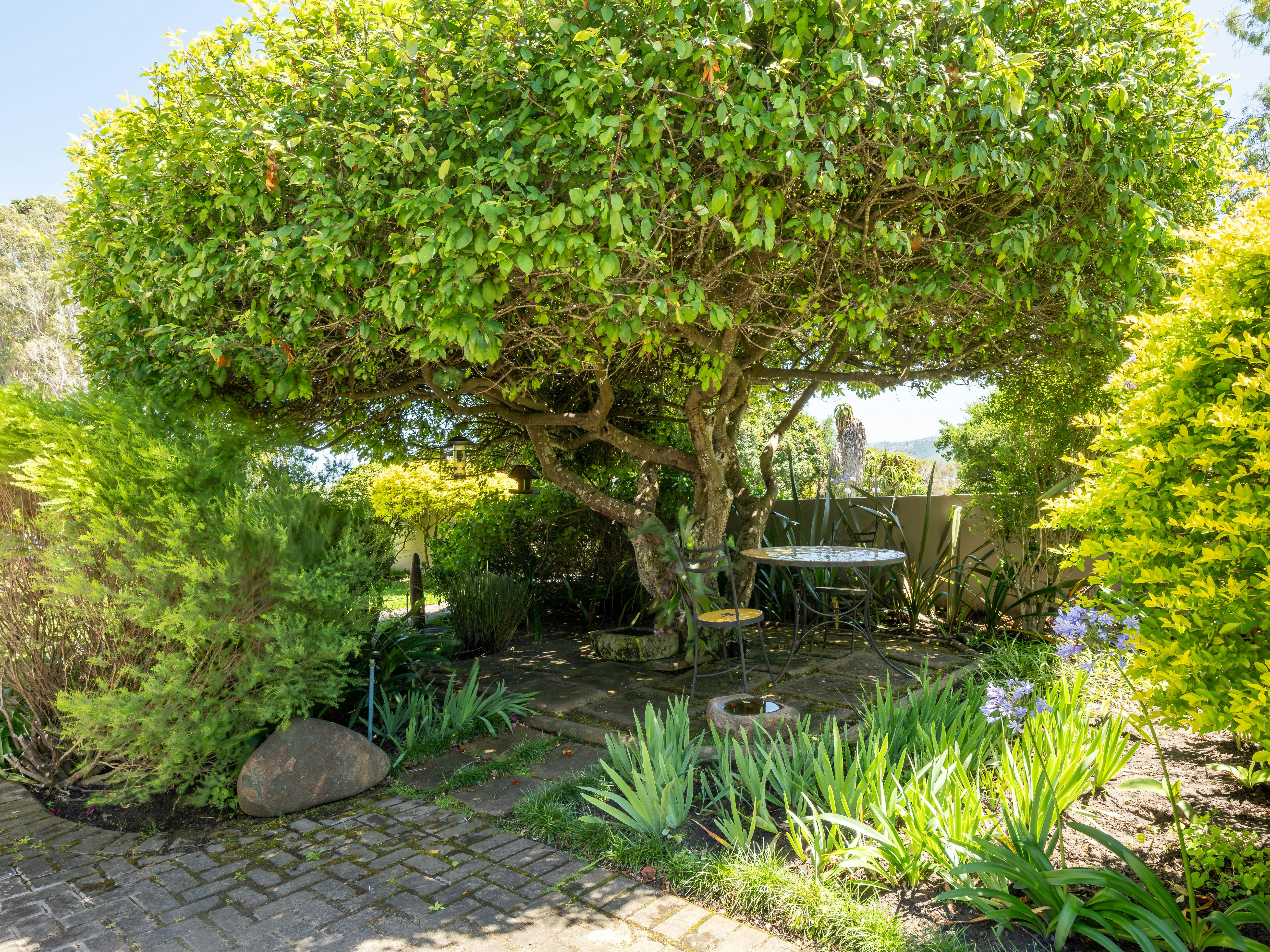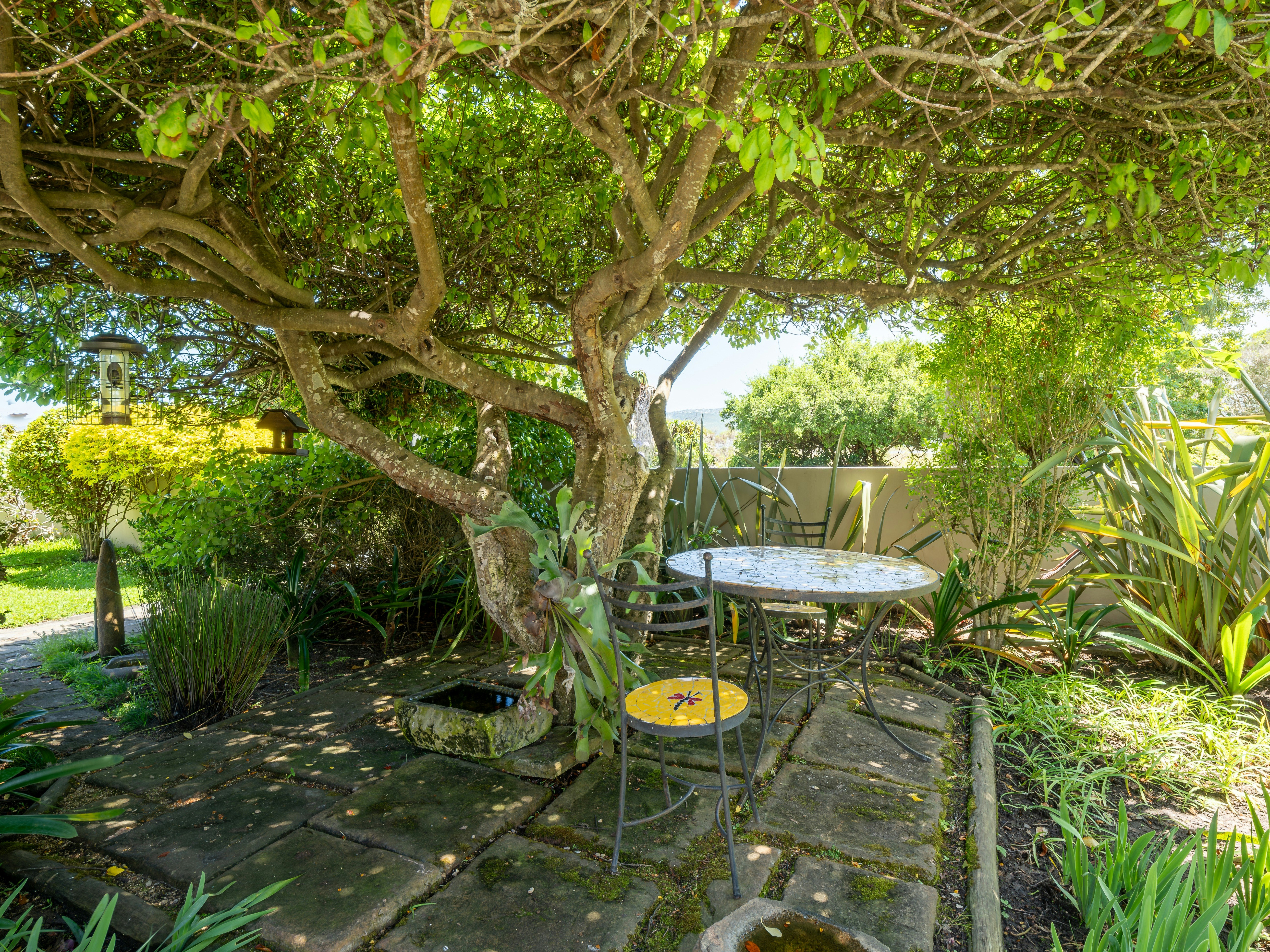 Die leefarea lei na 'n oordekte patio met buitesitplek en draagbare braaigeriewe met uitsig oor die tuin. Gaste kan ontspan en 'n rustige stap na die rustige strandmeer geniet. Veilige parkering op die perseel is beskikbaar. Nabygeleë besienswaardighede sluit in Bollard Bay-strand, Knysna Heads, Pezula Gholfklub en die Knysna-woud.