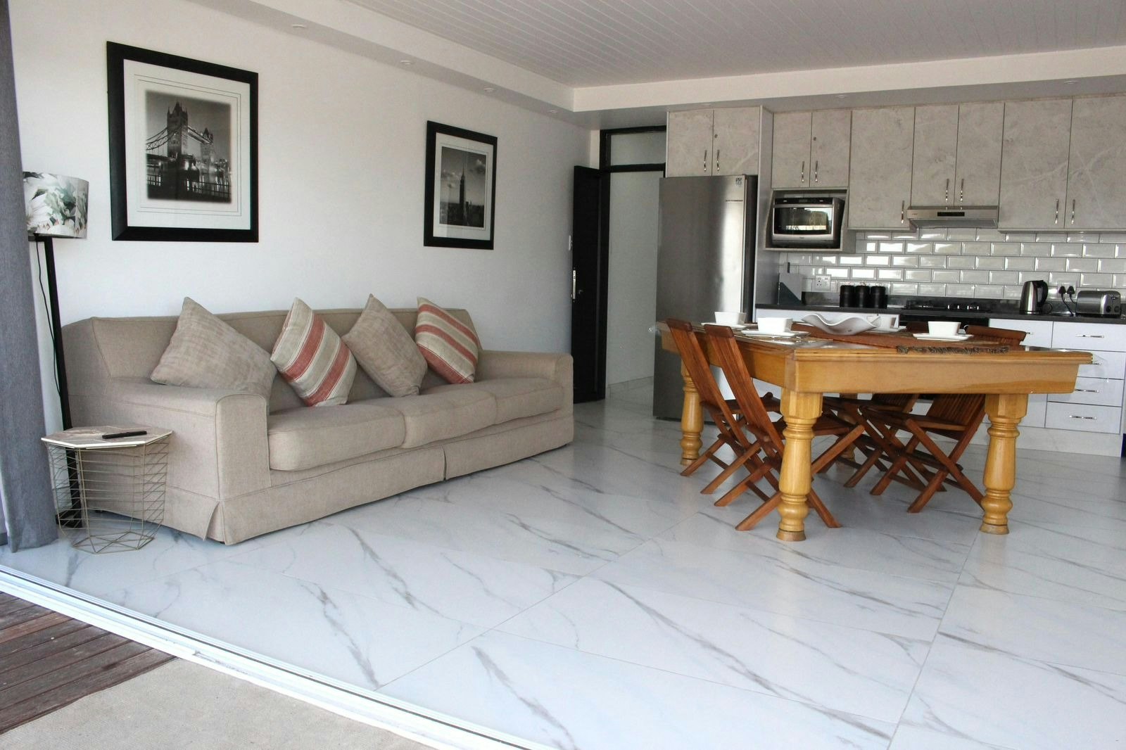 Die leefarea lei na die onderdakbalkon met 'n etenstafel en 'n onbelemmerde see-uitsig. Daar is parkeerplek in die motorhuis. Die verblyf is naby winkels en restaurante. Gordonsbaai se hoofstrand is net 100 m vanaf die verblyf.