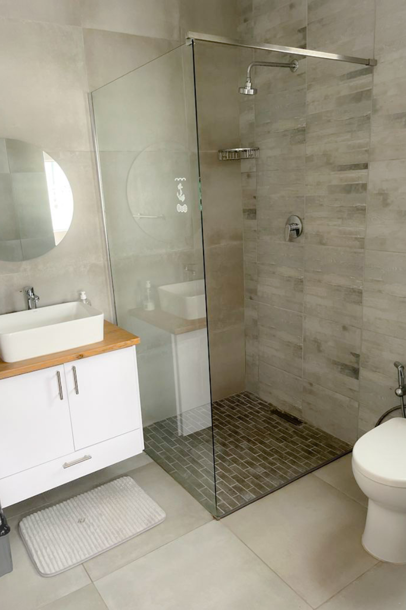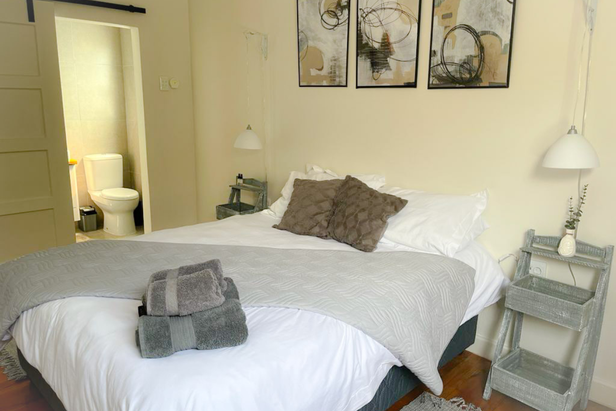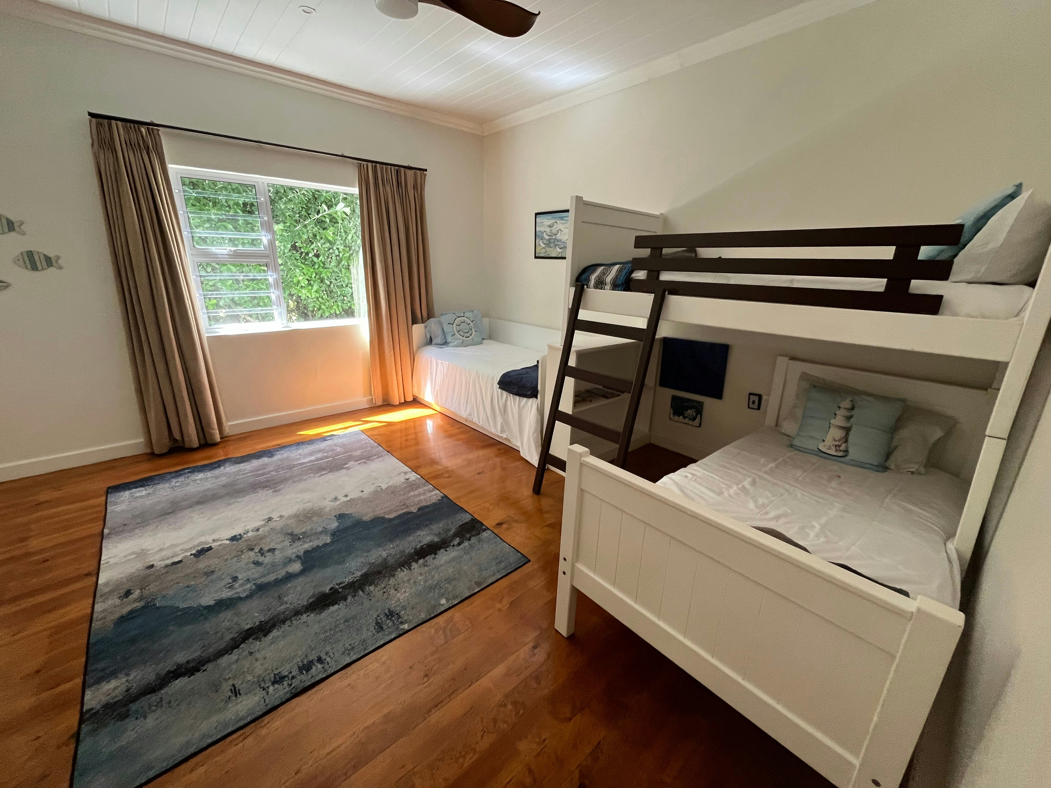 The main and second bedrooms have queen-size beds and en-suite bathrooms with showers, basins, and toilets. The third bedroom has a king-size bed with an en-suite bathroom equipped with a shower, basin, and toilet. The fourth bedroom is perfect for children and has a three-quarter bed and a unique bunk bed arrangement suitable for small children under the age of 5. The bathroom, across from the 4th room has a bath, basin, and toilet.
